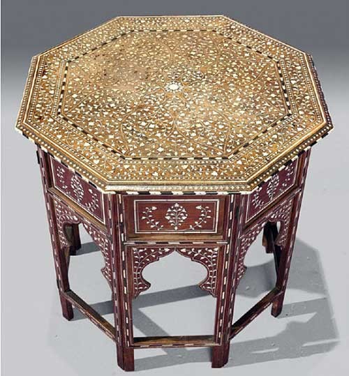В основе мебельных конструкций преобладали архитектурные элементы, такие как остроконечные навершия, подковообразные или луковичные аркады. В отделке преобладал цветной мрамор, мозаика, резьба по кости и инкрустация перламутром. Декор мебели отличался пышностью и эффектными цветовыми контрастами. Мастера искусно вплетали в орнамент цитаты из священных писаний, цитаты из Корана. А порой это была стилизованная письменность - «арабская вязь» - которая великолепно сочеталась с цепью геометрических растительных узоров.