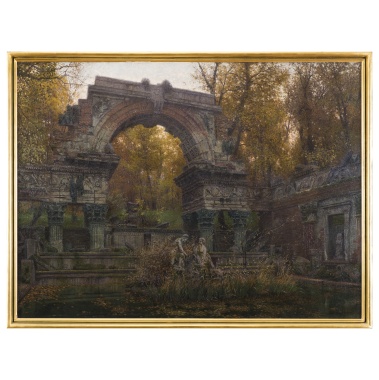 Пейзаж с руинами замка – любимый мотив художника. Порой для большей образности он сгущал краски, погружая пейзаж в сумрак вечера. Усиление таинственности и романтического настроения создавало эффект эмоционального волнения, усиливающего связь времен. Зритель смотрел на величественные крепости и арки, любовался архаикой старинных замков и скульптур. Ранцони был точен в передаче архитектурных деталей, но не забывал о пейзаже, который всегда был связан с натурой.