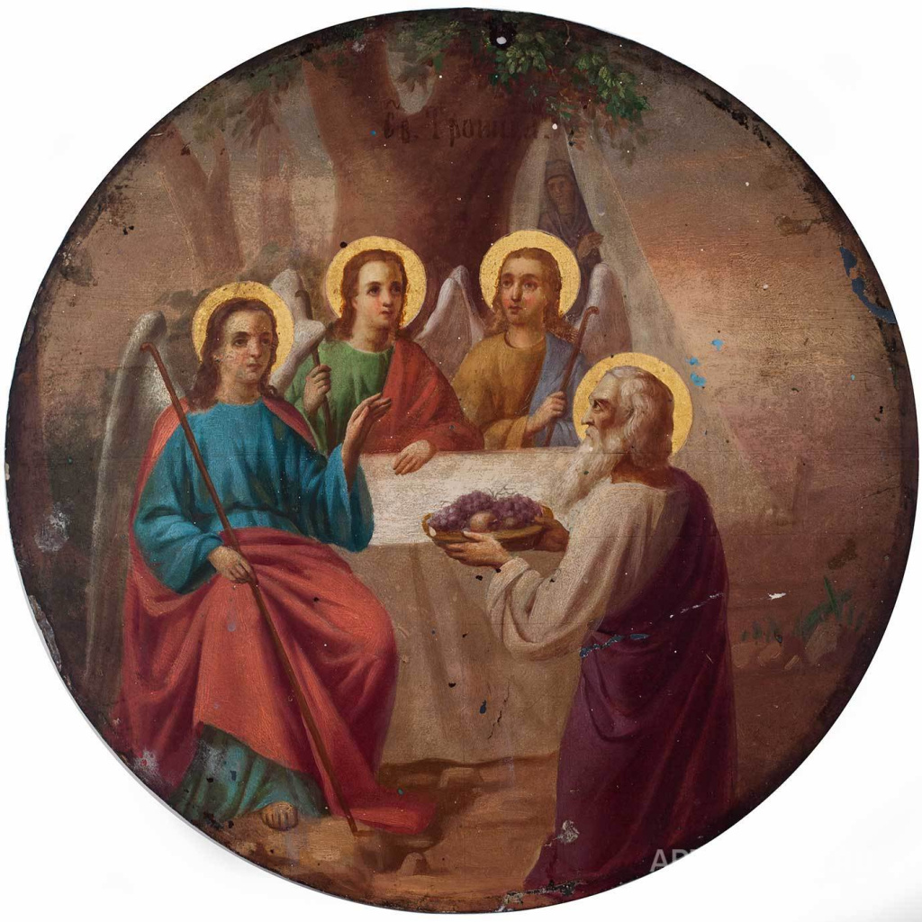 Троица ветхозаветная – один из знаменитых библейских сюжетов, рассказывающий о посещение праведников Авраама и Сарры Христом в образе трех путников, трех ангелов, воплощавших его сущность. Ангелы представлены в образах безбородых юношей с нимбами над головой, облачённых в хитоны, внешне очень схожих между собой. Они сидят за столом, погрузившись в свои мысли, занятые тихой беседой или смотрящие на Авраама.
