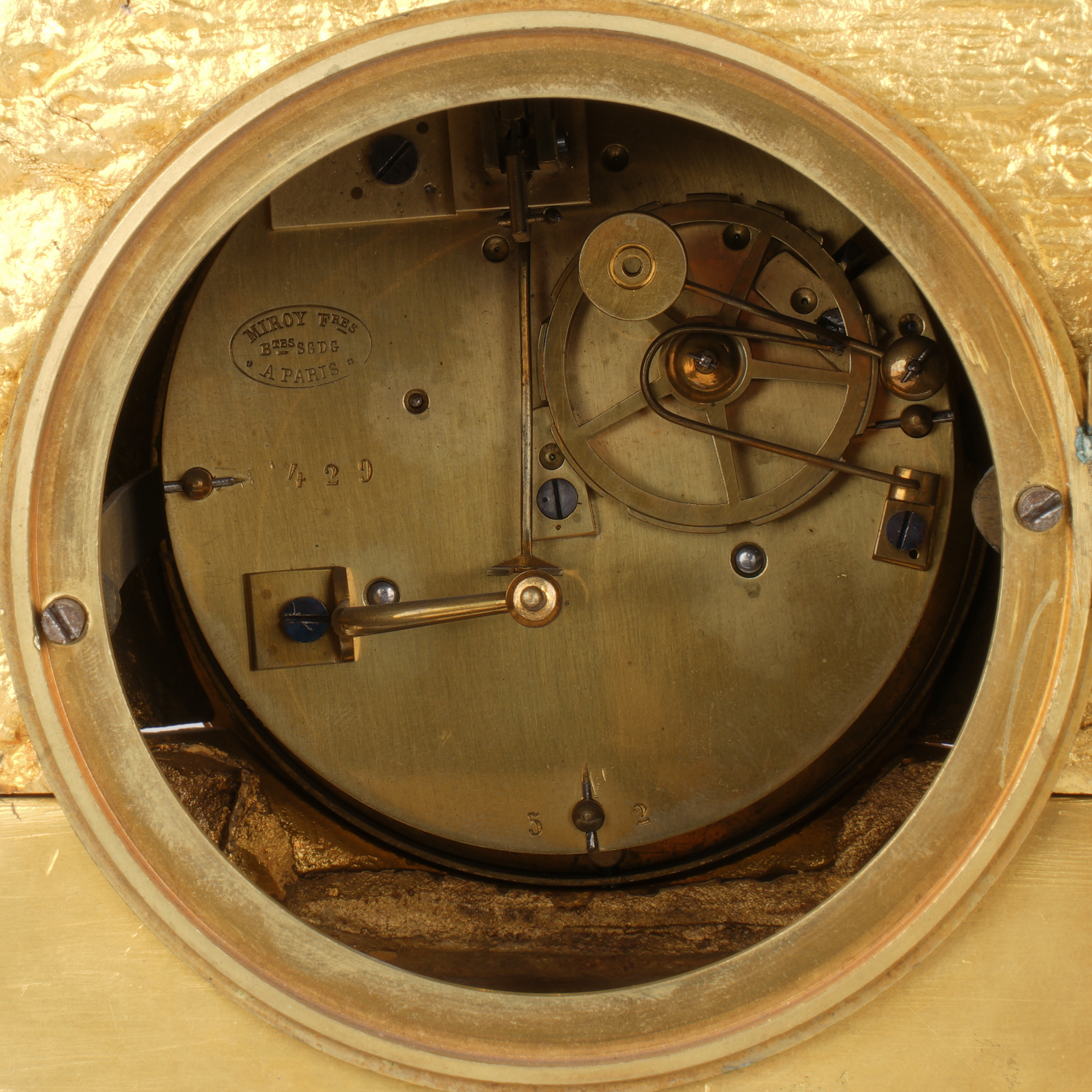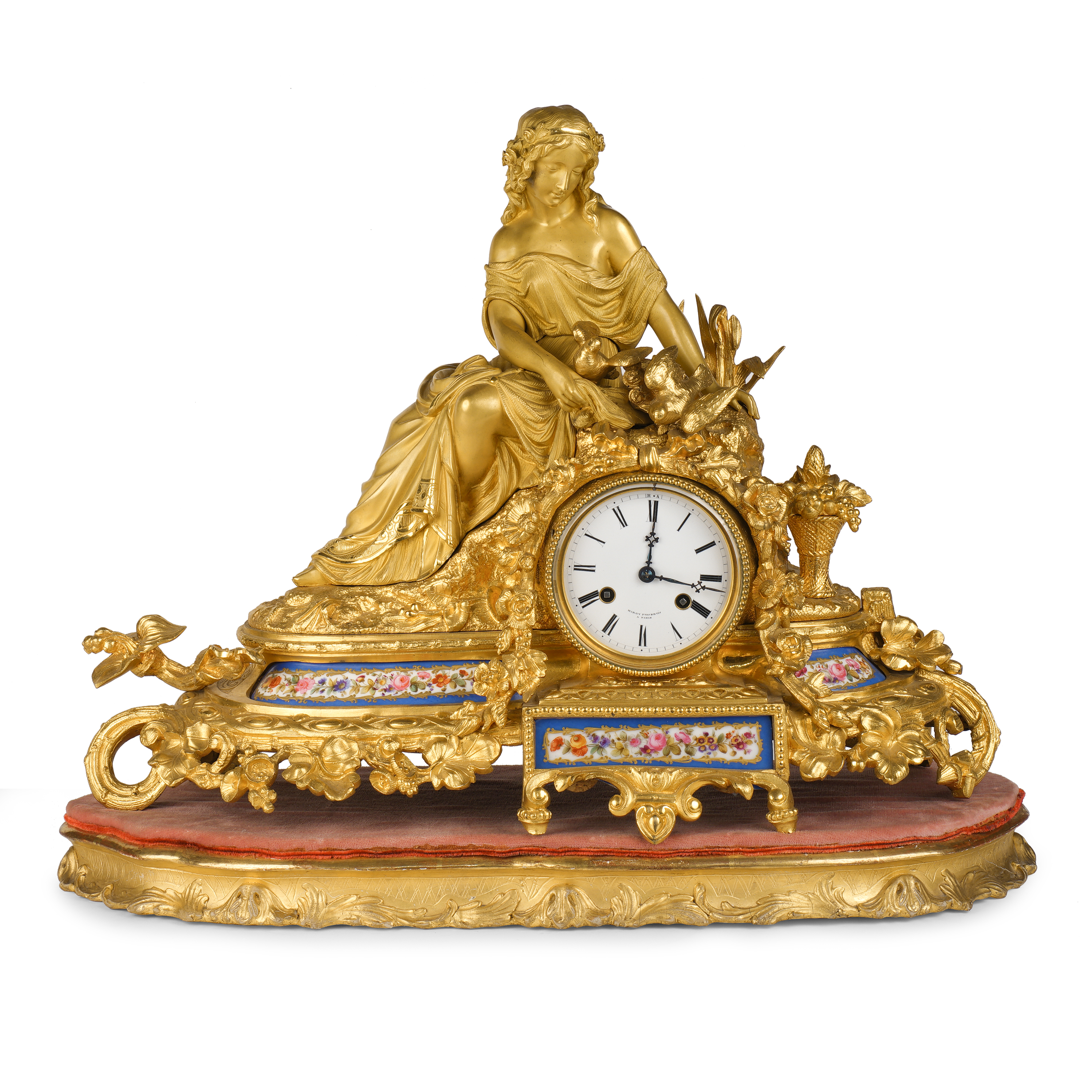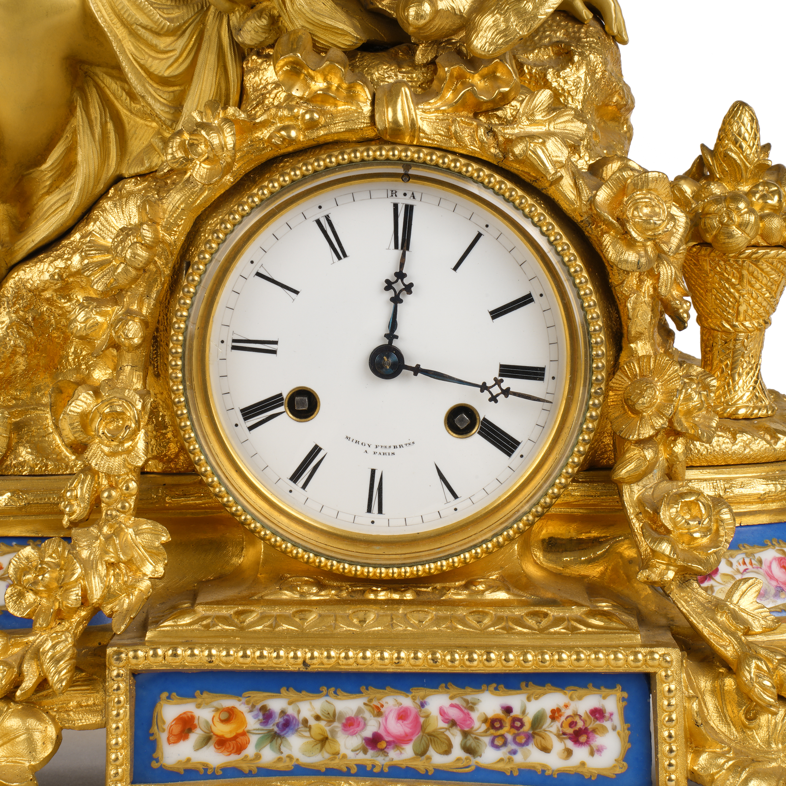 Бронза, литье, чеканка, золочение, монтировка; фарфор, полихромная роспись, золочение, эмалевый циферблат с римскими цифрами часов и делением на минуты, стальные вороненые стрелки; на циферблате: «Miroy Fres Brevetes / Paris», на плате часового механизма медаль - штамп «Miroy Freres».