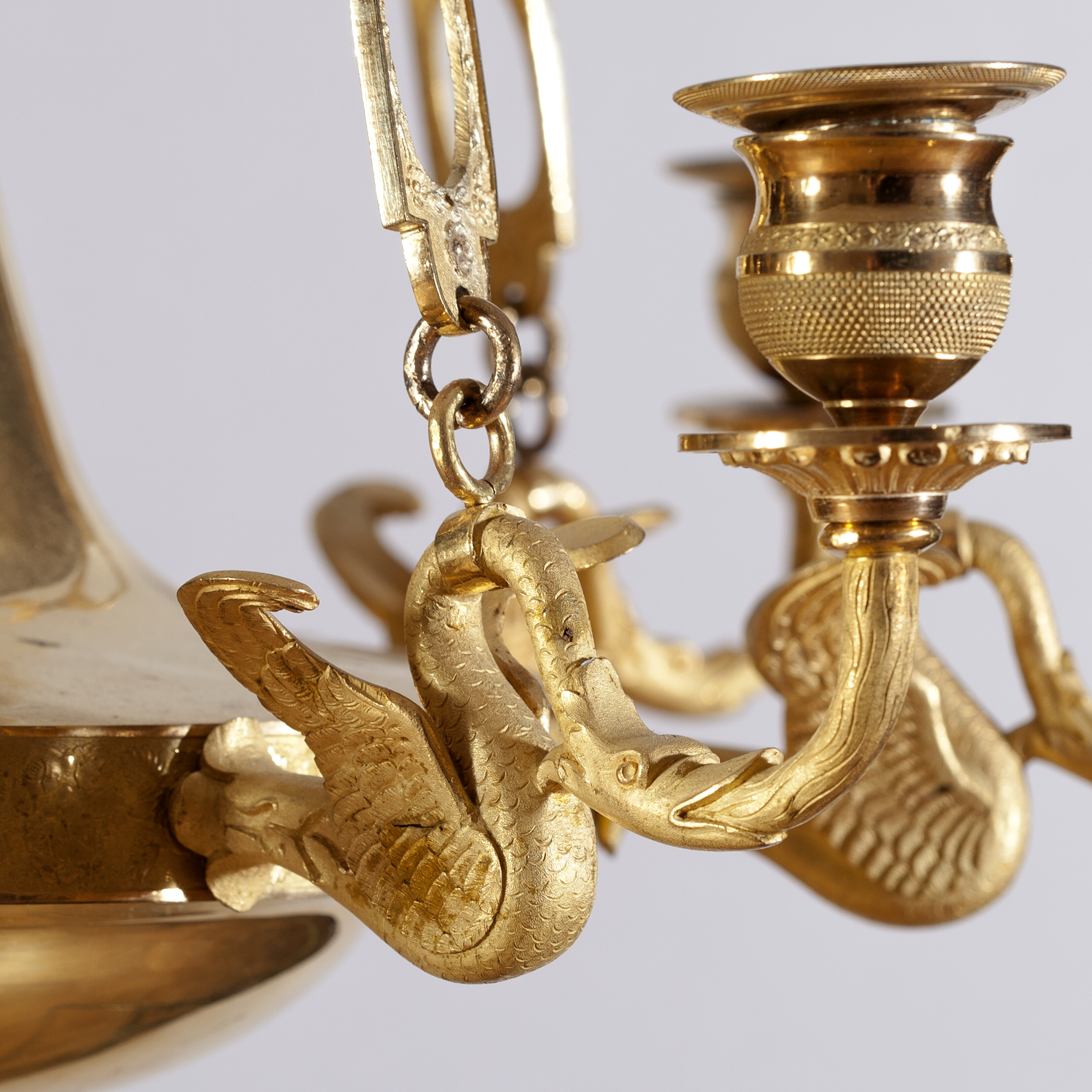Бронзовая восьмисвечная ампирная люстра на четырех цепях, в виде плоской чаши увенчается пламенником, выполнена в одной из ведущих мастерских Швеции.