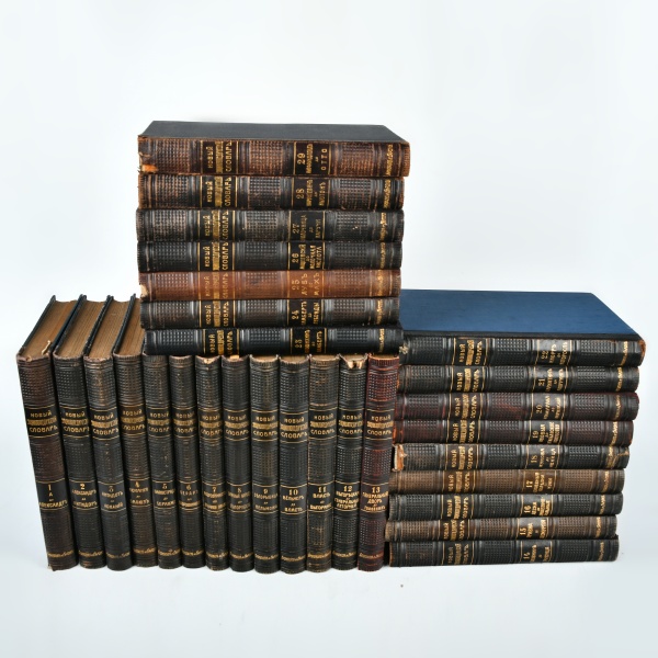 29 томов в полукожаных издательских переплетах, с золотым и блинтовым тиснением на корешках, тройные мрамированные обрезы. Под общей редакцией почетного академика К. К. Арсеньева; издатели – Ф. А. Брокгауз (Лейпциг), И. А. Ефрон (С.-Петербург). Санкт-Петербург, типография «Акционерного Общества «Ф.А. Брокгауз – И.А. Ефрон», с 20 тома издательство типографии «Акционерного общества «Издательское дело» б. «Брокгауз-Ефрон», с 21 тома место издания – Петроград. Размер: 26,2 х 18 см.