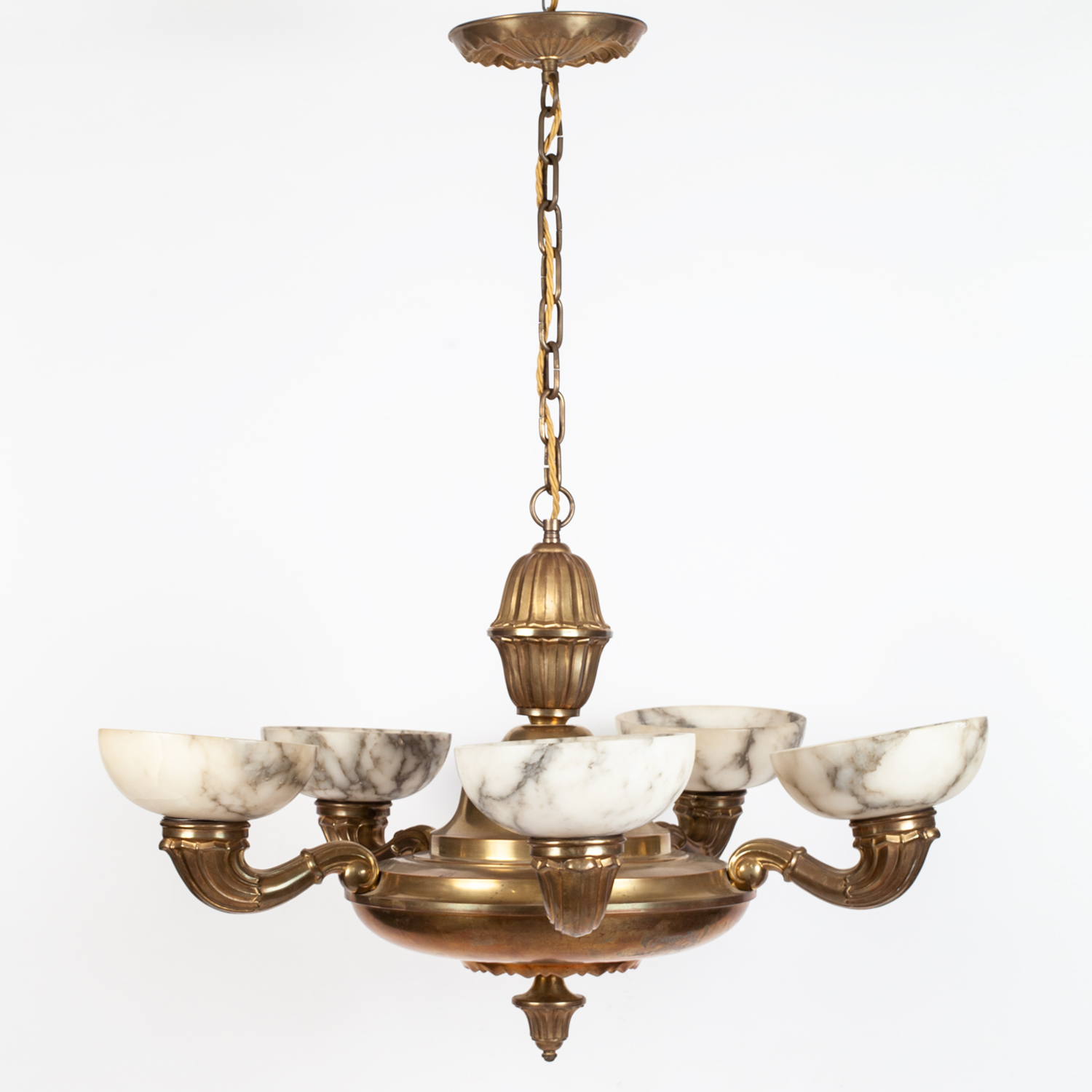 На 5 светоточек, латунь, плафоны - алебастр, предположительно Германия, первая половина ХХ века, размеры: высота 85 см