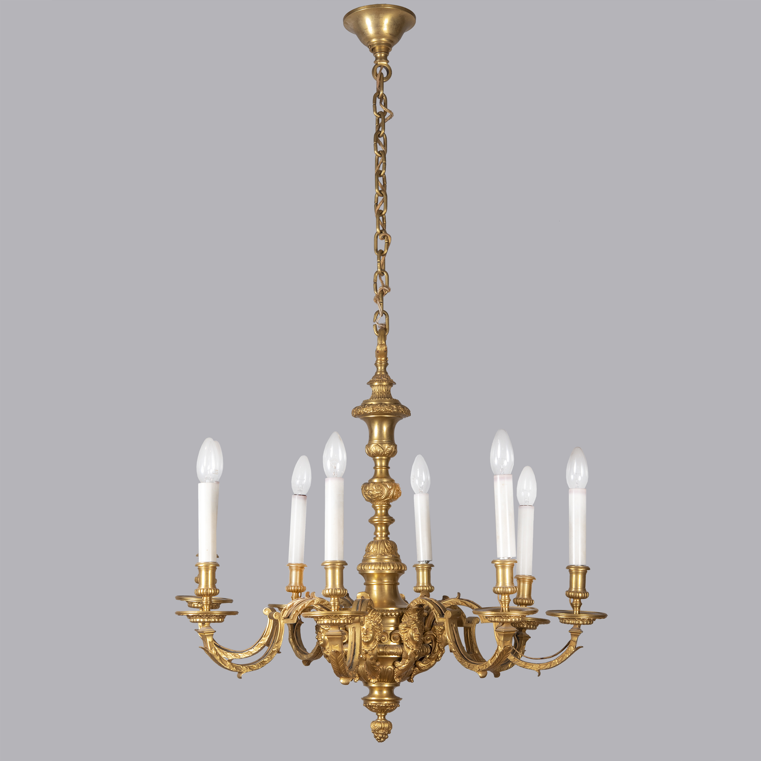 Люстра по образцу начала XVIII века, центральная часть украшена женскими маскаронами и листьями аканта, на 8 светоточек. Бронза, литье, чеканка, золочение, Франция, XIX век, размеры: высота 120 см, диаметр: 71,5 см