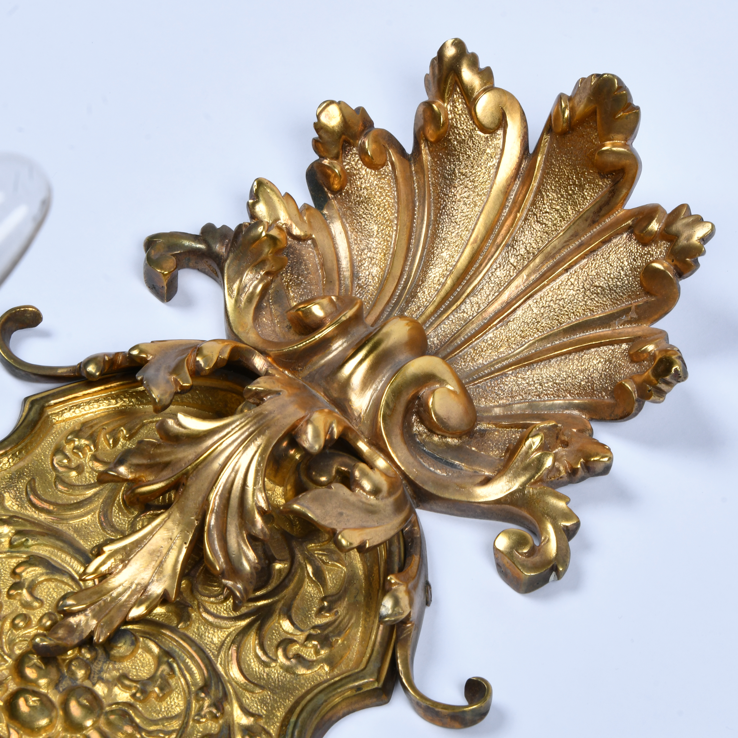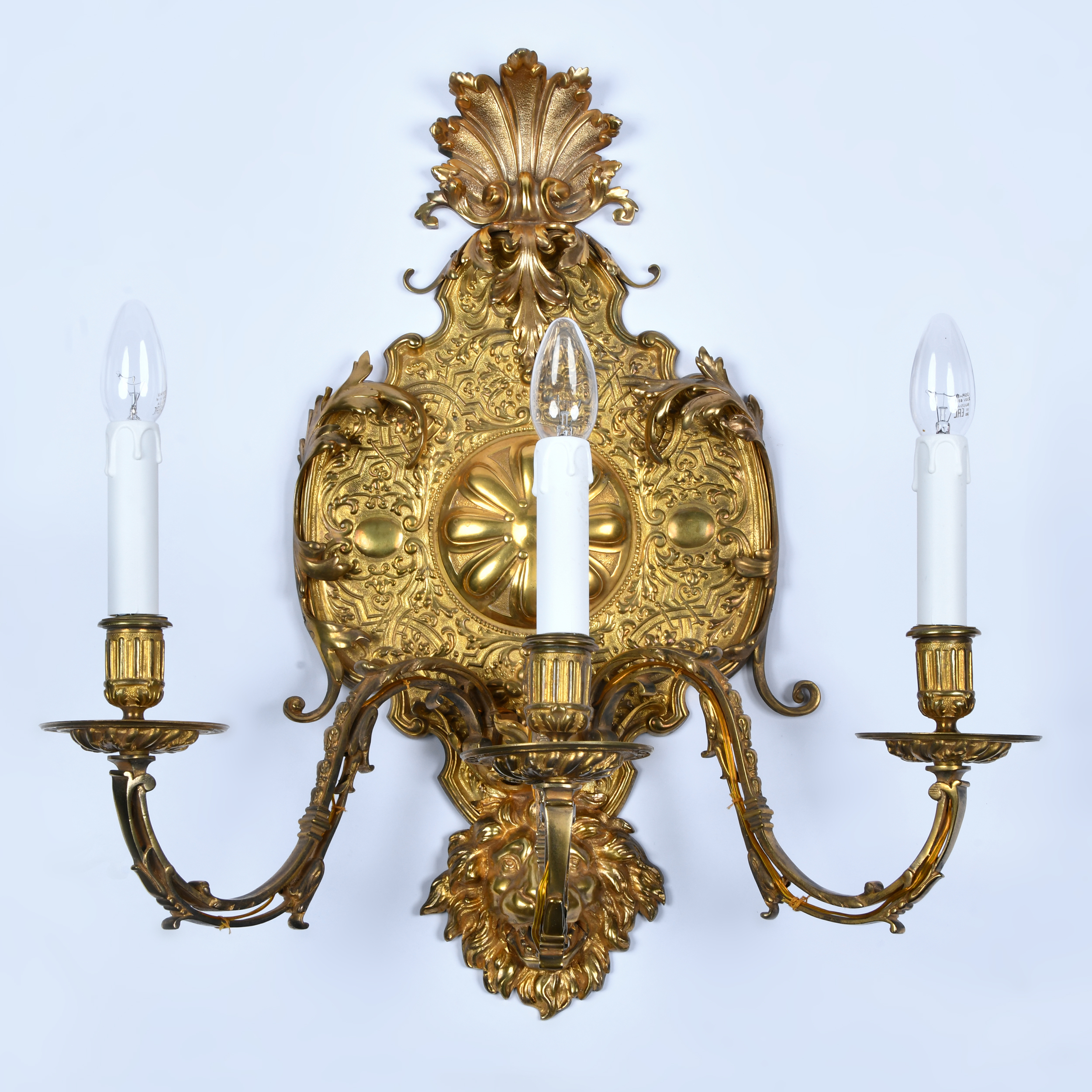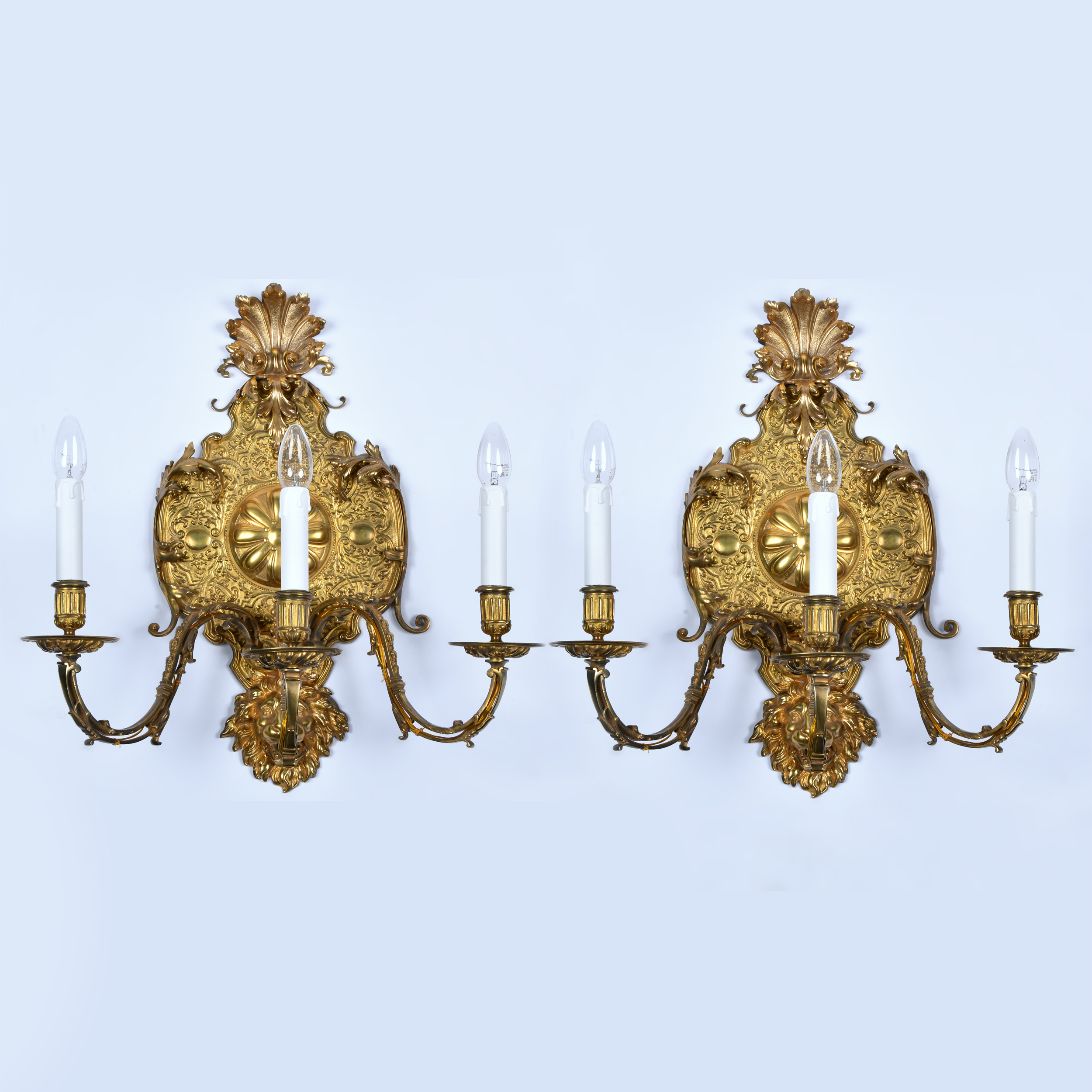 Парные бра на три свечи выполнены в одном из неостилей эпохи историзма, сочетающем в себе черты стиля Людовика XV с восточными стилизованными орнаментами. Венчают парные бра декоративные элементы в виде пальмовых листьев, львиные маски дополняют художественное решение.