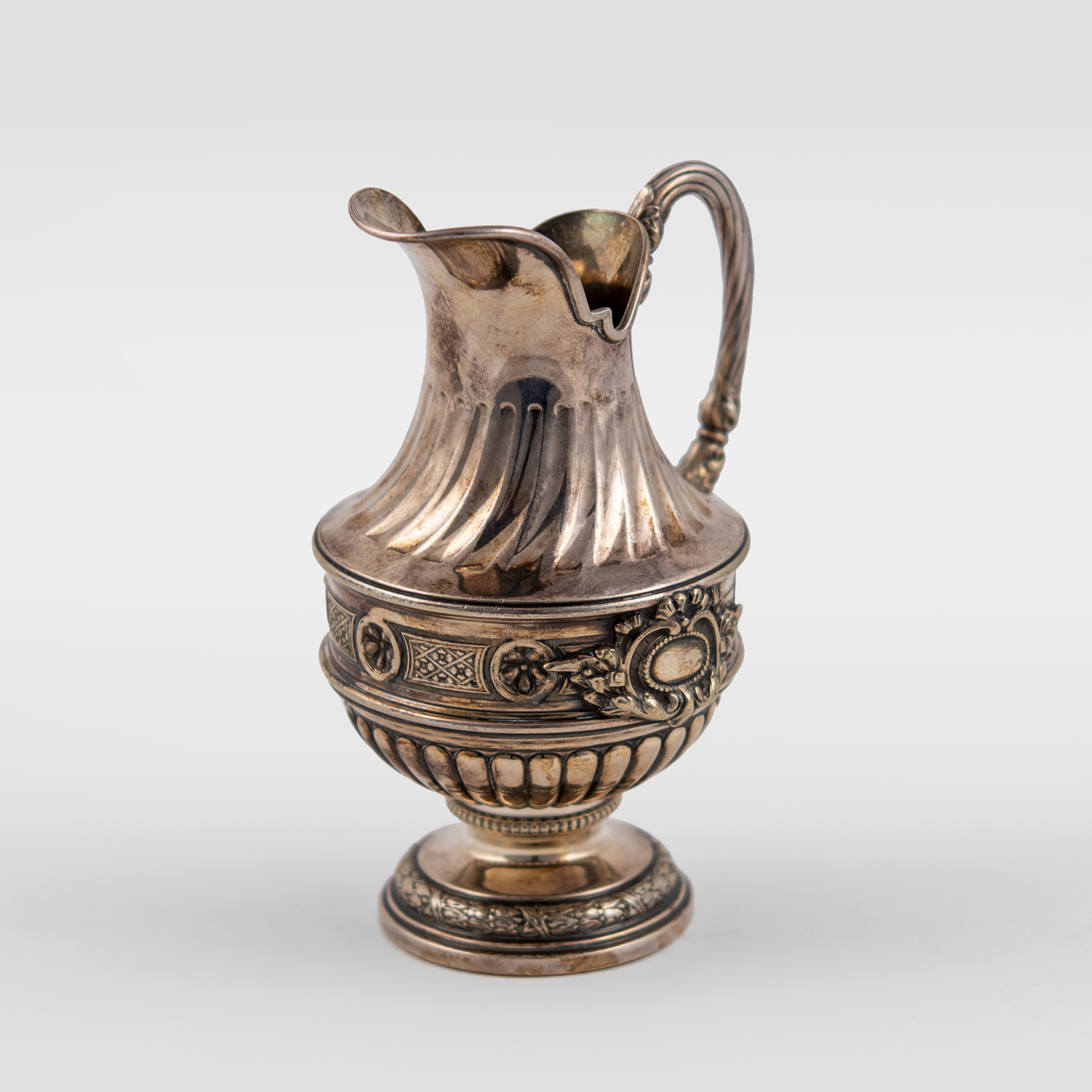 Сервиз кофейный состоит: сахарница с крышкой, кофейник с откидной крышкой, молочник. Металл, литье, штамп, чеканка, глубокое серебрение, монтировка, клейма: «as», буква «О», помещенная в ромб «NUFN», завода производителя «W.M.F.N, Вюртембергский завод (Württembergische Metallwarenfabrik), Германия, 1890-1900 гг., размеры: кофейник - 28х14х12 см; сахарница - 19х17х11 см; молочник - 17,5х12х8,5 см. Общий вес: 1 888 г. (Кофейник - 891 г, молочник - 408 г, сахарница - 589 г)