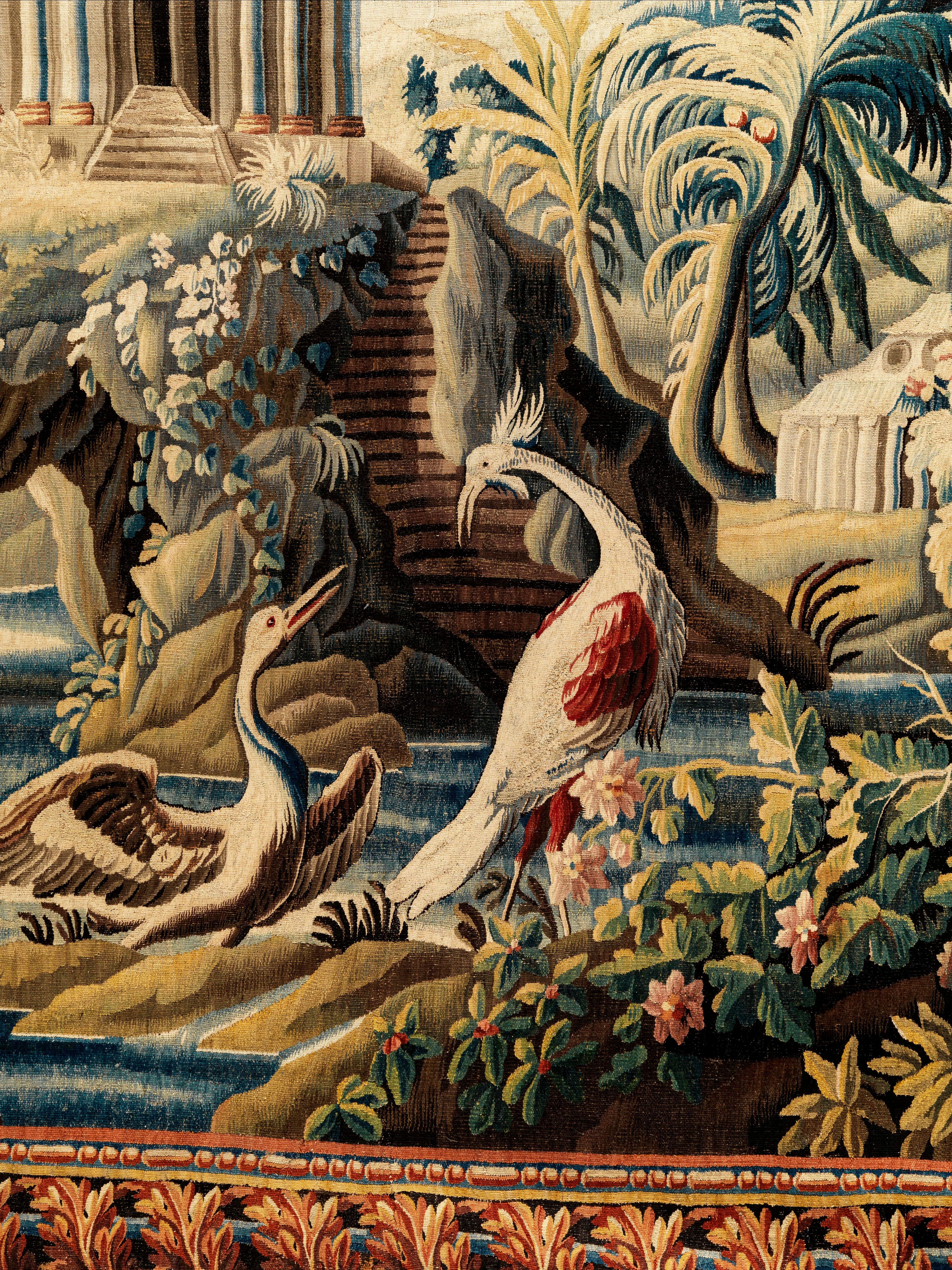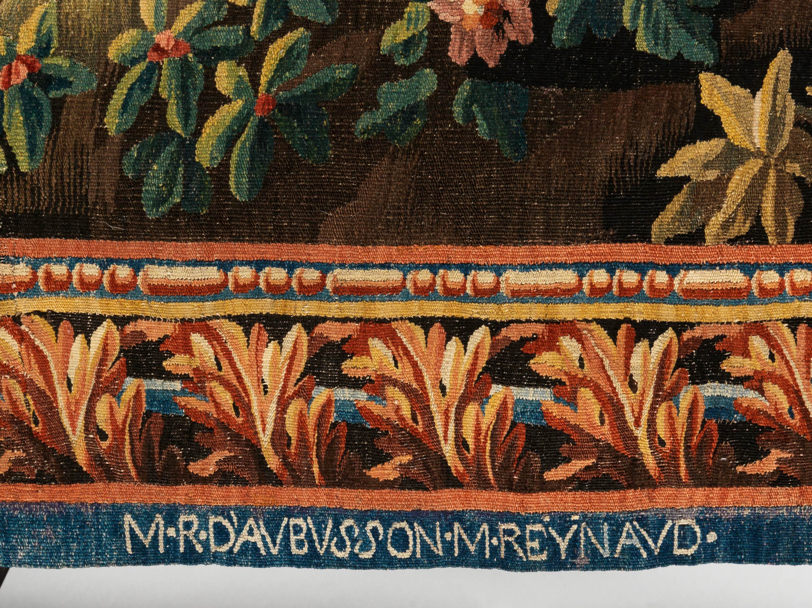 Подобные шпалеры создавались как часть интерьерных ансамблей и предназначались для украшения парадных помещений. В оформлении бордюра использованы традиционные для Обюссона мотивы акантовых листьев, выполненные в теплой золотисто-охристой гамме, создающей рамочный эффект и подчеркивающей живописность сцены.