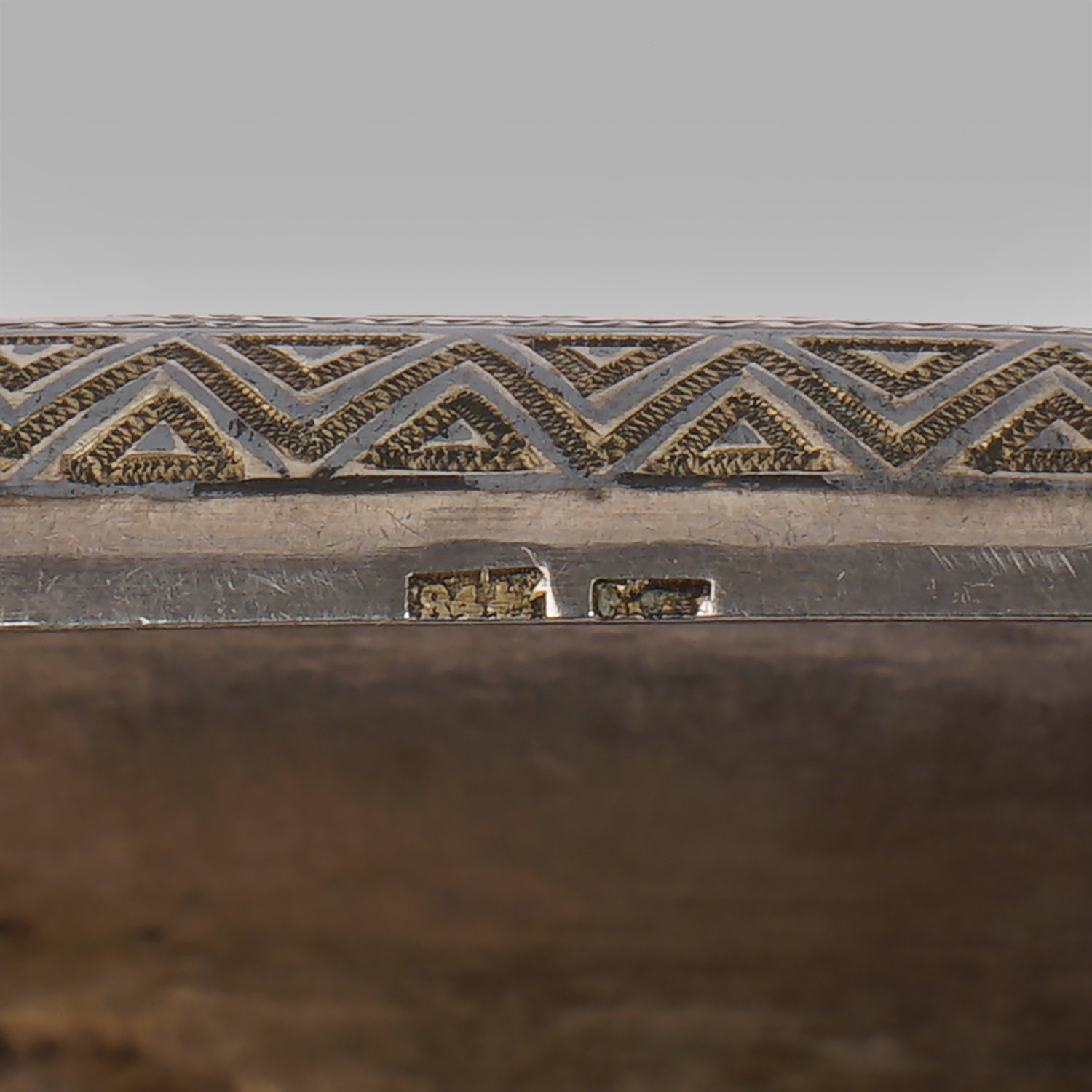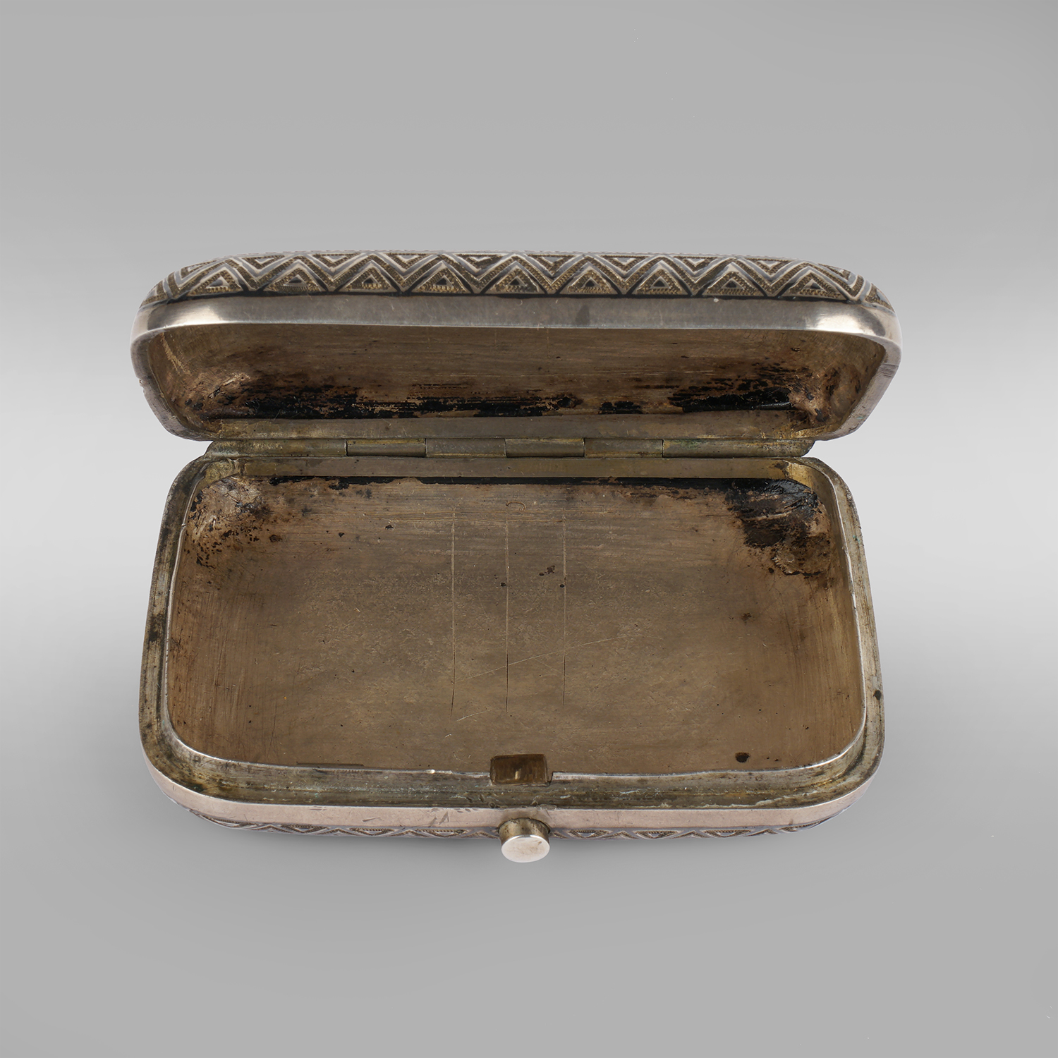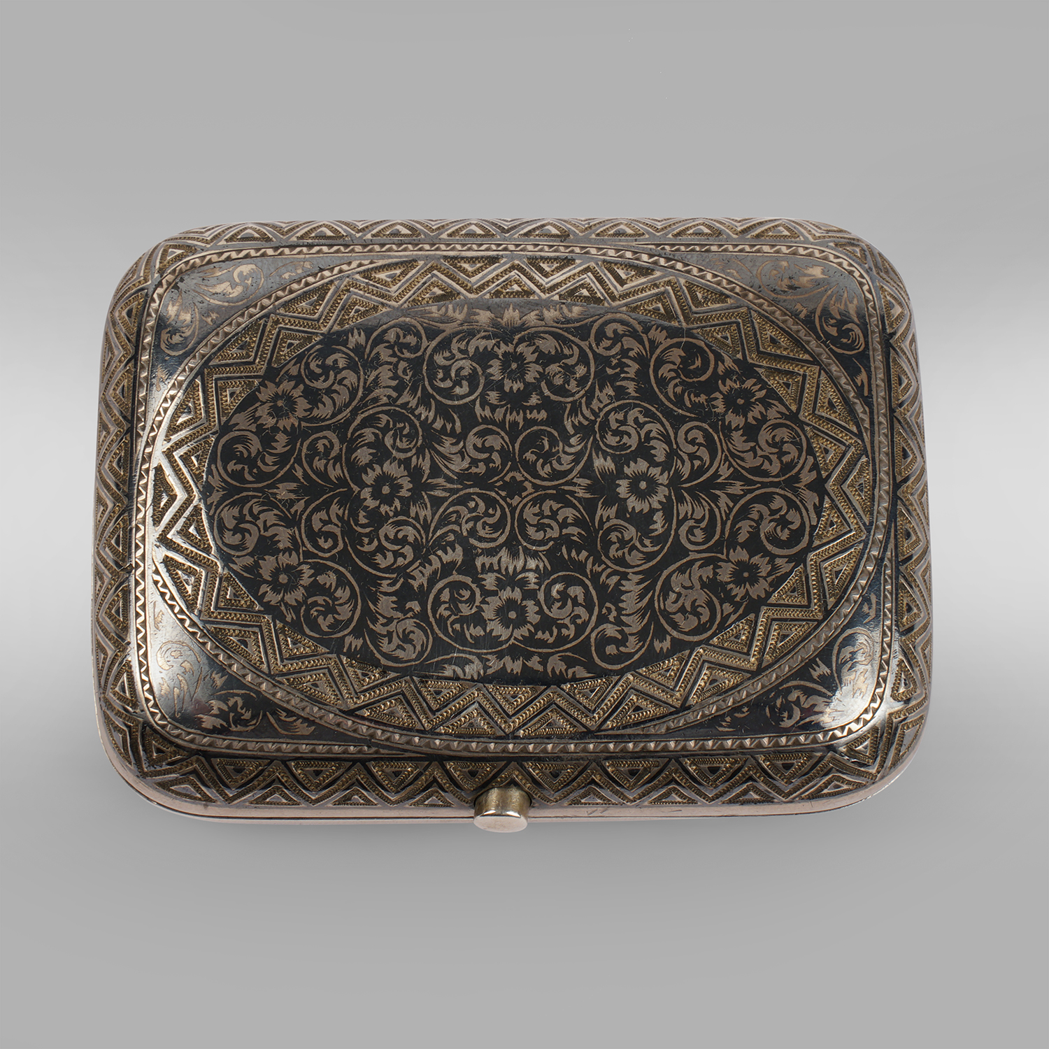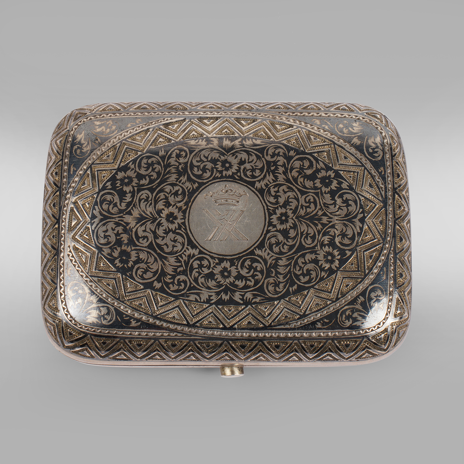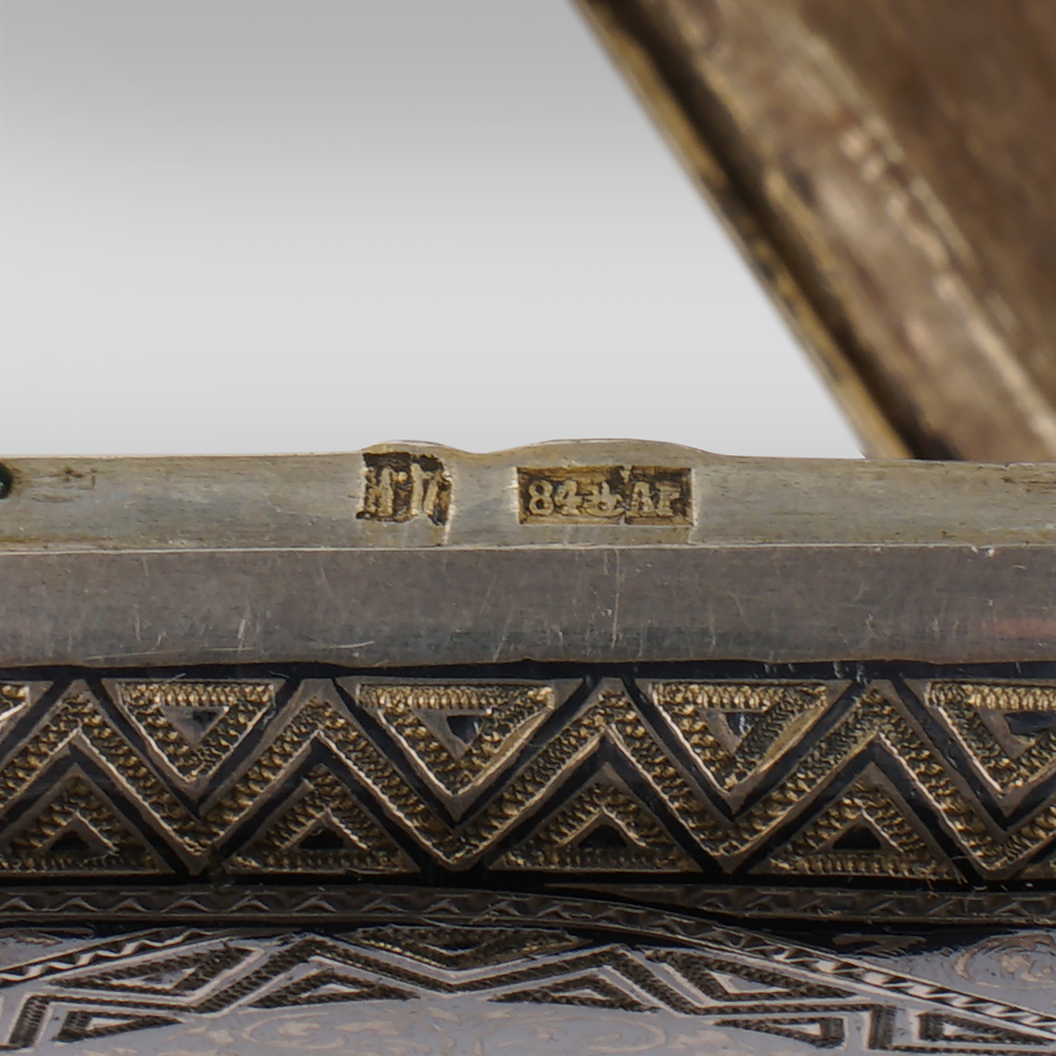 Серебро (84 проба), чернь, литье, штамп, чеканка, на верхней крышке вензель "БМ" под короной, именник мастера "Д.Н", московский герб - Георгий Победоносец на коне.
