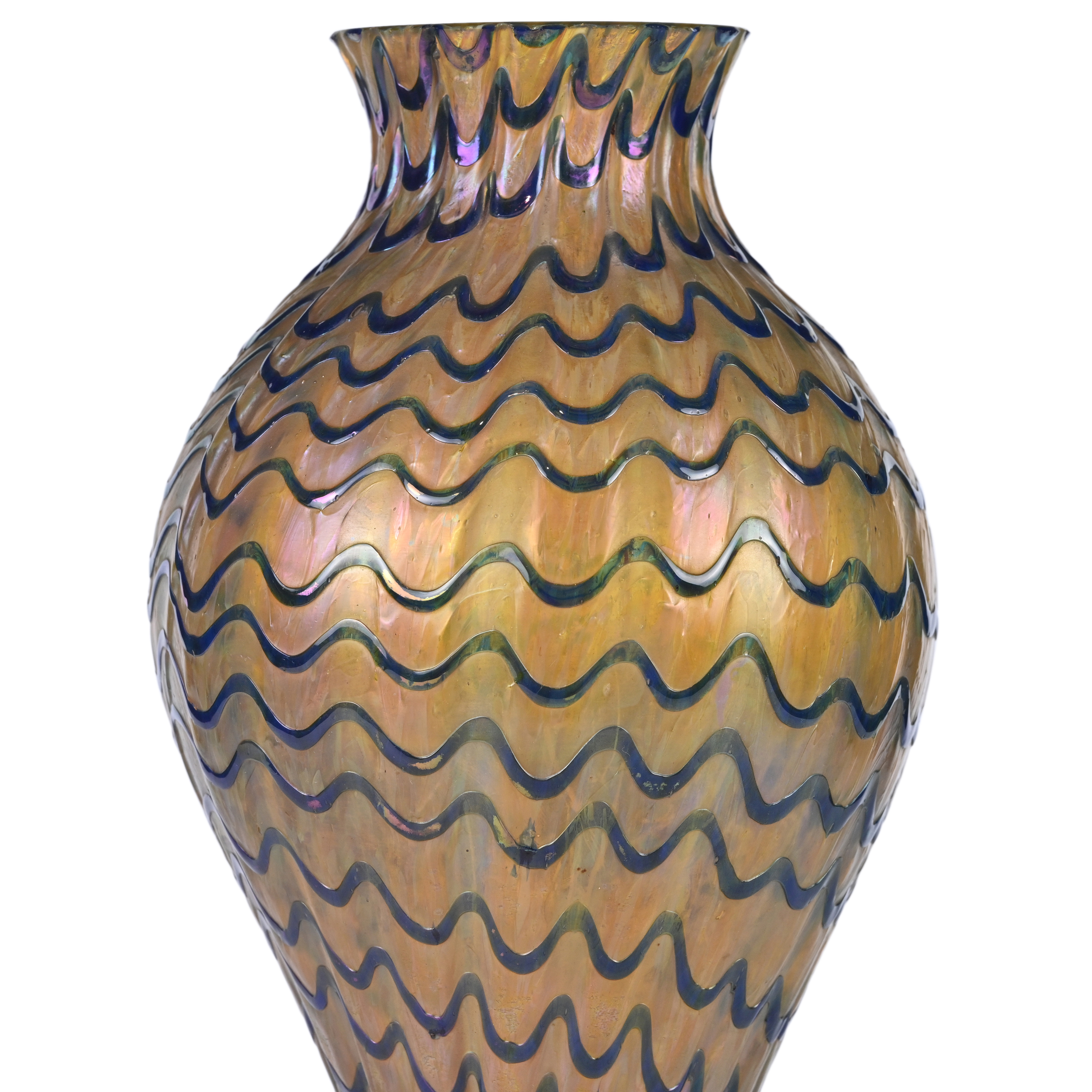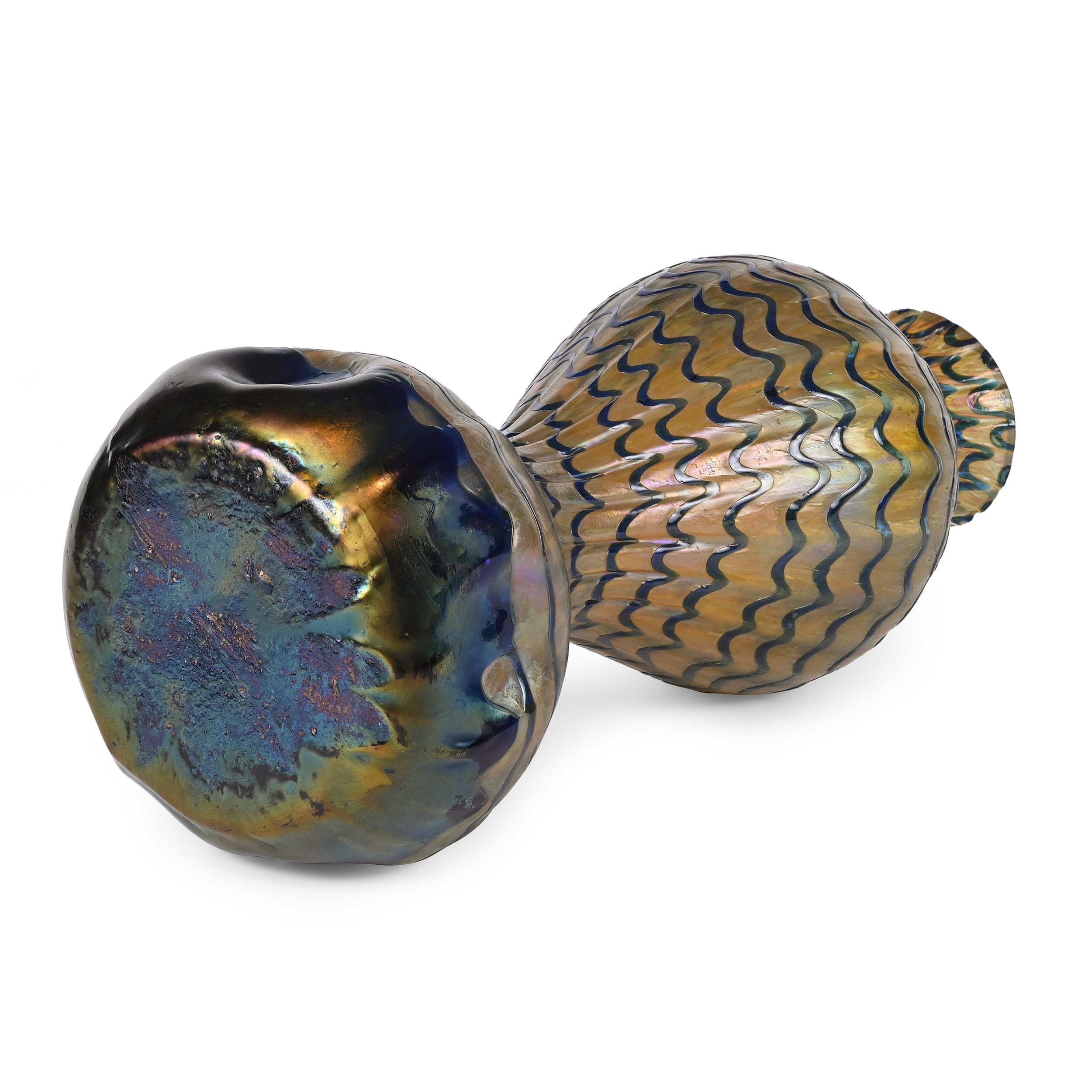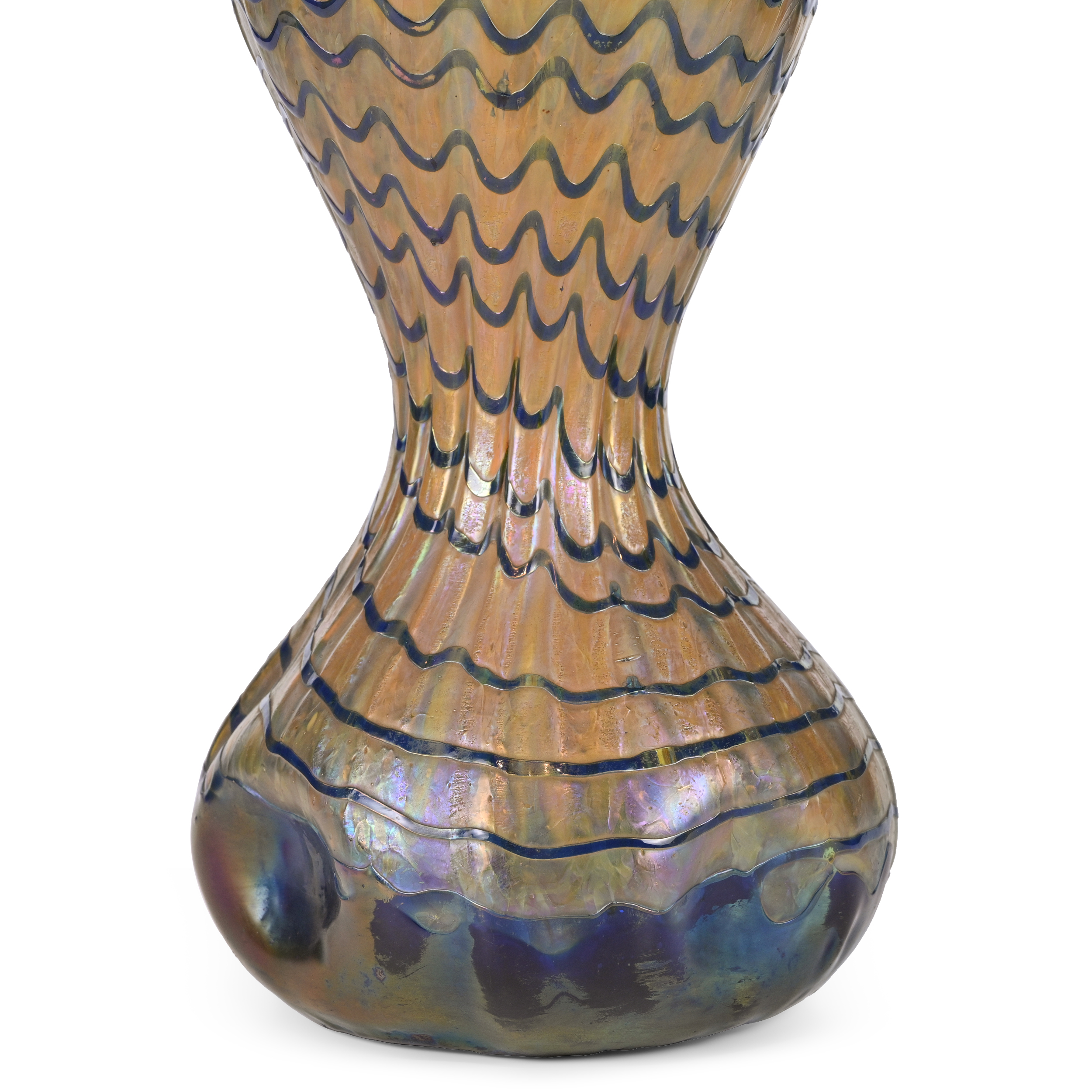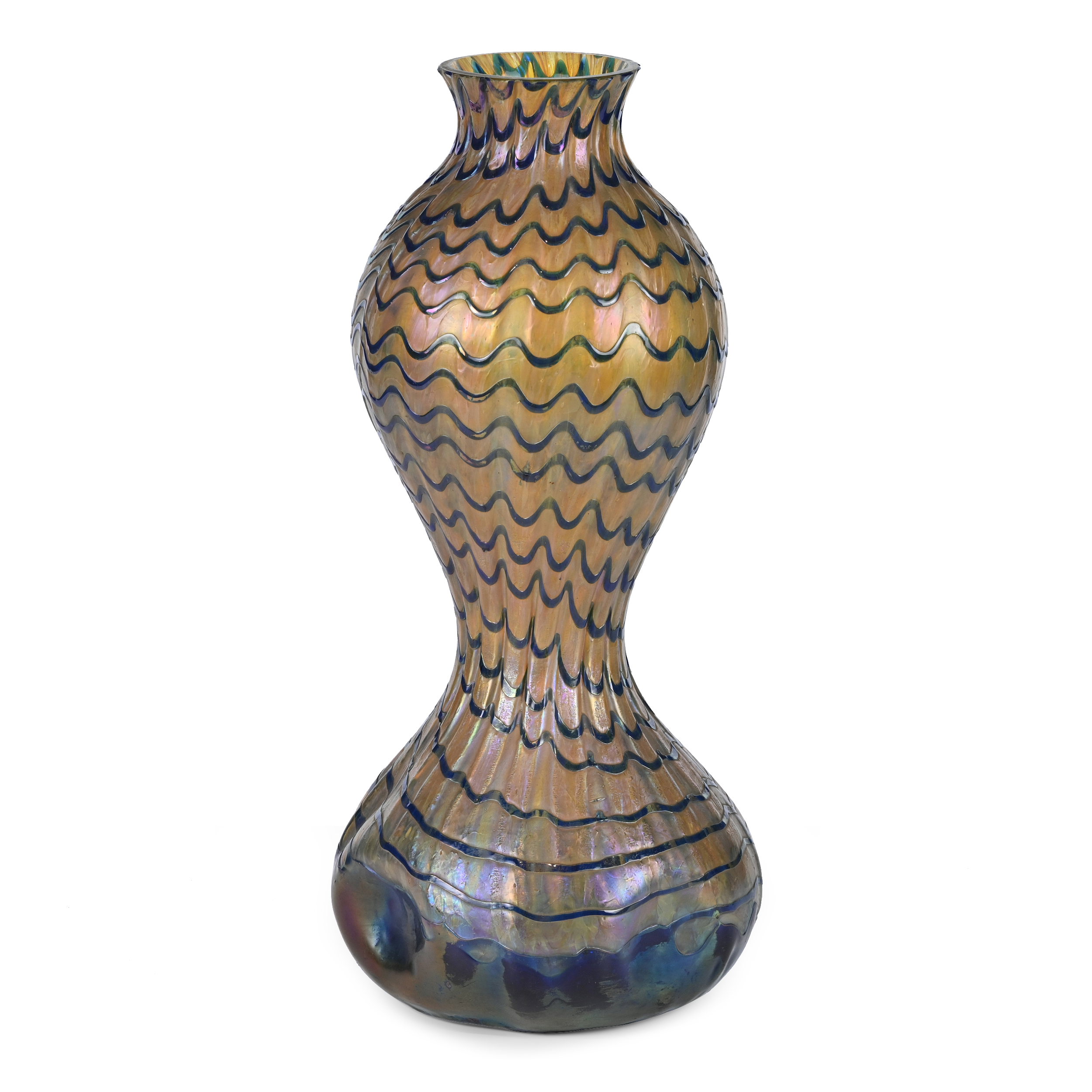 Стекло, выдувание, иризация, применение запатентованной стекольной фабрикой Лётц техники т.н. барочного стекла - декорирование тулова вазы накладными стеклянными нитями, стекольная фабрика «Вдова Йоханна Лётца» (1850-1947), Клостермюле, высота – 32 см, диаметр - 14,5 см.