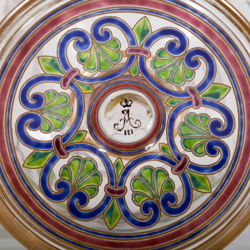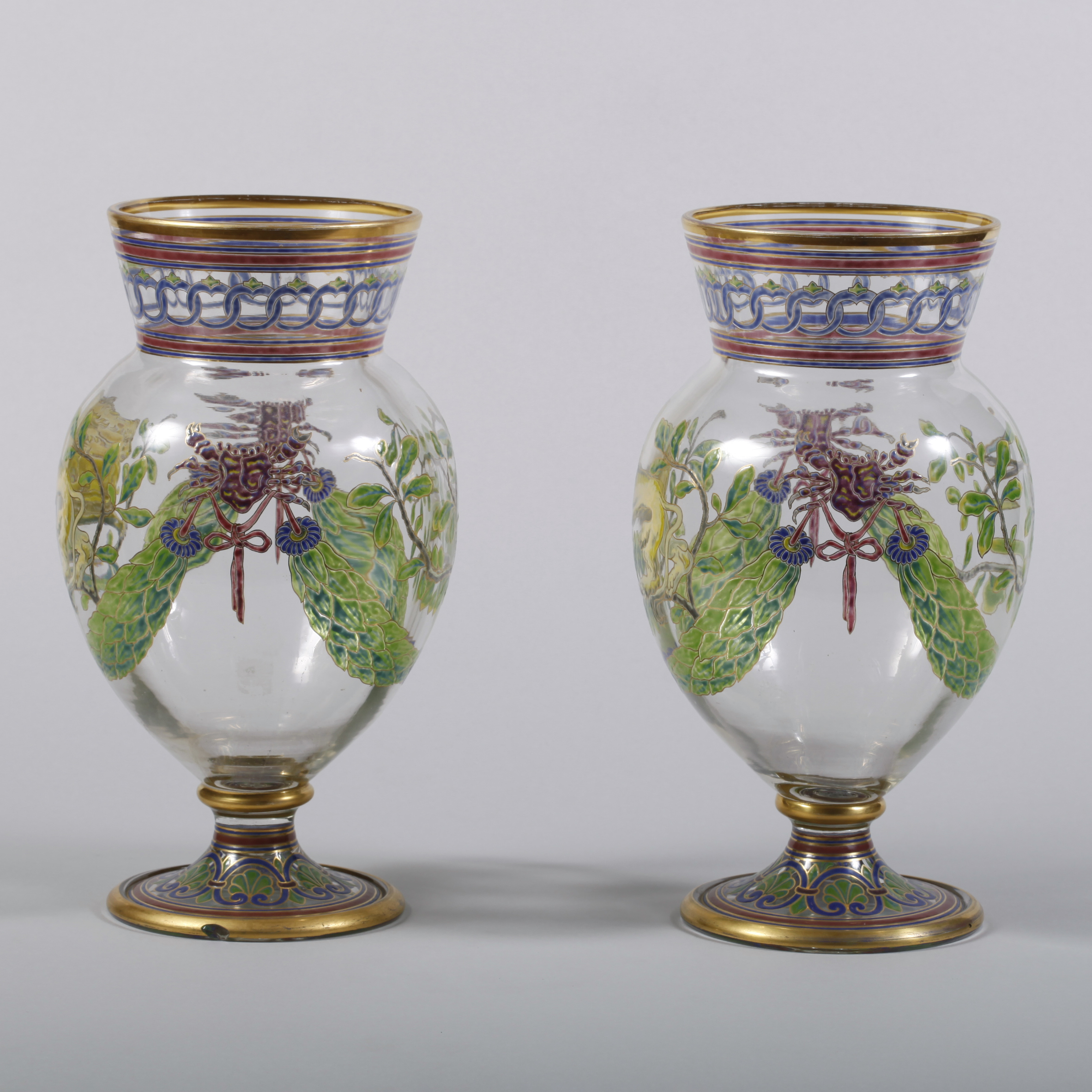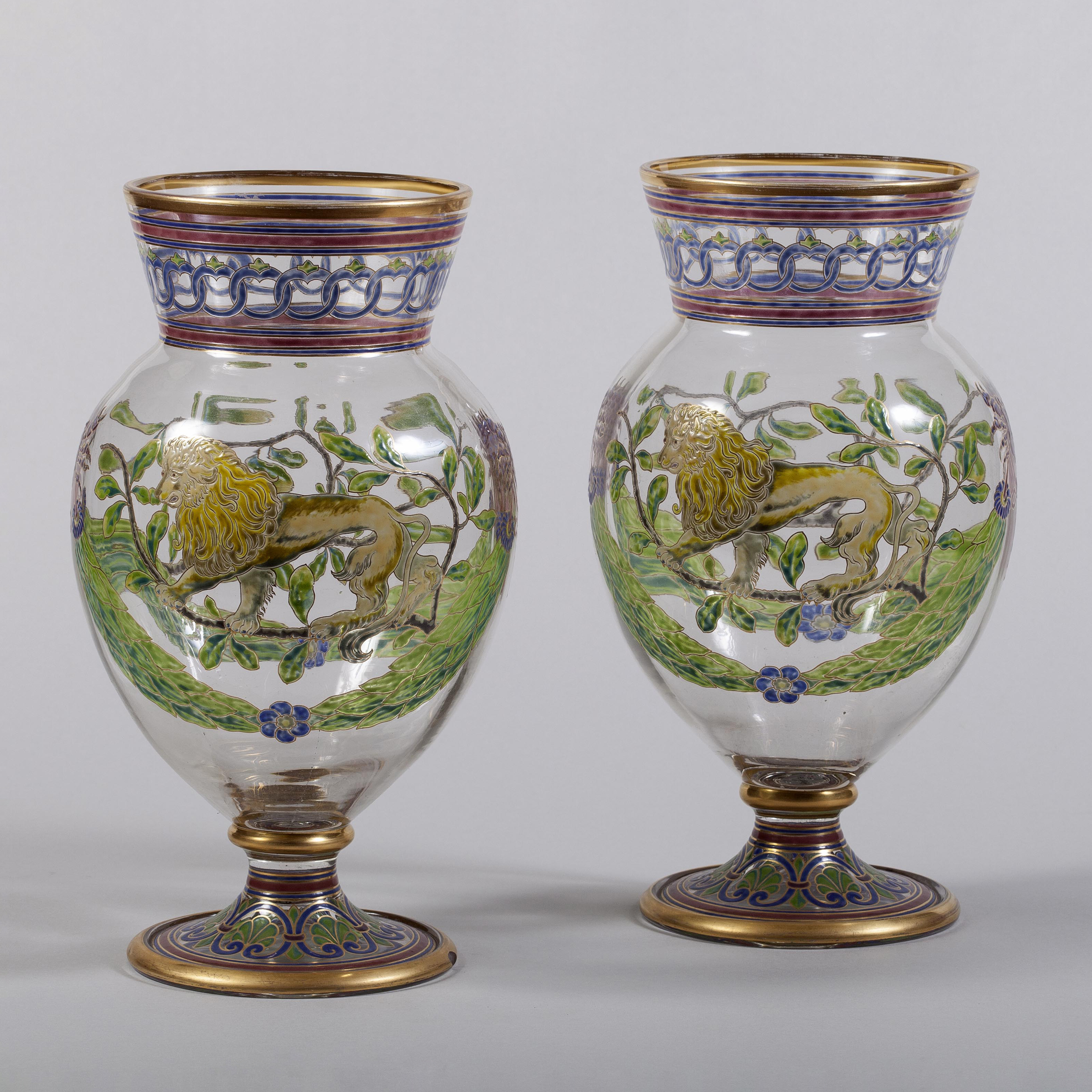 Парные вазы украшены аллегорическими изображениями львов, прогуливающихся по лавровым гирляндам, увенчанными декоративными маскаронами. Бесцветный хрусталь, выдувание, роспись полихромными густыми эмалями; в основании ваз марки «АIII», период правления императора Александра III; Россия; высота – 31 см, диаметр горла – 18 см.