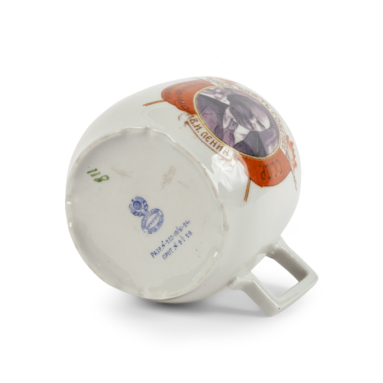 Кружка с портретом В.И. Ленина в медальоне, обрамленном знаменами с агитационными лозунгами «Вся власть Советам/ В.И. Ленин», «Пролетарии всех стран соединяйтесь/СССР».