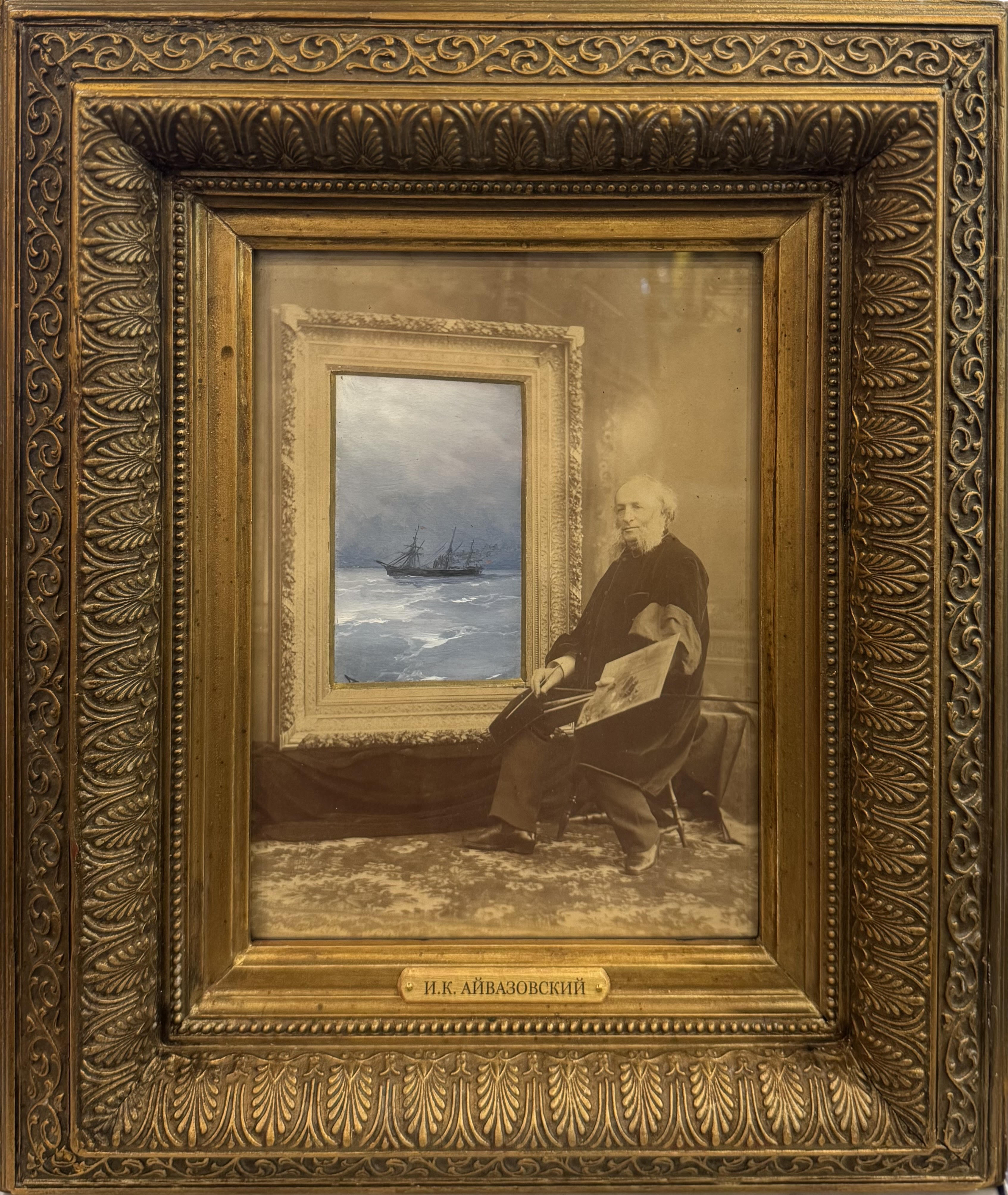 «Композиционное и живописно-пластическое решение имеют аналогии с работами художника Айвазовского. Большинство подобных работ появилось в 1887 году, когда И. Айвазовский отмечал 50-летие своей художественной деятельности. Они предназначались для подарков друзьям и знакомым и были вмонтированы в фотографии с портретом Айвазовского».