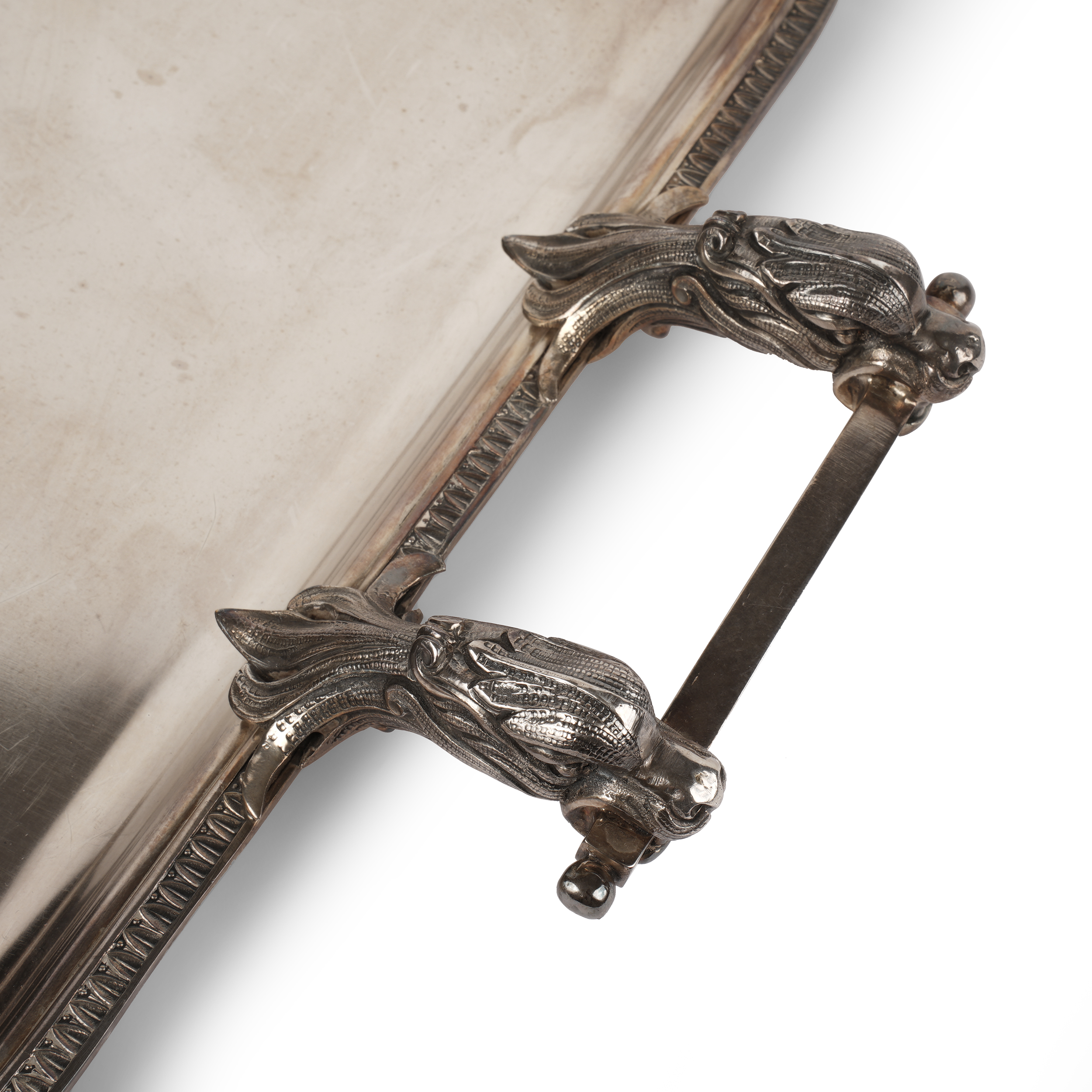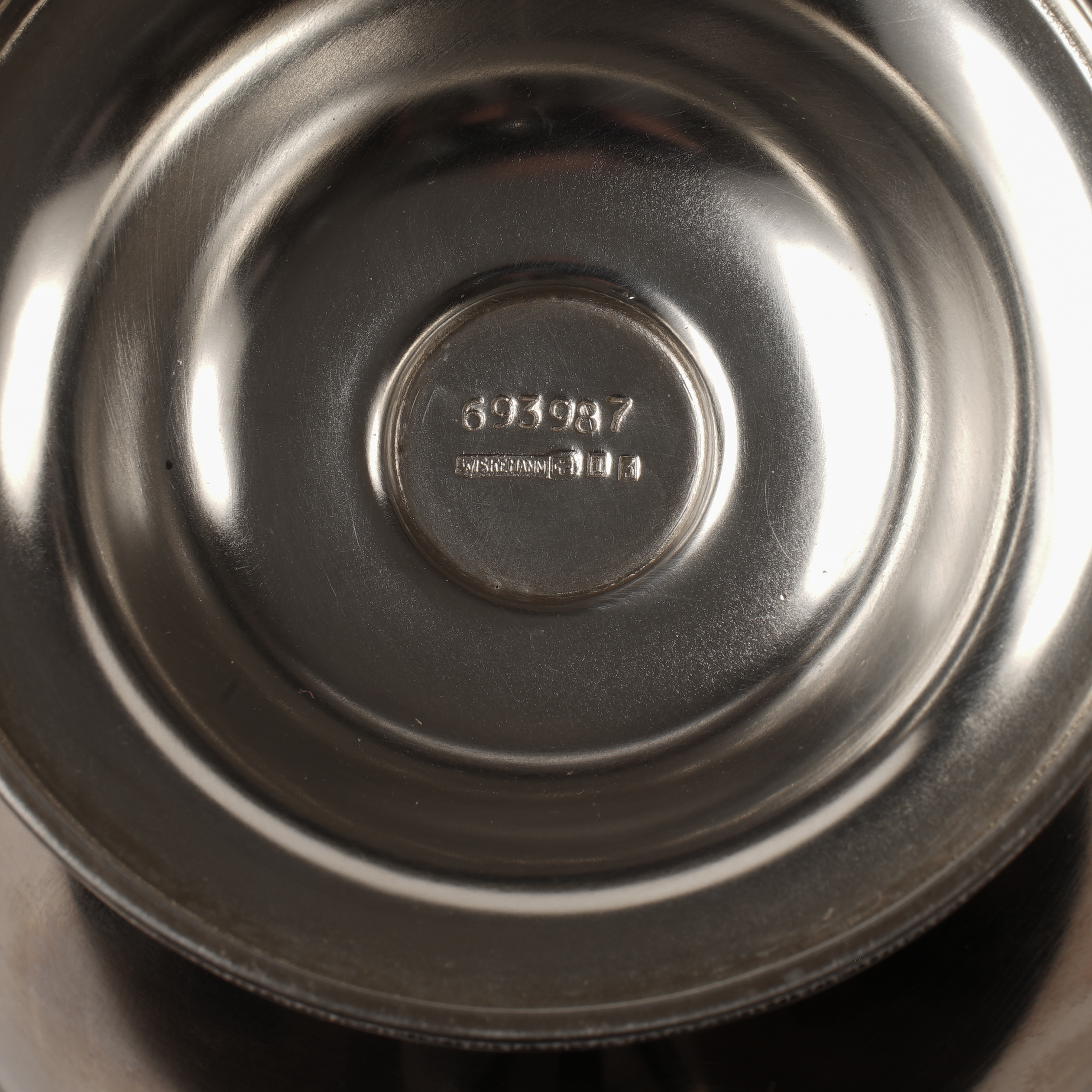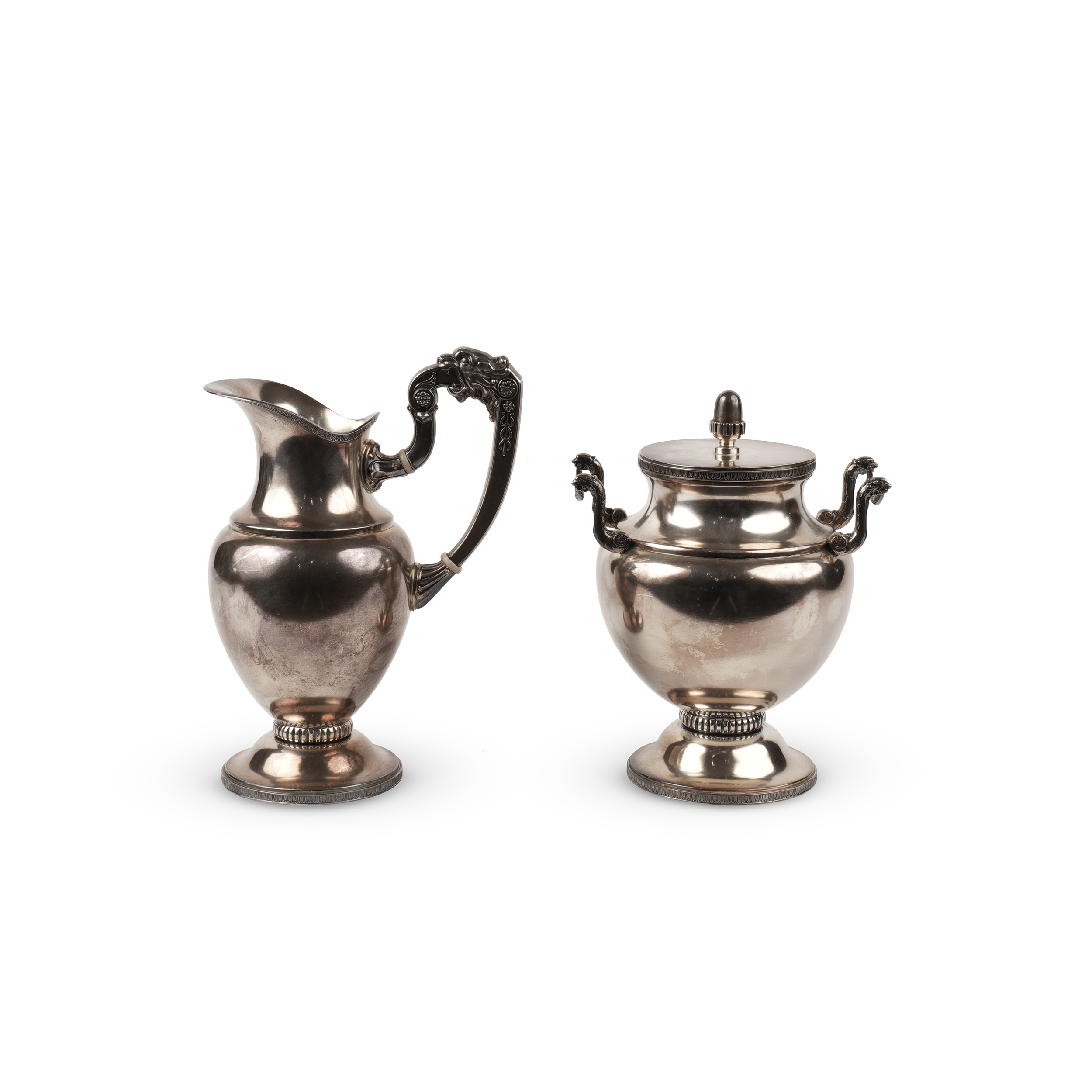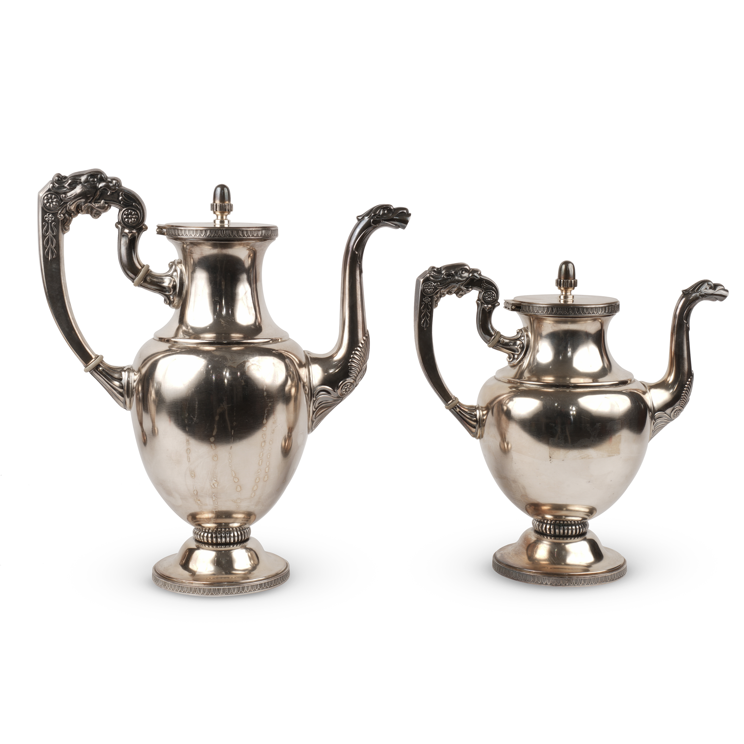 Поднос, кофейник, чайник, сахарница, сливочник. Металл, серебрение, клейма: номер «694563», «Wiskemann», клеймо в виде креста в щитке, «1», «9», фабрика Wiskemann (открыта с 1877 года), Бельгия, Брюссель, конец XIX века, длина подноса – 59 см, ширина подноса – 36 см, высота кофейника – 29 см.