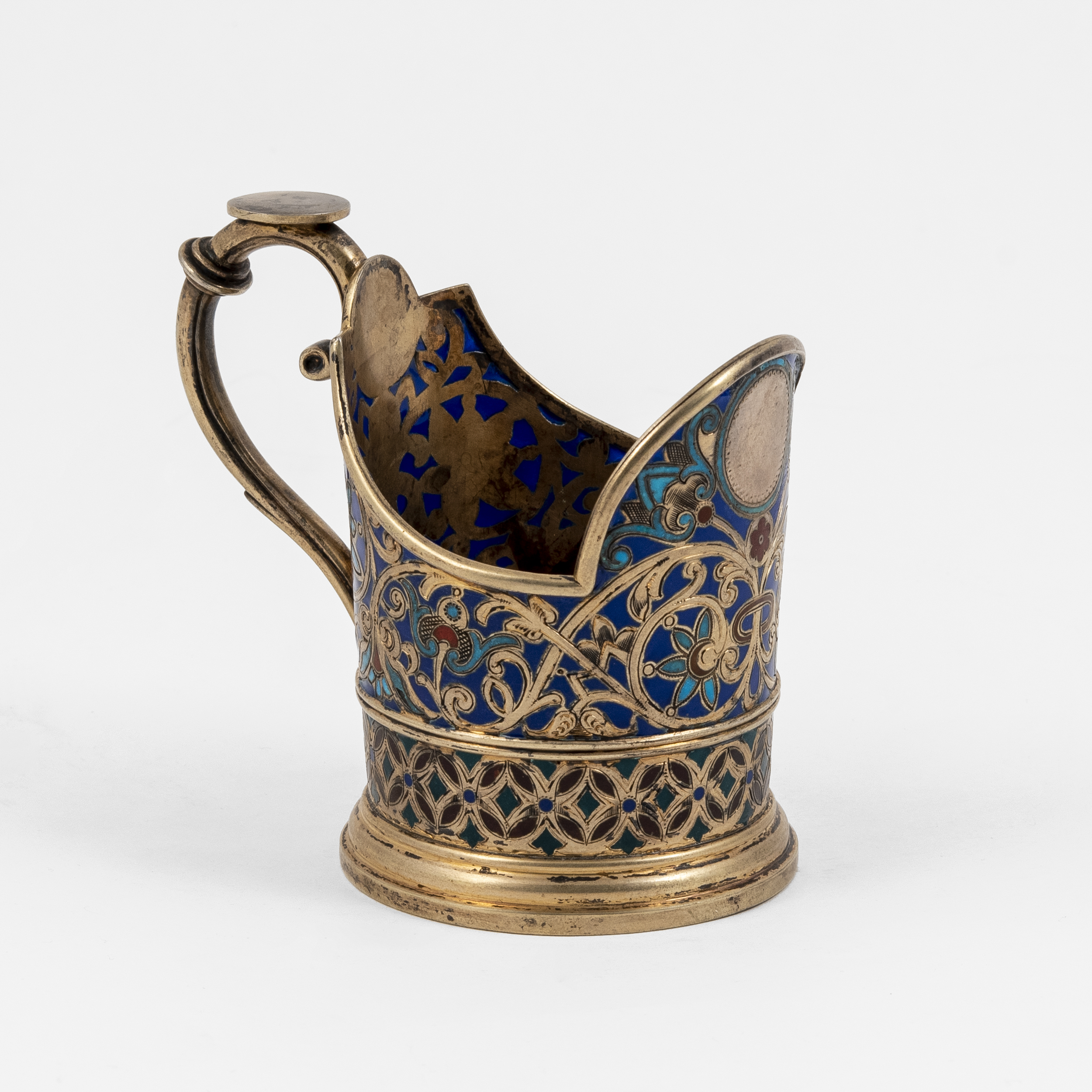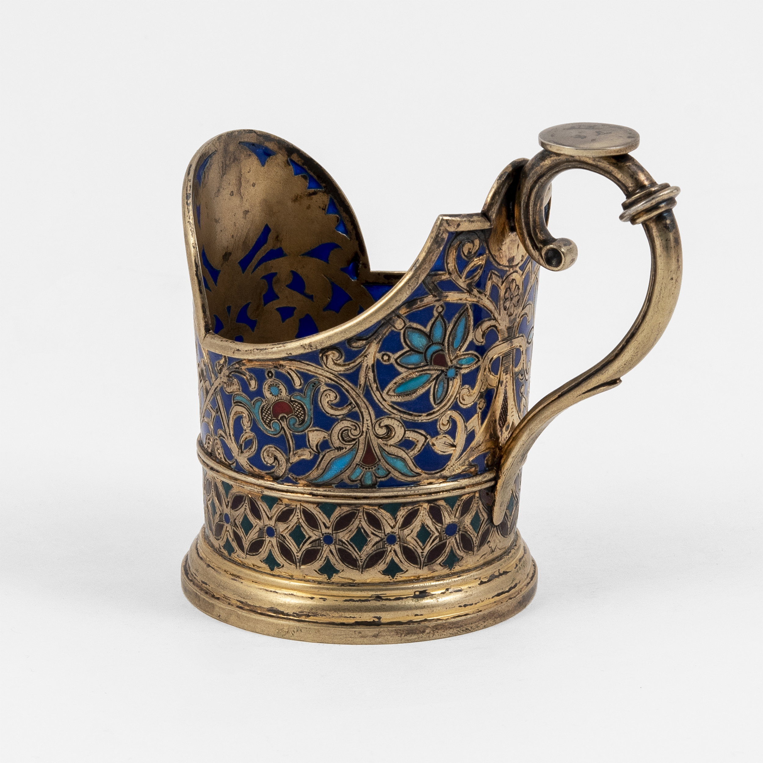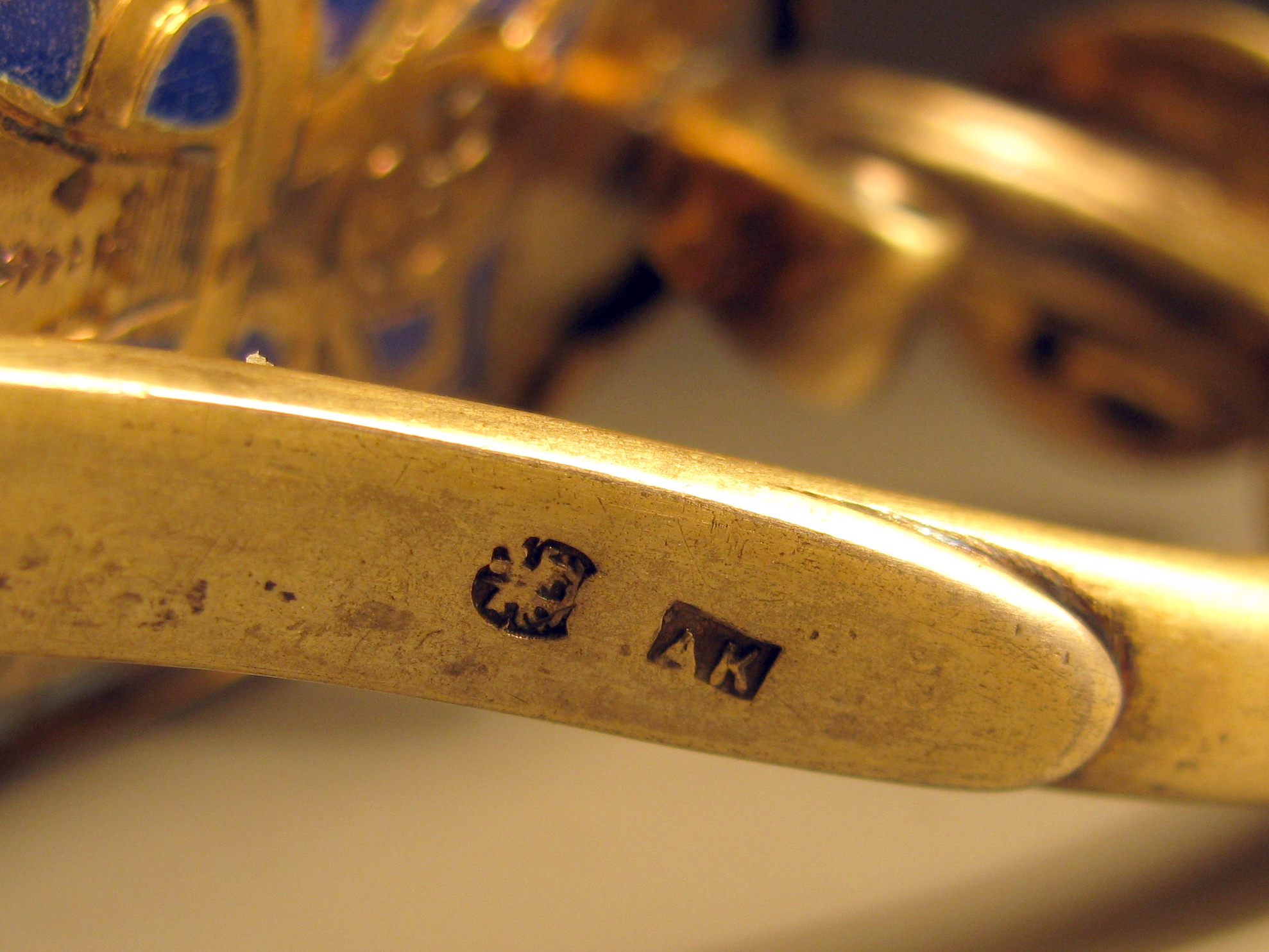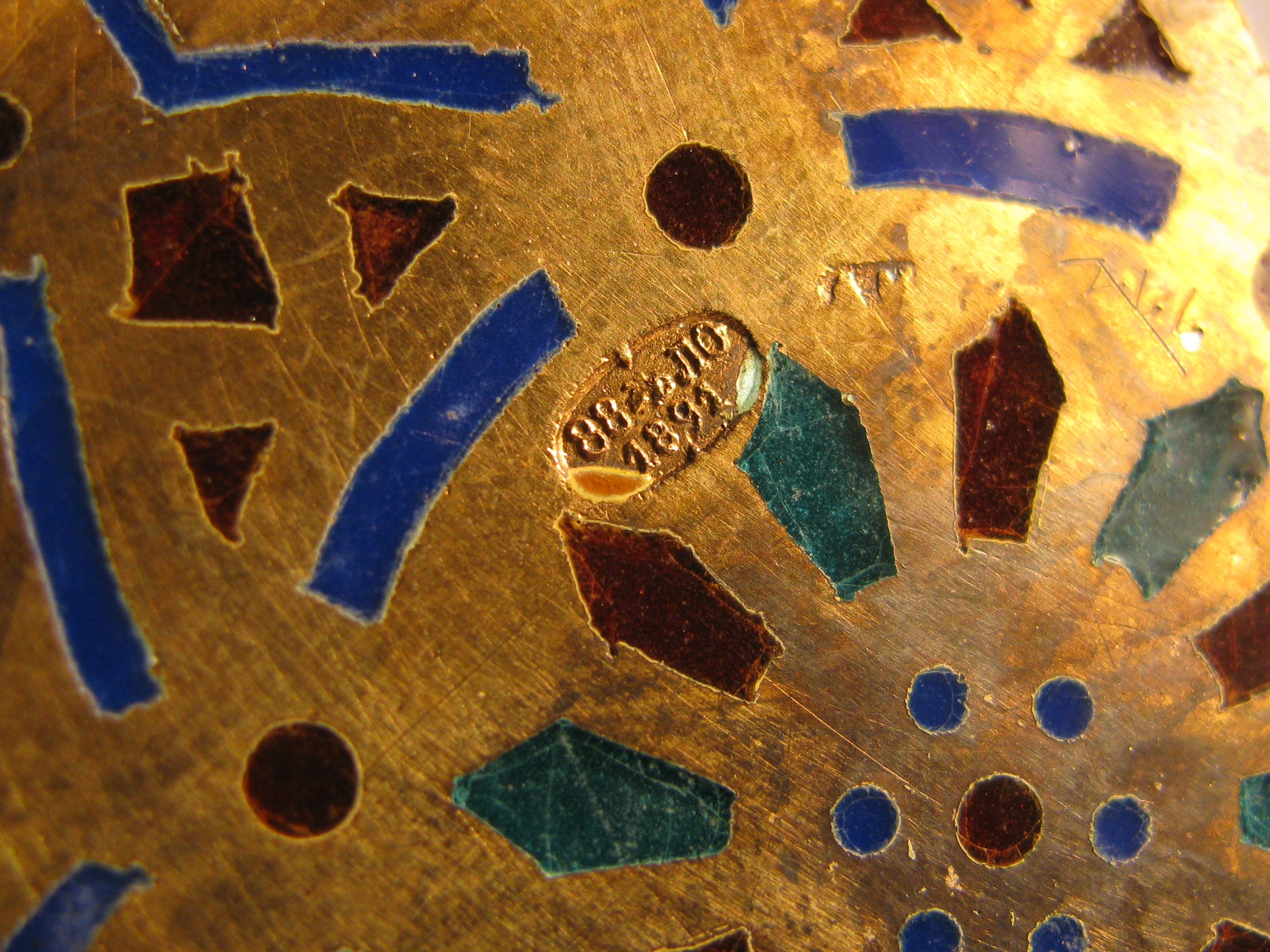 Клейма: 88 проба с изображением городского герба «Георгий Победоносец на коне», инициалов «ЛО» пробирного мастера Олекса Льва Фёдоровича (1890-1896 годы) и даты «1891» в одном щитке; именник мастера «АК» в прямоугольном щитке - мастерская Кузьмичева Антипа Ивановича;