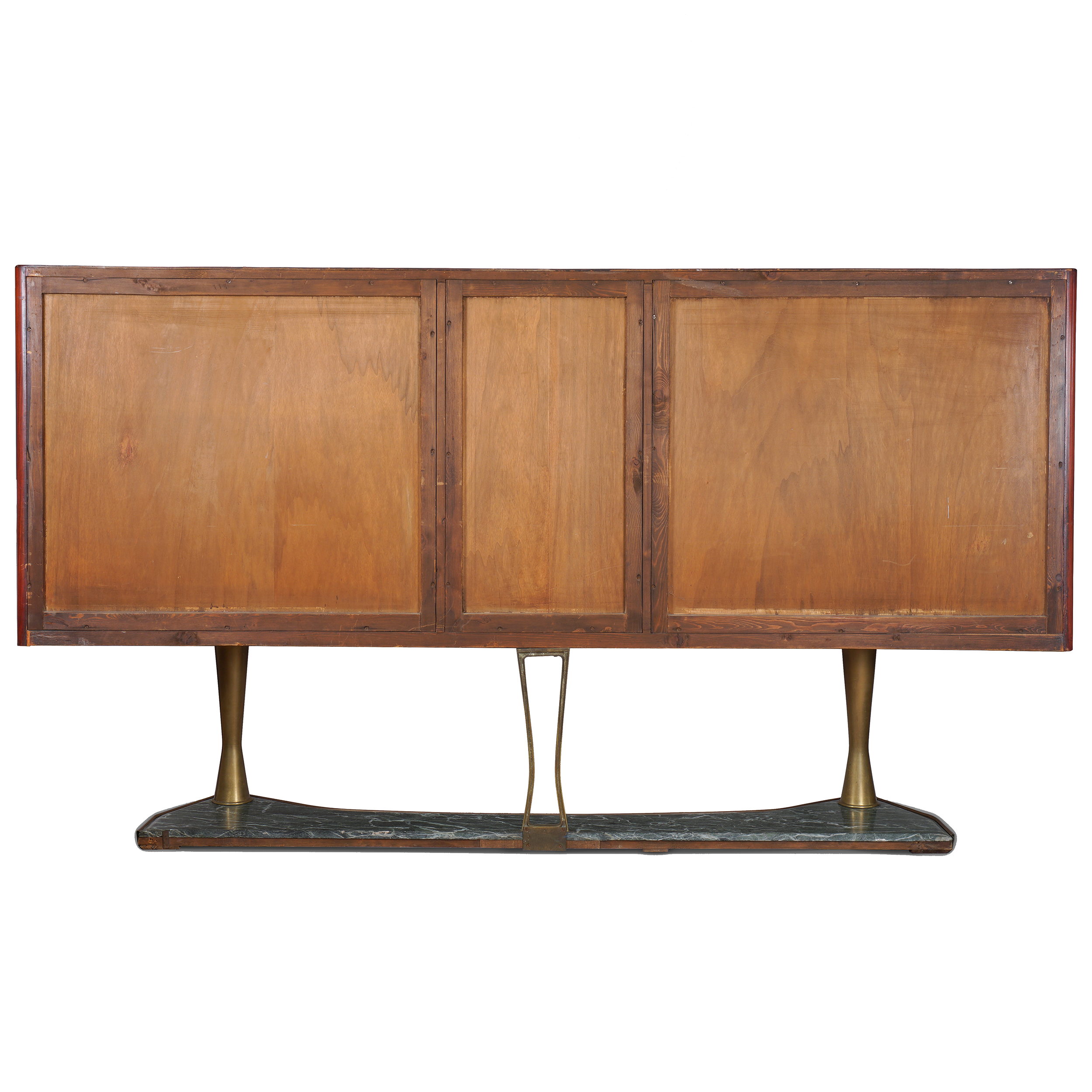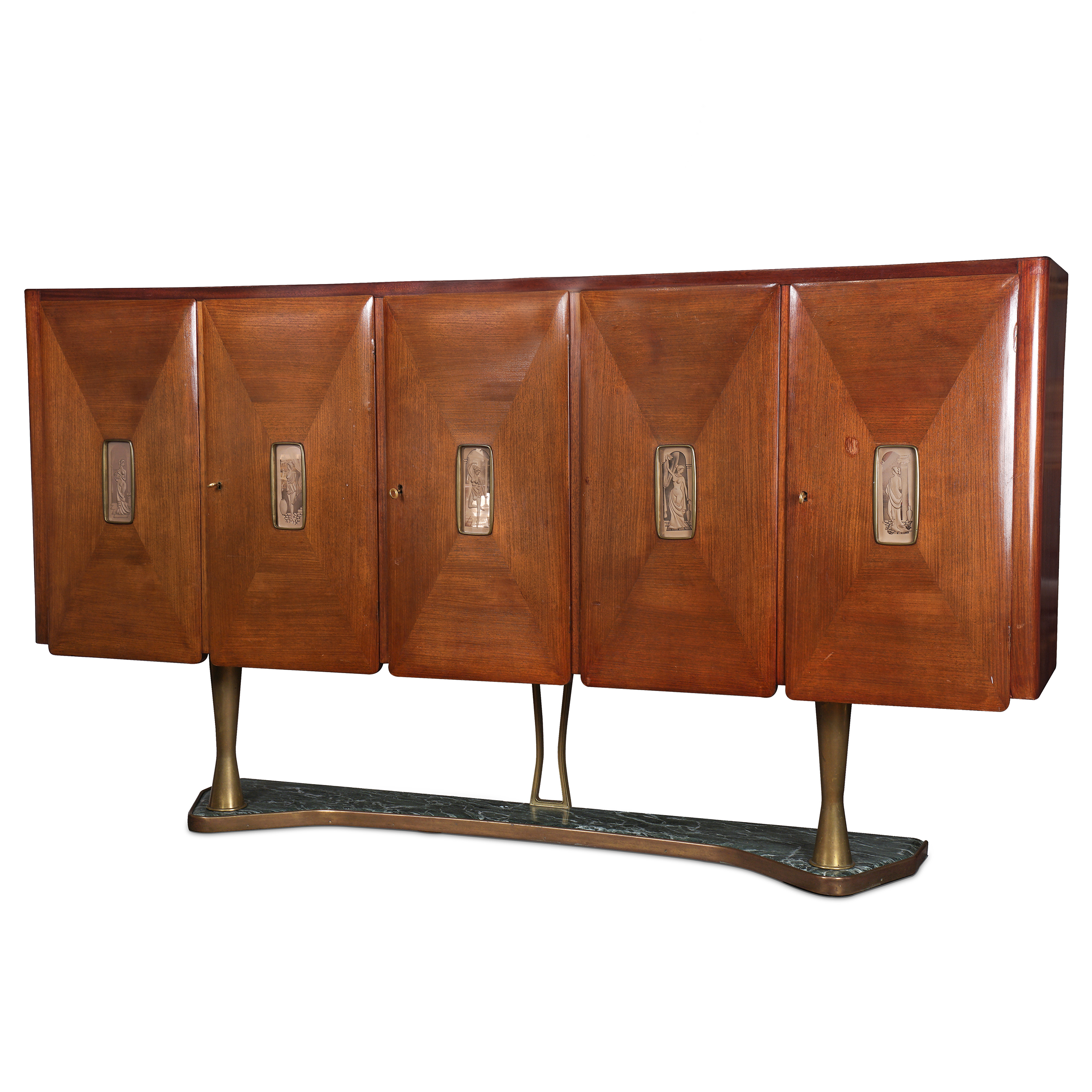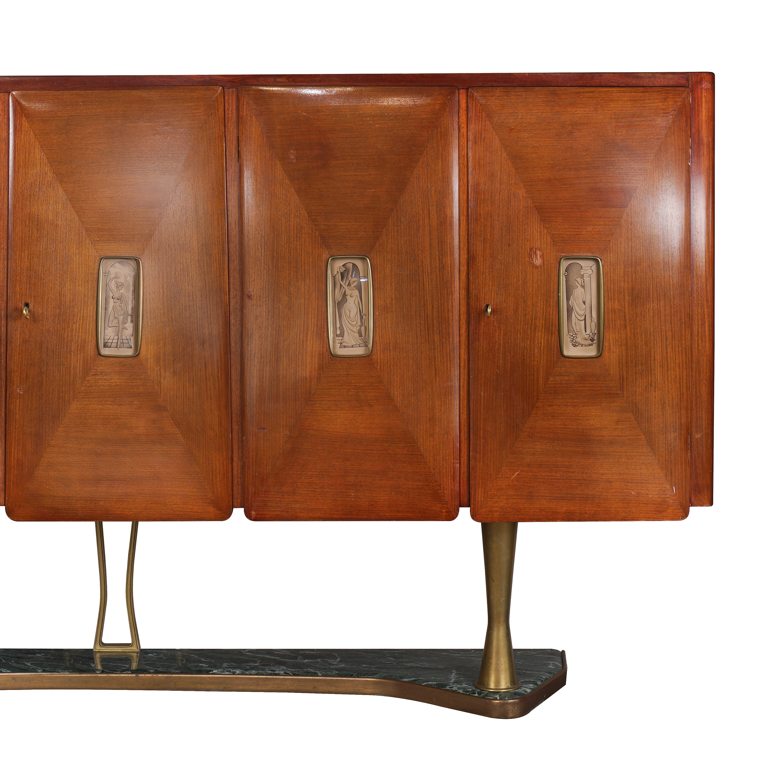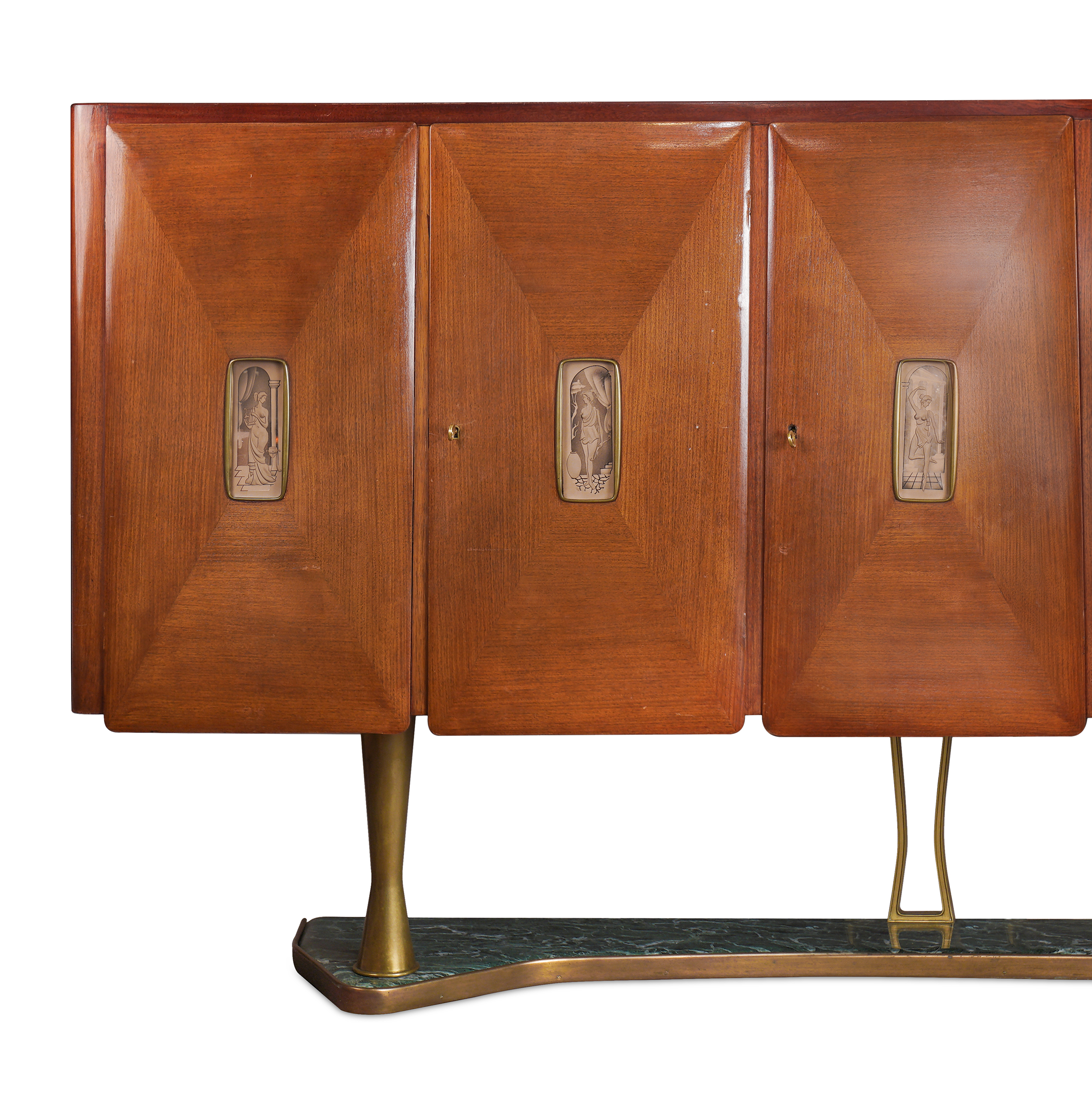 Красное дерево, бронзовые крепления, постамент из зеленого мрамора, в каждую из дверей вставлены стеклянные панели в технике «эгломизе», предположительно итальянский дизайнер Сильвио Каваторта (Silvio Cavatorta), Италия, около 1950 года. Размер (в/ш/г):