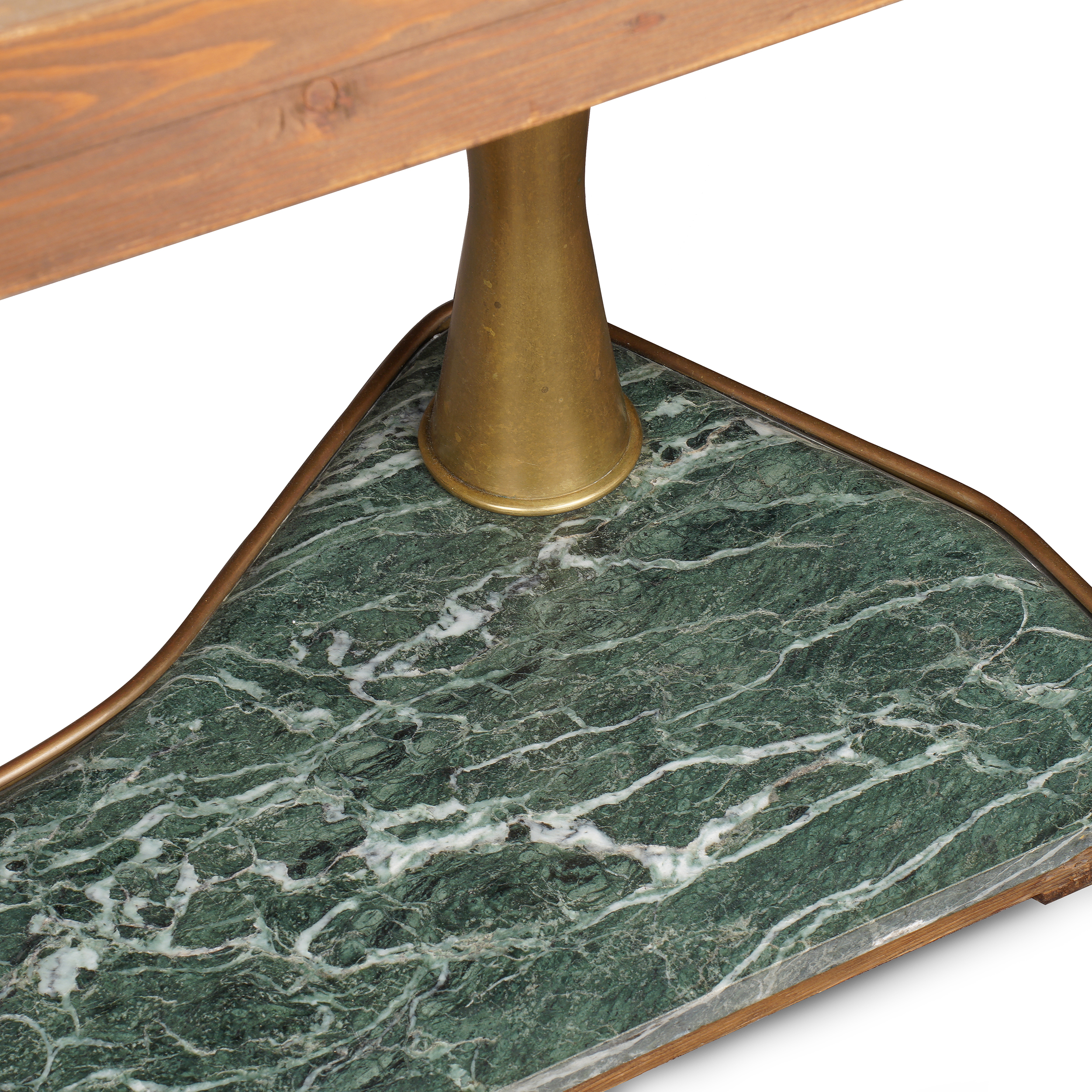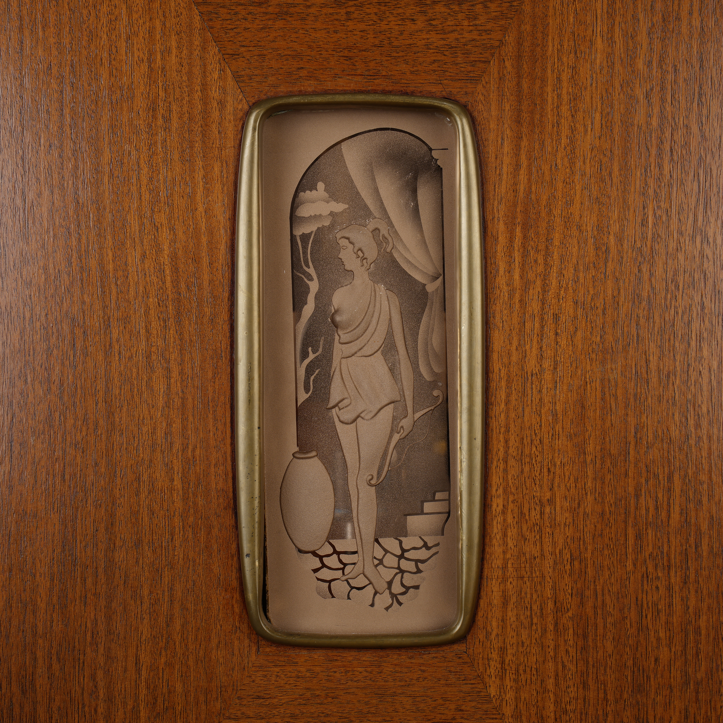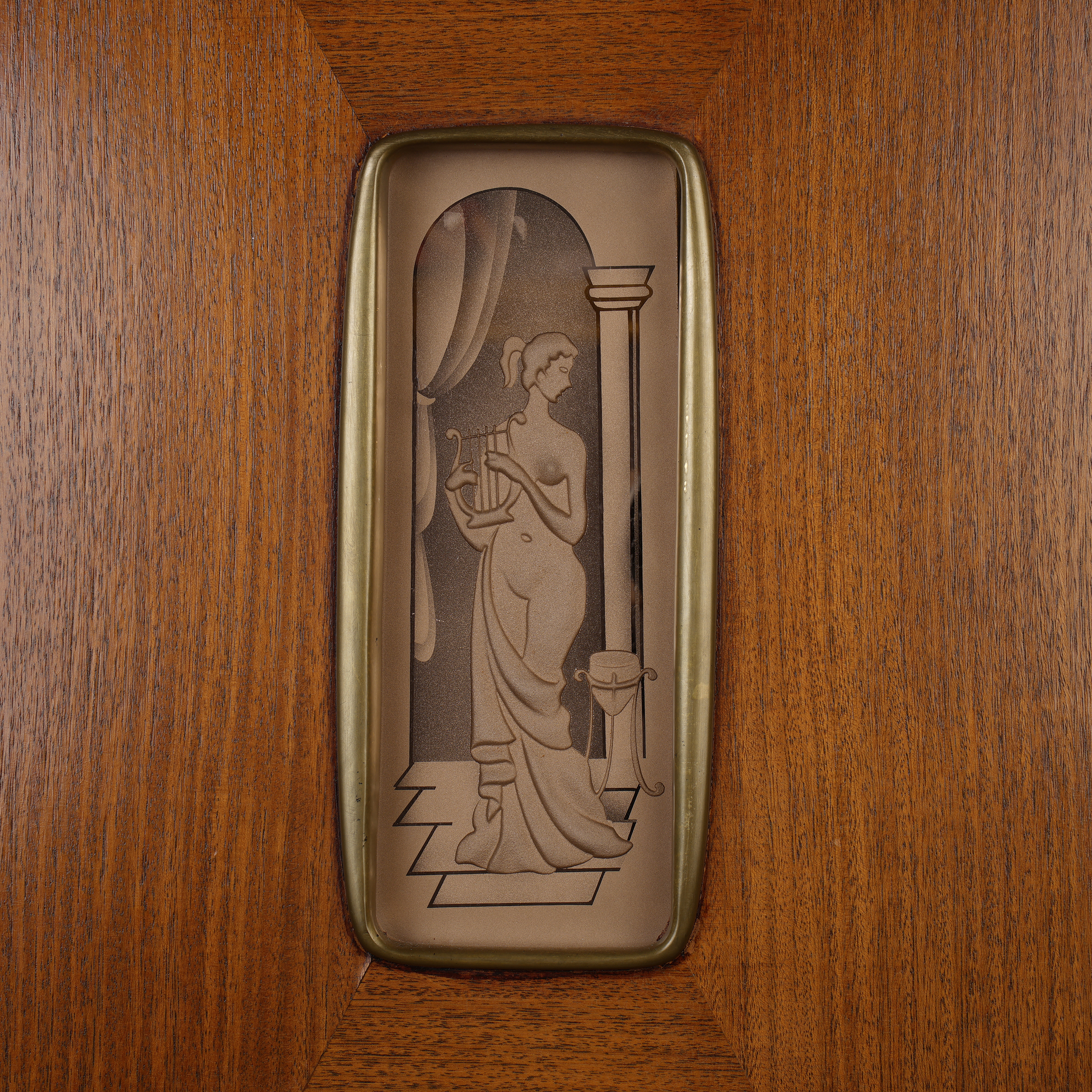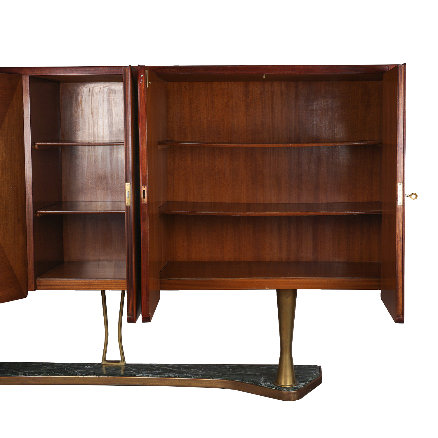 Красное дерево, бронзовые крепления, постамент из зеленого мрамора, в каждую из дверей вставлены стеклянные панели в технике «эгломизе», предположительно итальянский дизайнер Сильвио Каваторта (Silvio Cavatorta), Италия, около 1950 года. Размер (в/ш/г):