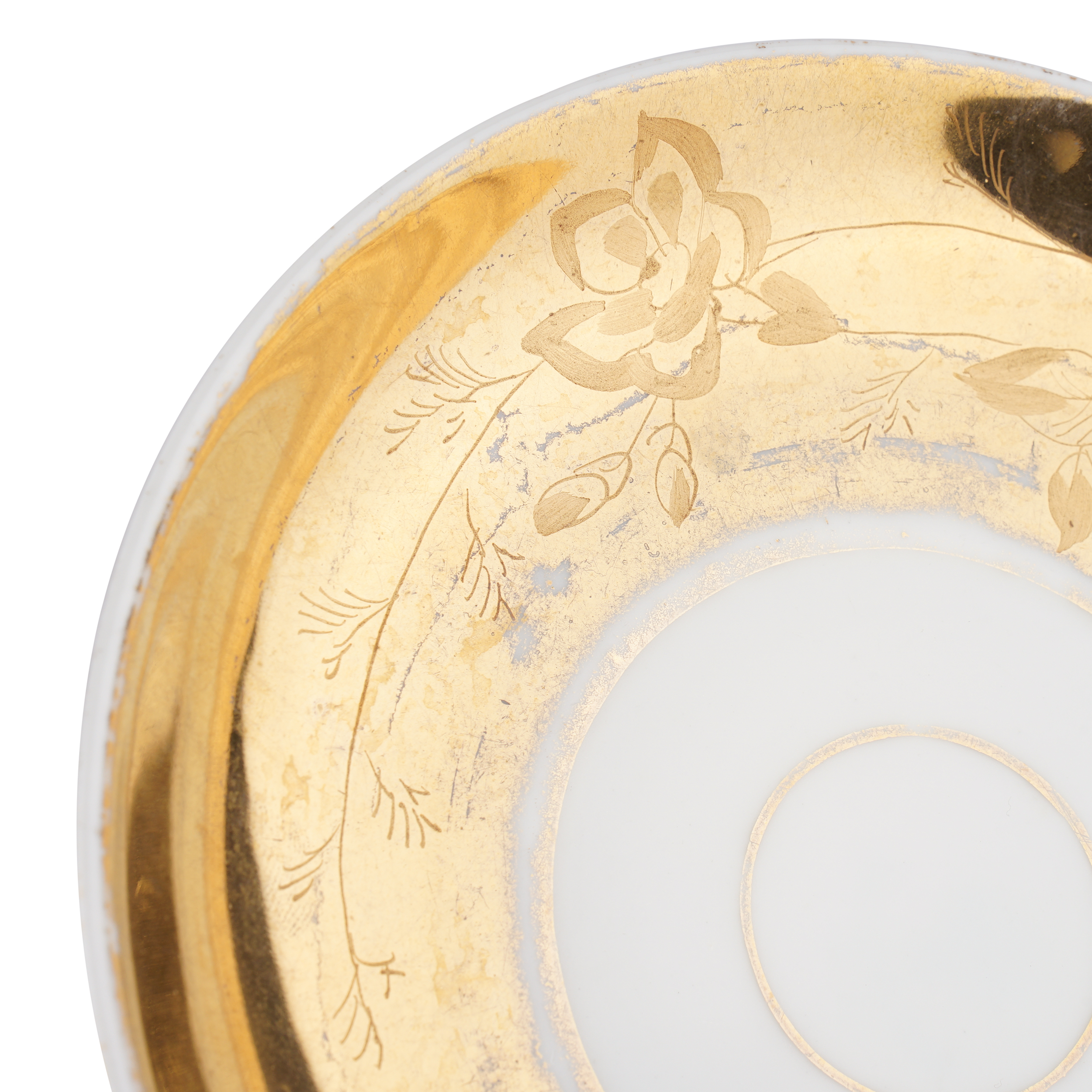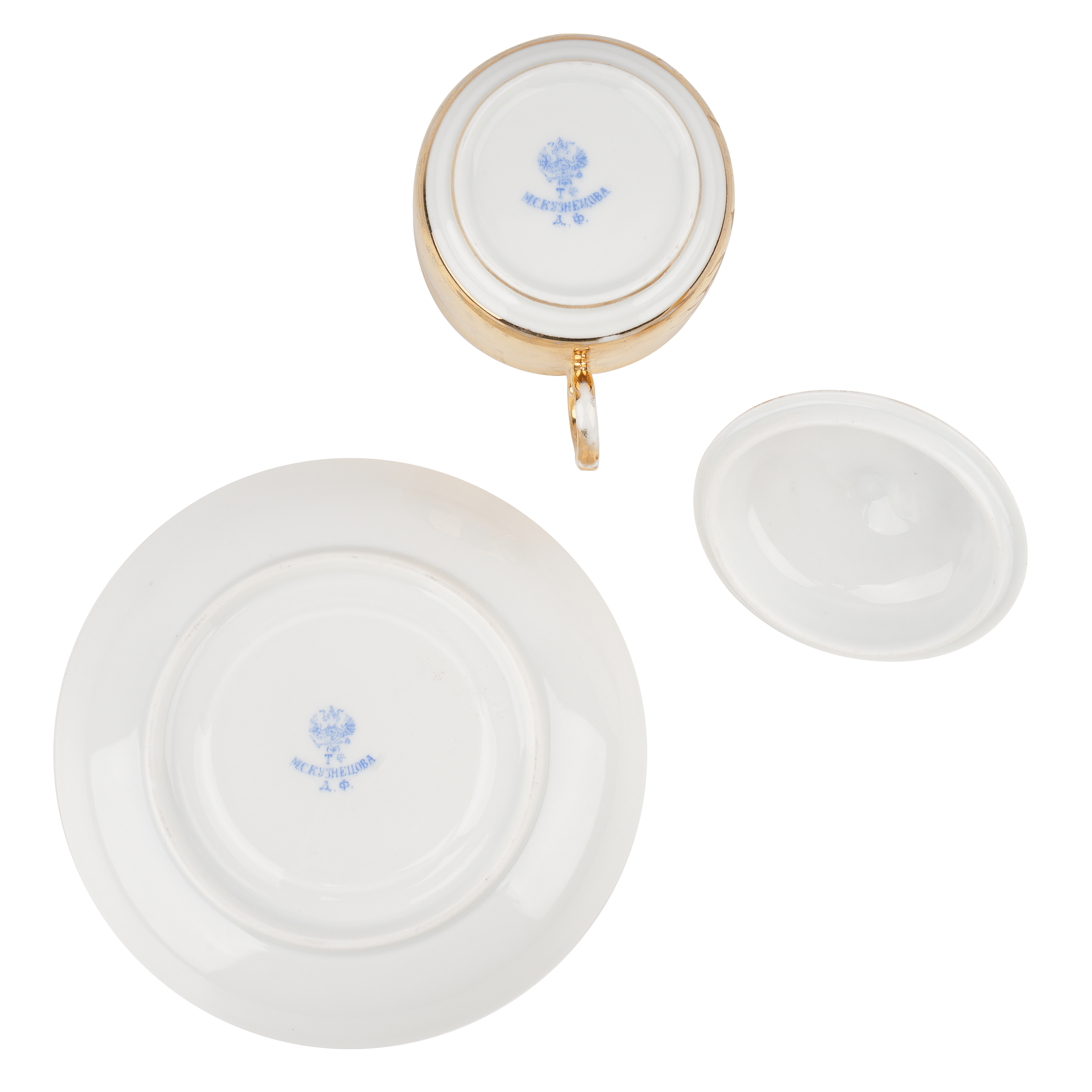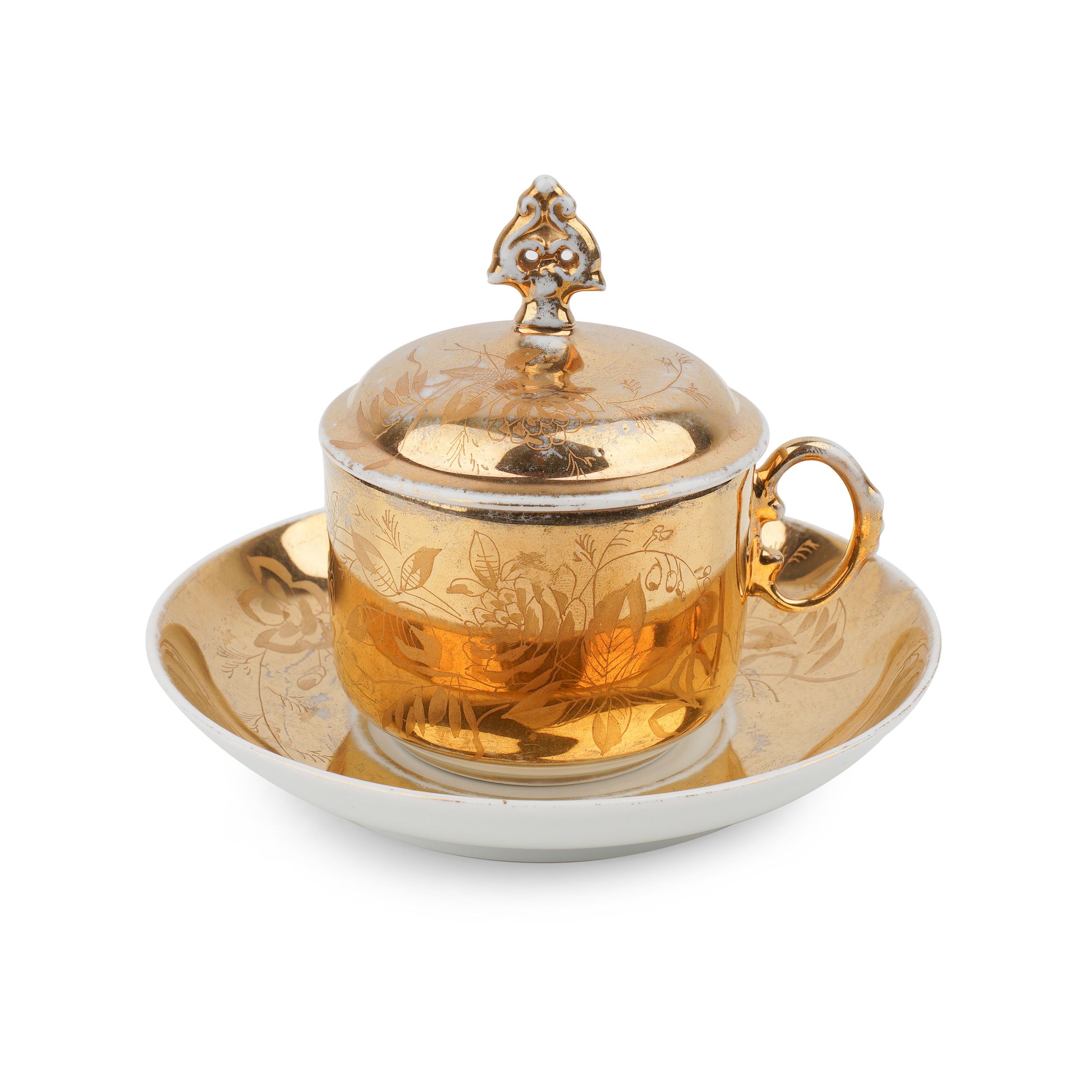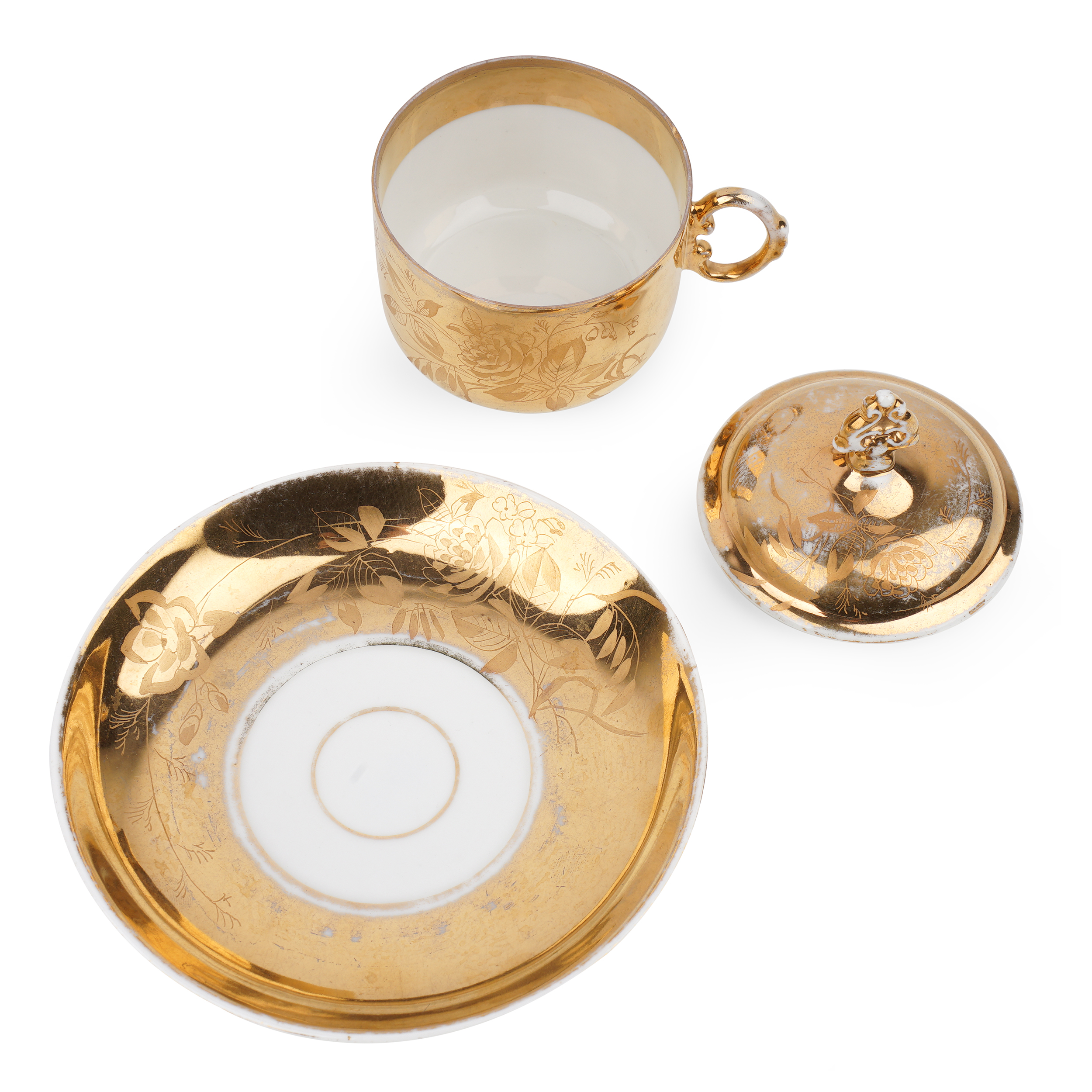 Состояние: Хорошее, потёртости золочения; незначительный скол с внутренней стороны борта чашки отреставрирован золотой краской; несквозная микротрещинка на внутренней стороне крышки