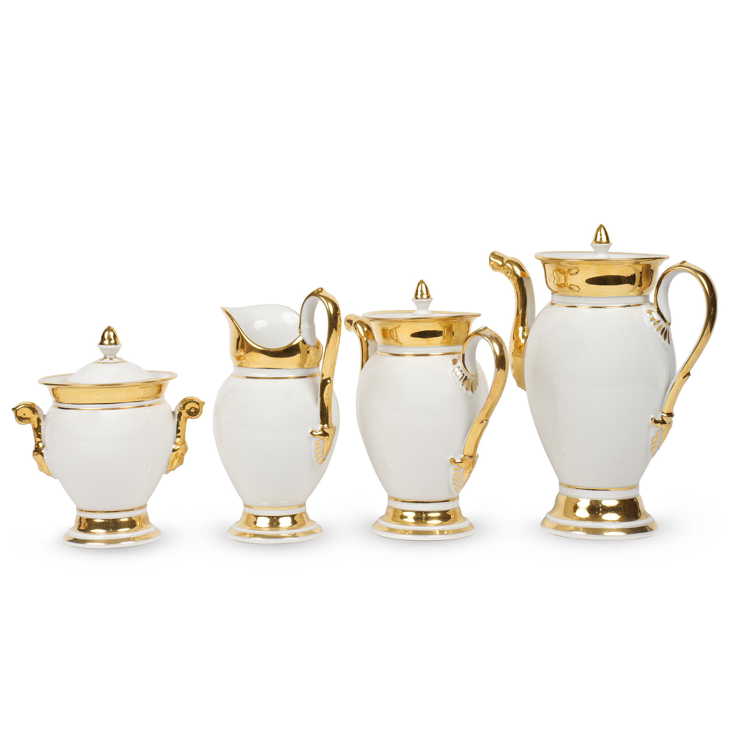 Чайник и кофейник, сахарница, молочник и 11 кофейных пар. Фарфор, бесцветная глазурь, разделка золотом, фигурные ручки выполнены в виде листьев аканта, носики чайника и кофейника - в виде лебедей; подглазурное клеймо кобальтом на сахарнице в виде «С», Европа, вторая половина XIX века, высота чайника – 25,5 см, кофейника – 22 см, молочника – 21 см, сахарницы – 17,5 см, чайной/кофейной пары – 6,4 см, диаметр блюдца – 12,7 см
