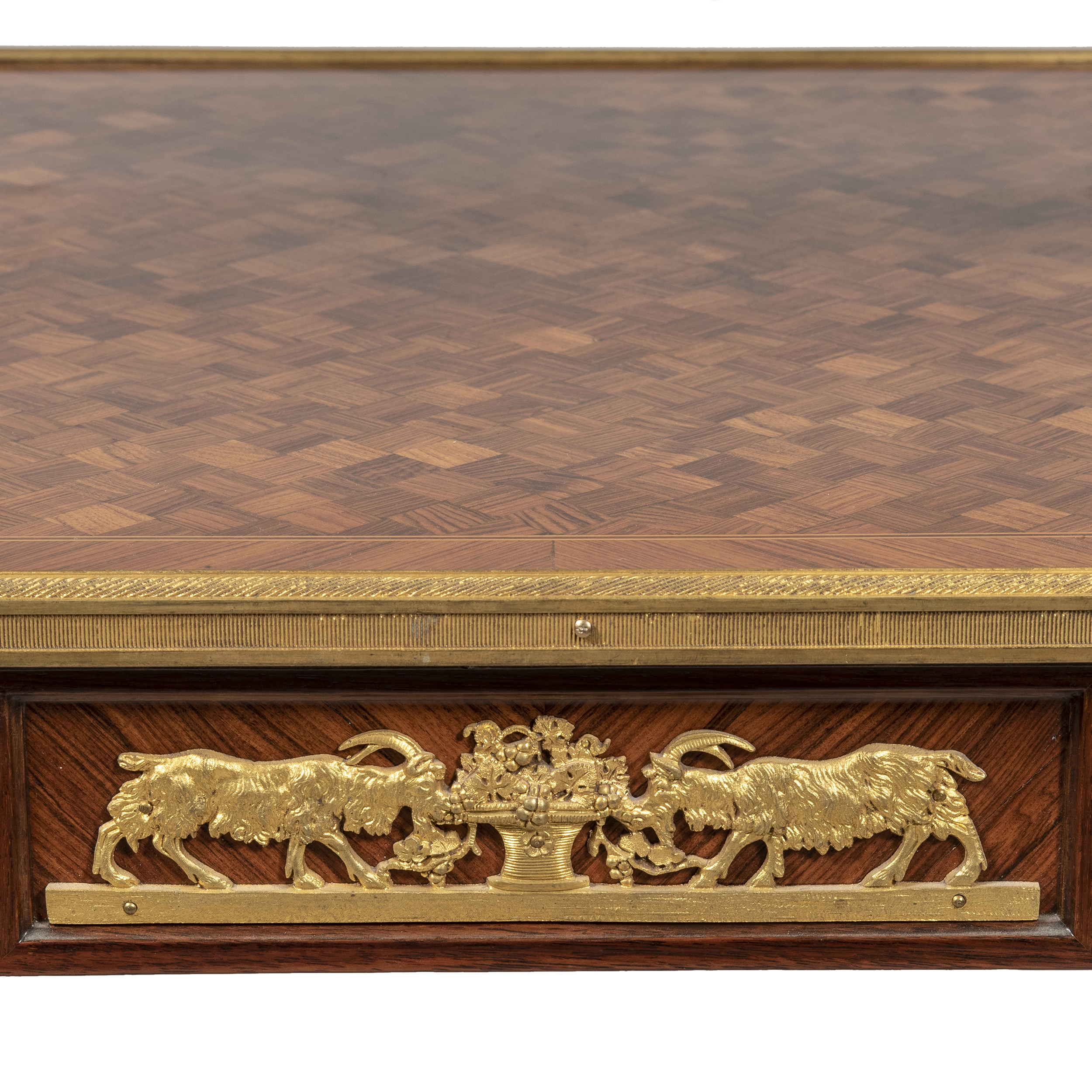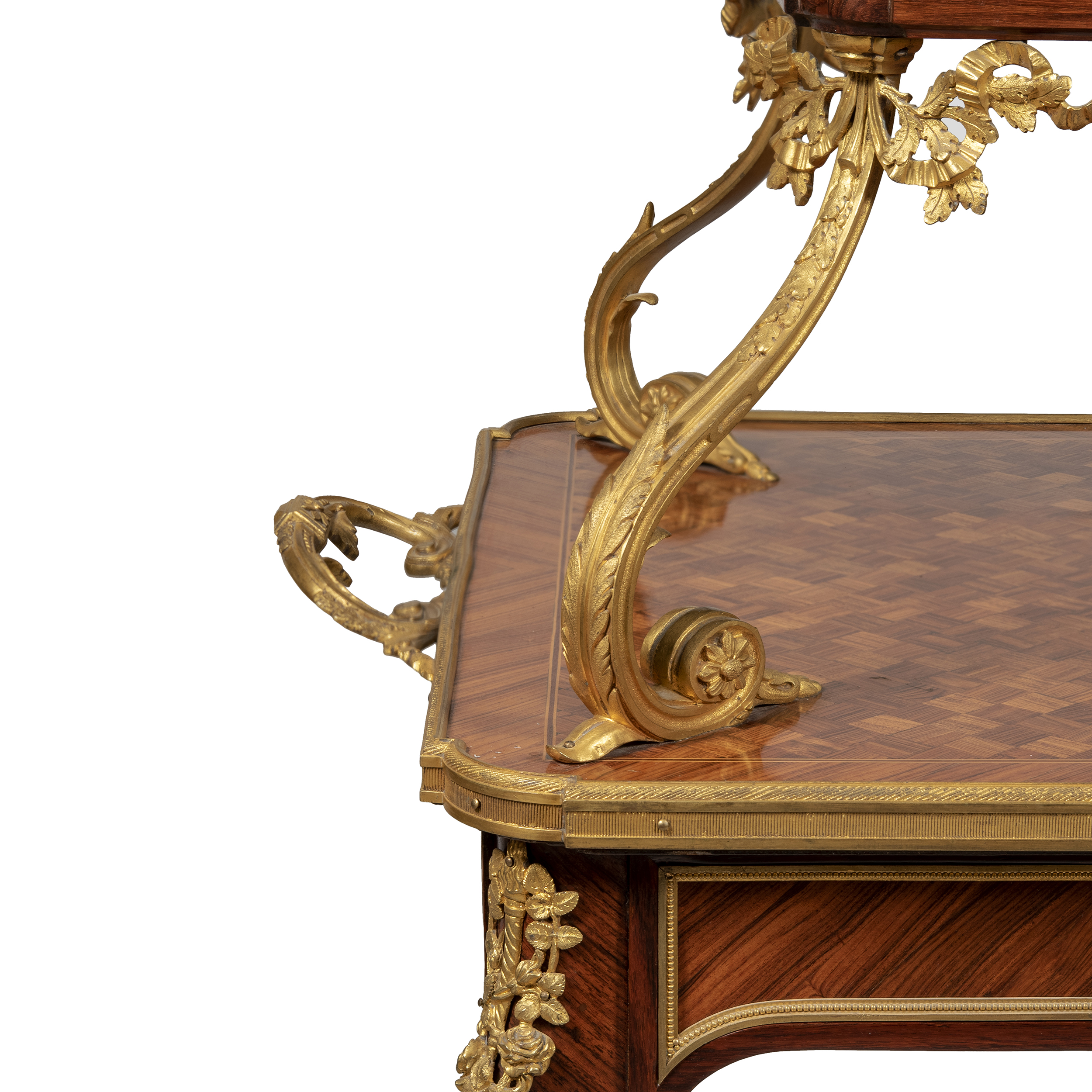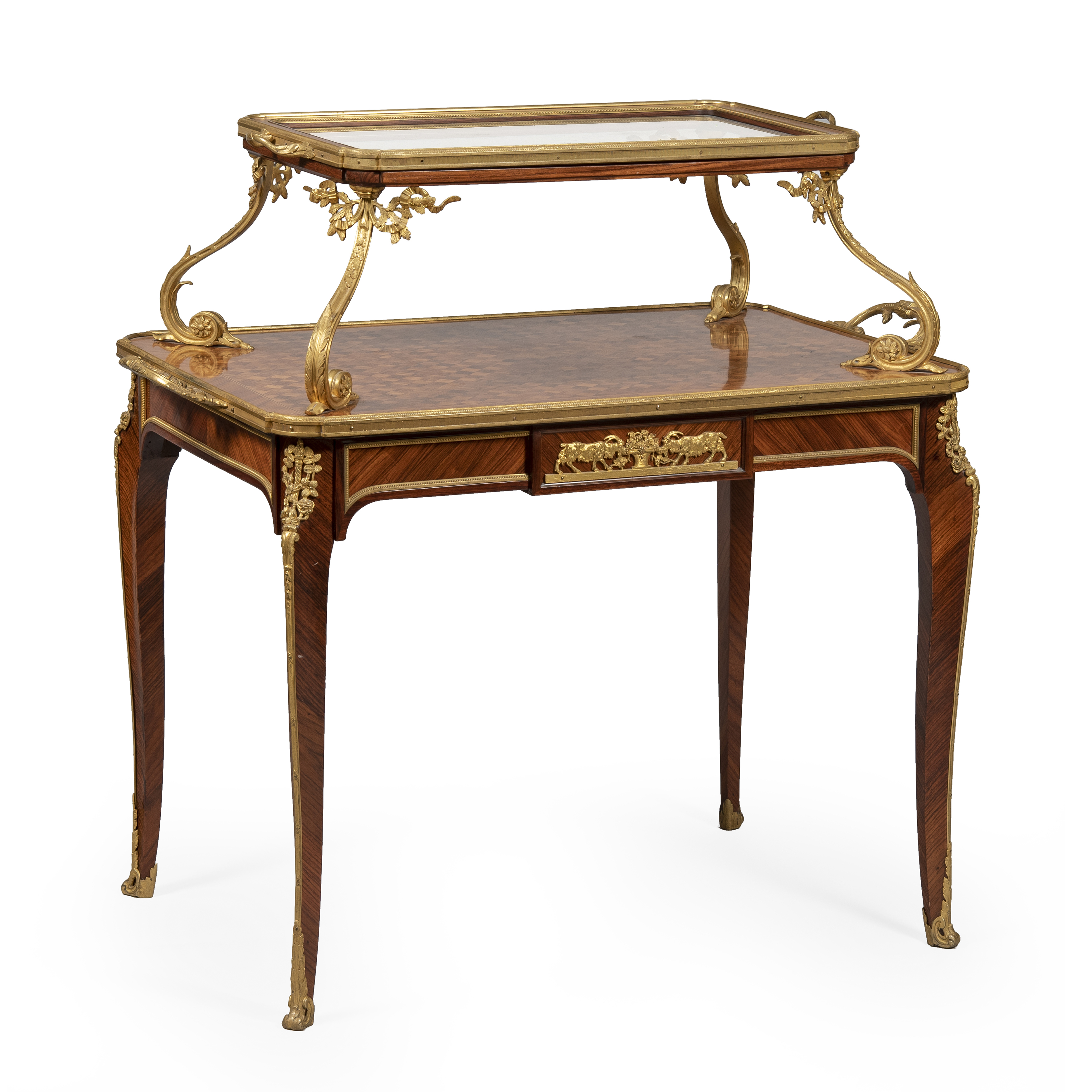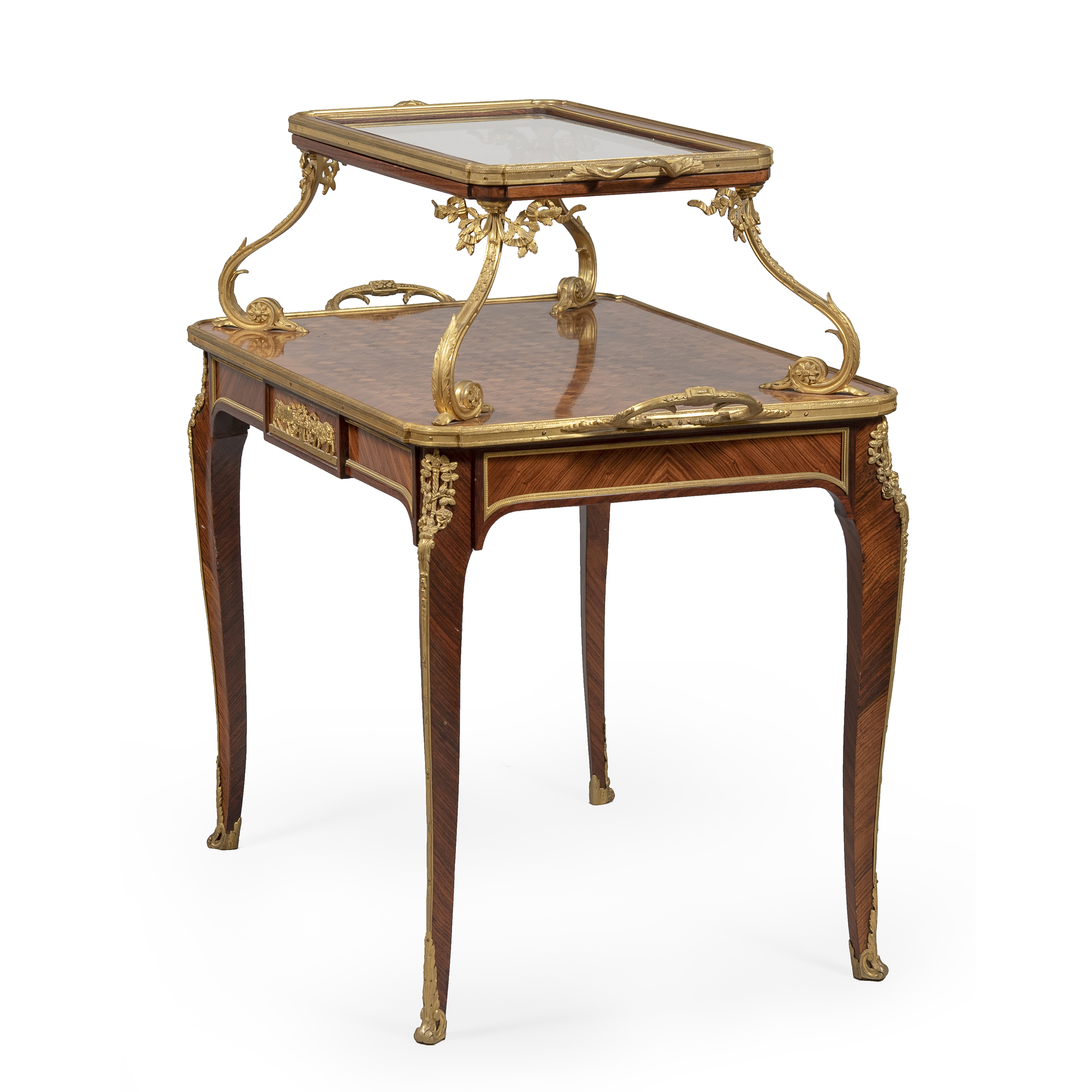 Двухъярусный столик со стеклянным подносом в бронзовой оправе. Выполнен в манере французского мастера Франсуа Линке (1855-1946). Палисандр, набор из различных пород, шпонирование, бронза, чеканка, золочение, стекло с фацетом, размер (в/ш/г): 91 х 79 х 54 см