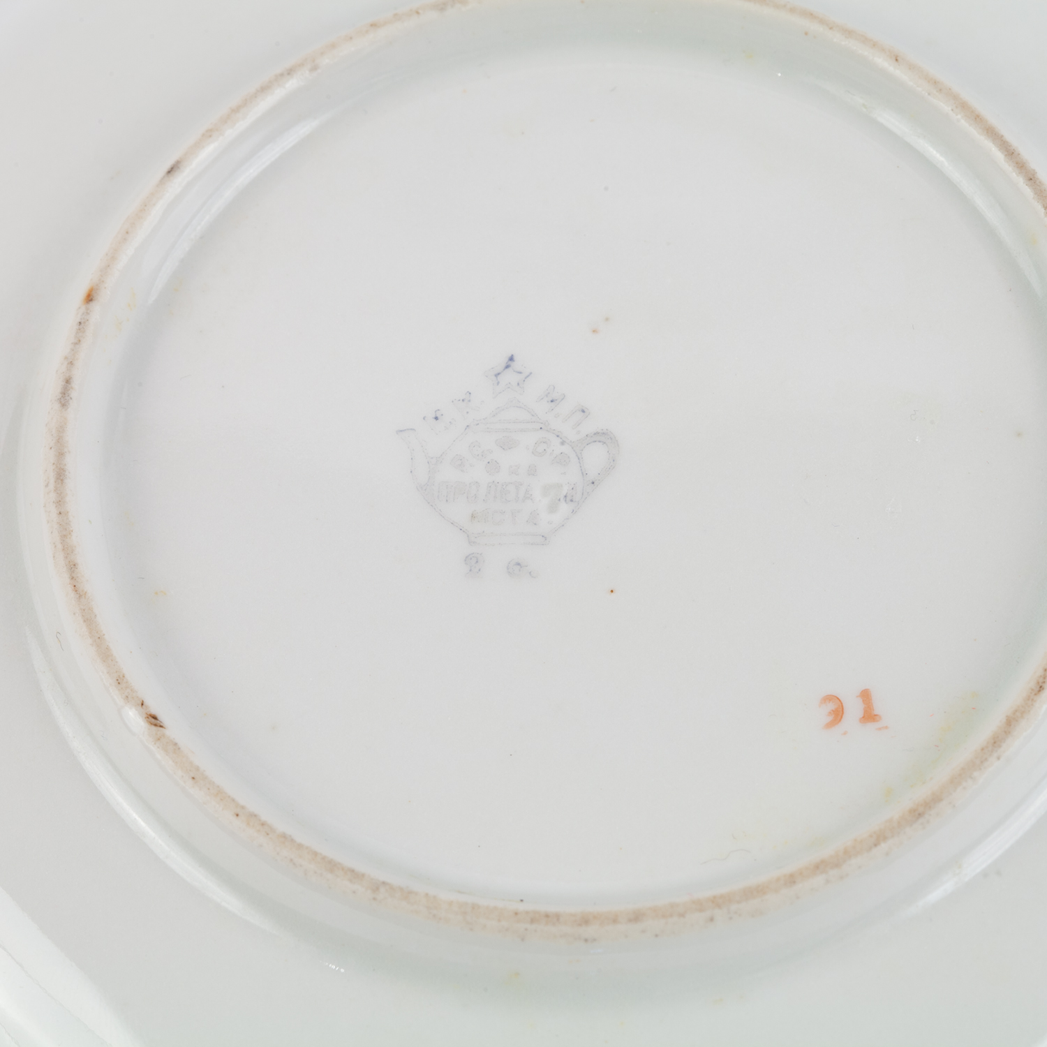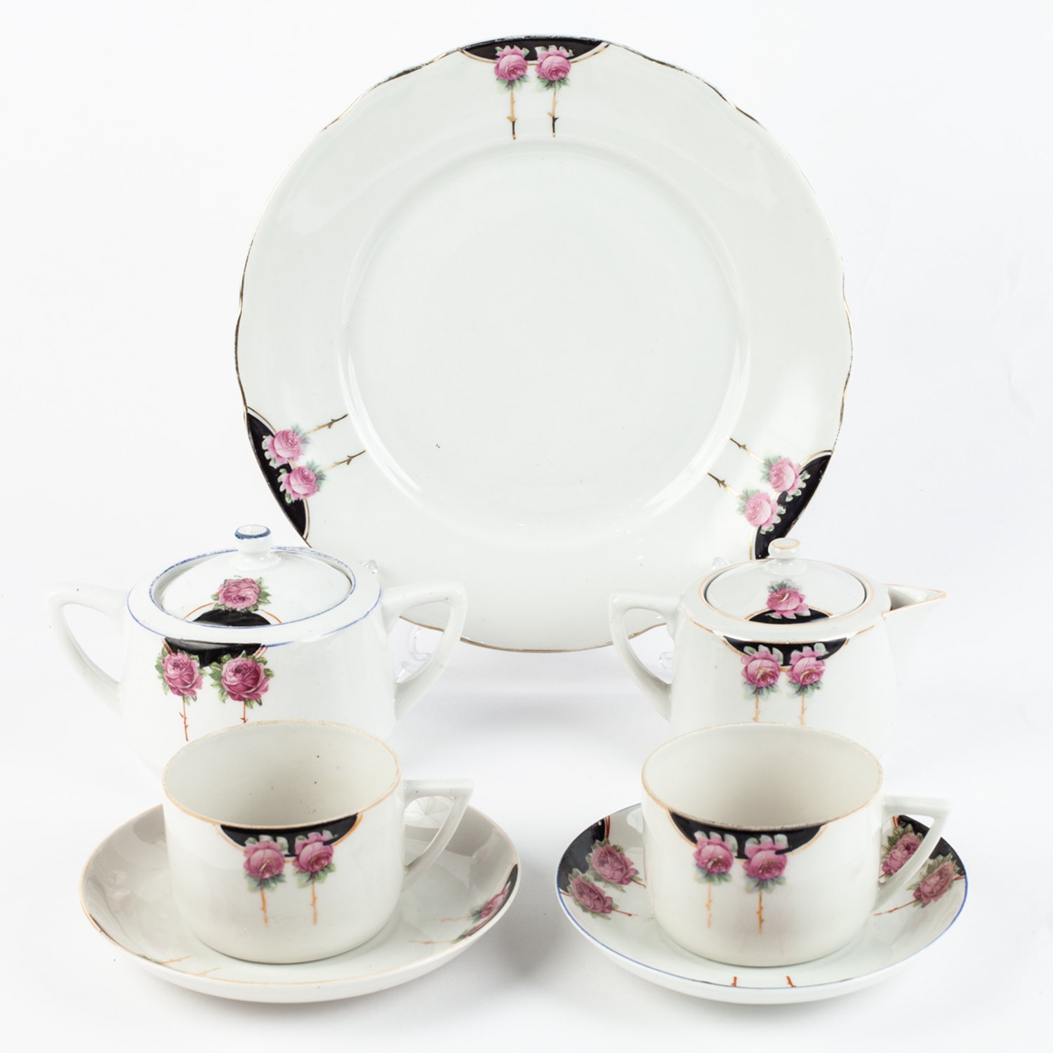 Две чайные пары, сливочник, сахарница, столовая тарелка. Фарфор, крытье черным, деколь, золочение, клейма: синее надглазурное клеймо "М.К. М.П., РСФСР Пролетарий МСТА" 1930-х - 1945-х годов (чайная пара, чашка, сливочник), синее надглазурное клеймо " РСФСР Пролетарий МСТА Лен. обл. Главунивермаг" 1930-х годов (тарелка столовая), зеленое надглазурное клеймо "НКМП Пролетарий МСТА" 1939-х -1940-х годов (блюдце, сахарница), фарфоровый завод Пролетарий с. Бронницы, Россия, размер: диаметр тарелки - 25 см, диаметр блюдца - 15,5 и 14,5 см, высота чашки - 5,5 см, высота сливочника - 9 см, высота сахарницы - 10 см