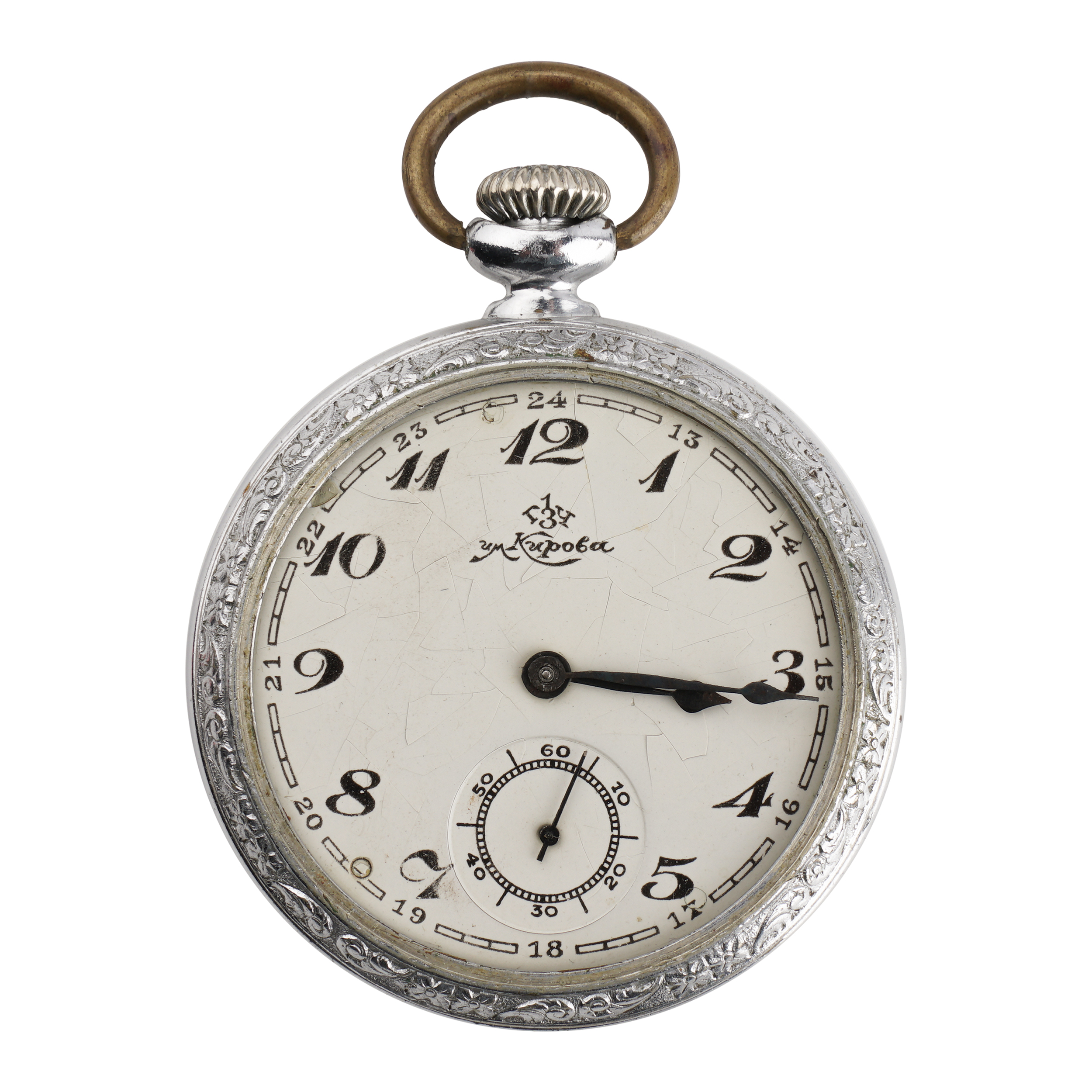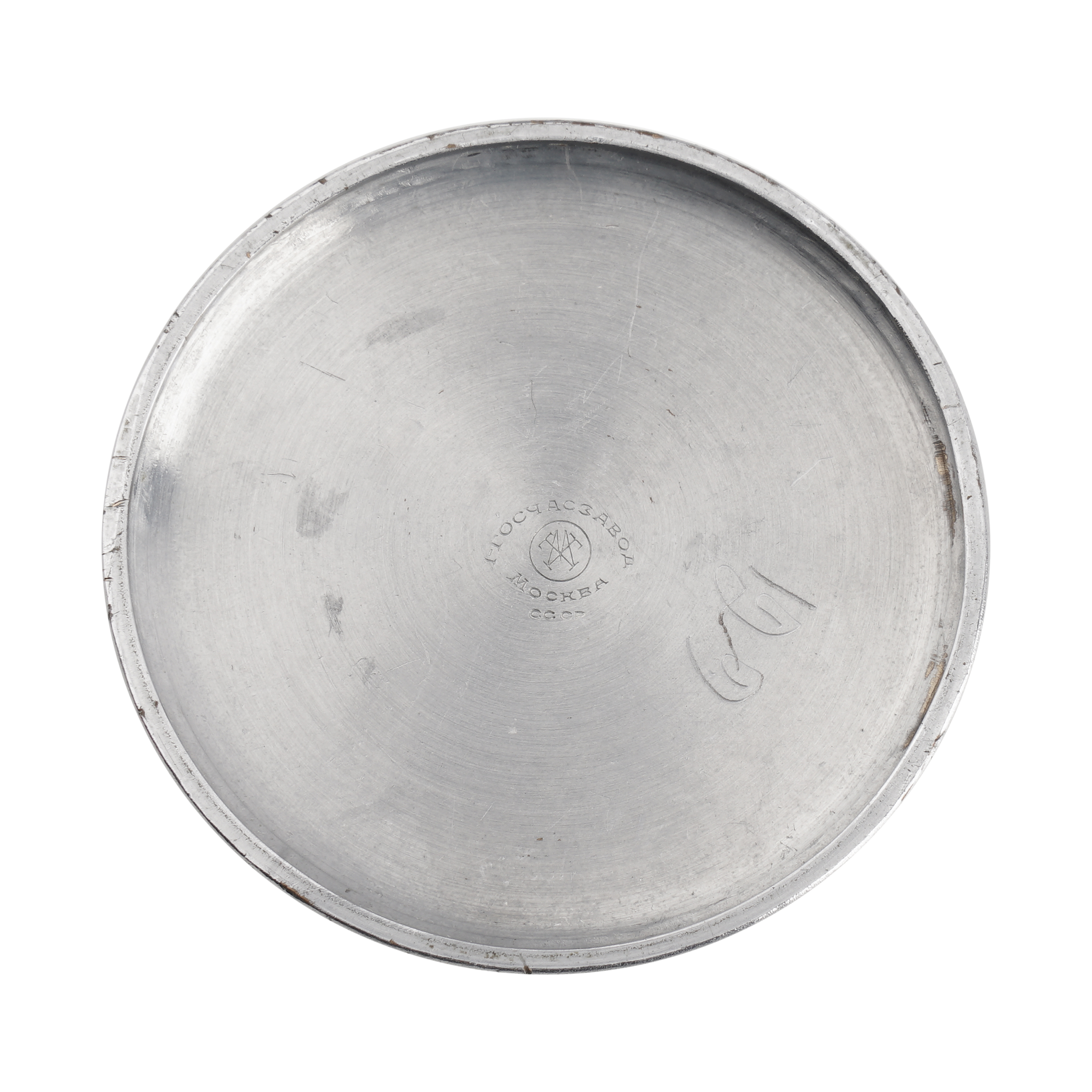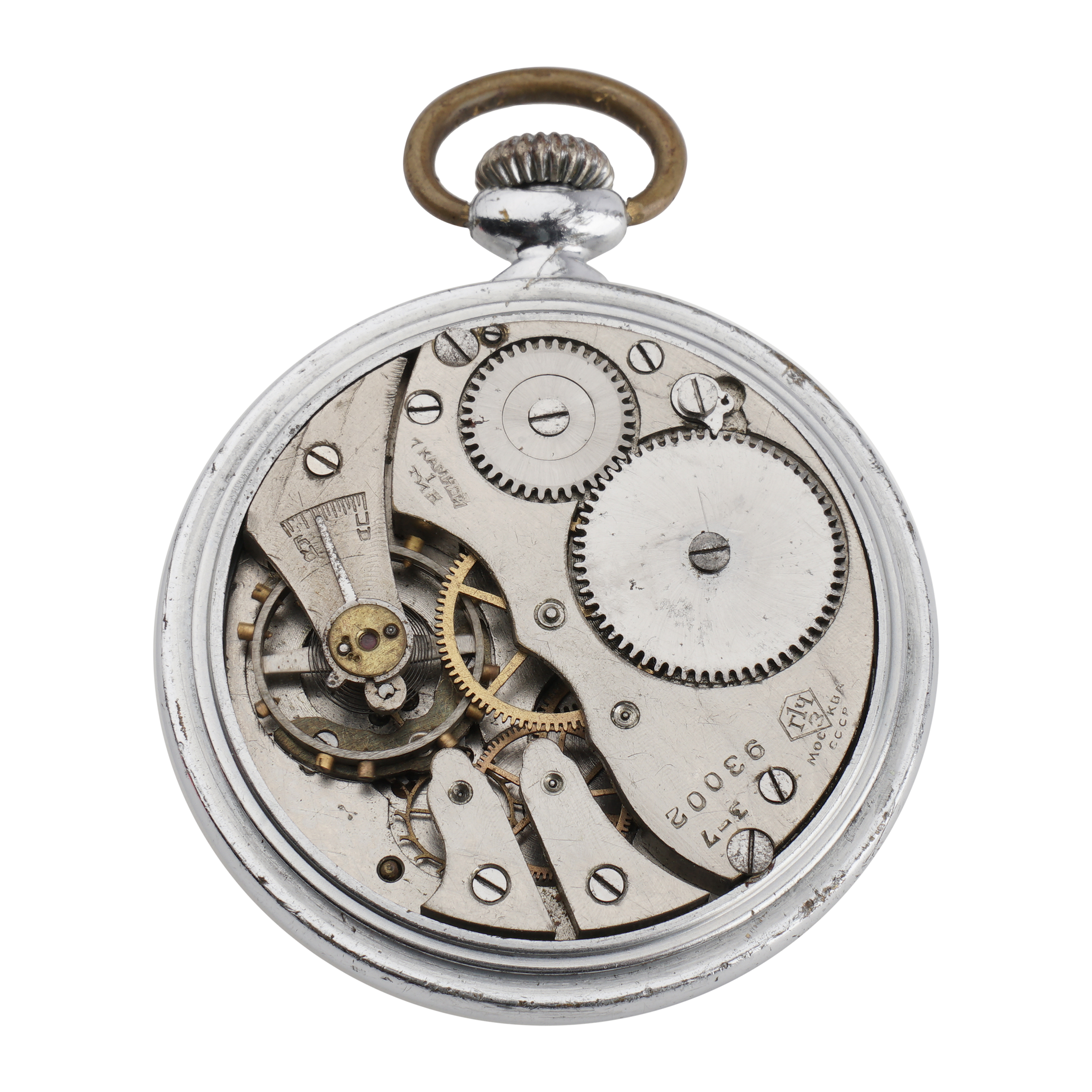 Металл, эмаль, гравировка, тип корпуса "мыло", ремонтуар. На задней крышке гравированная надпись "Передовому стахановцу Кривоносов Ц.У. т. Иванову Г.С. от Наркома Путей Сообщения 1936.4.23.". 1-ГОСЧАСЗАВОД, СССР, Москва, 1930-е гг., размер - 48 мм