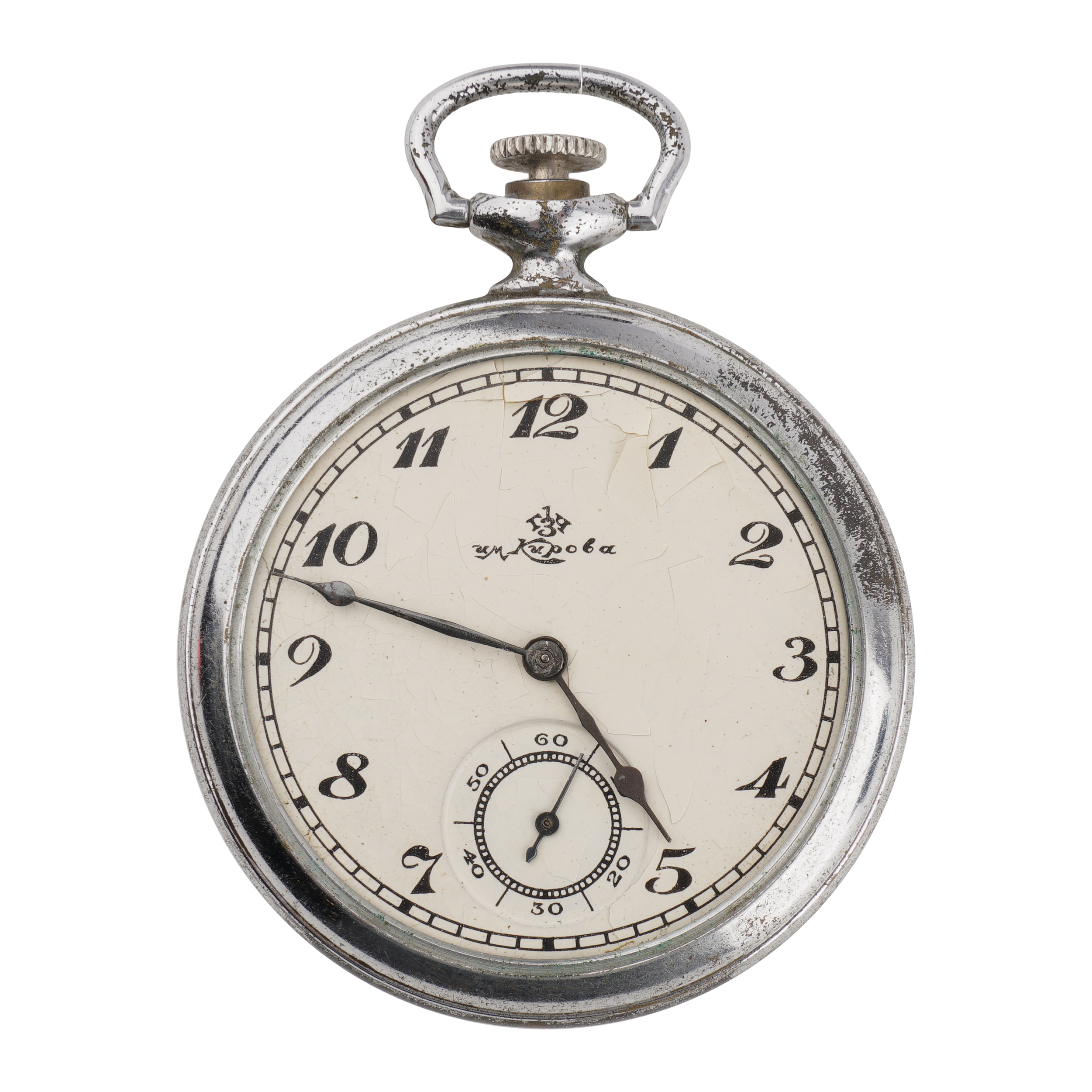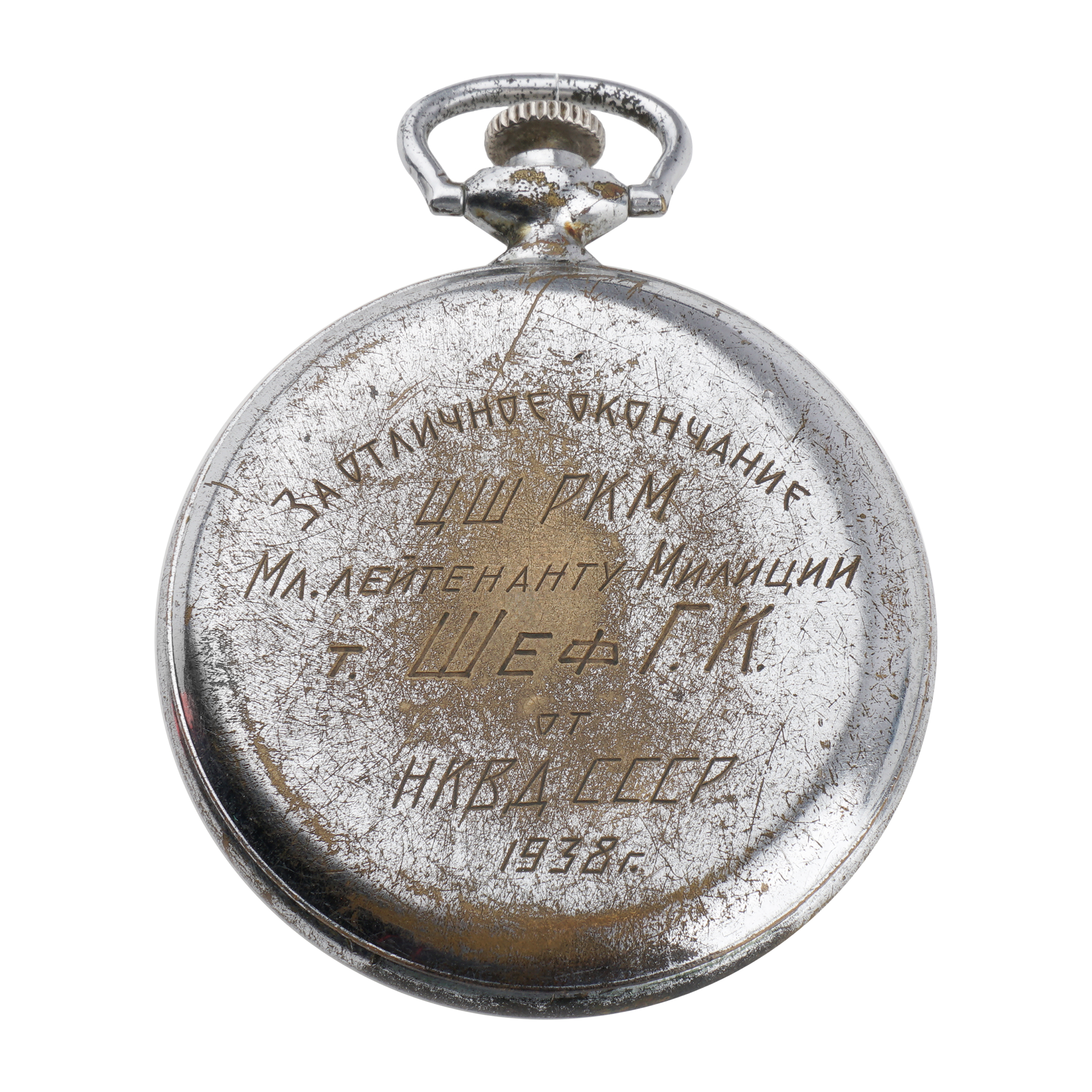 Никель, эмаль, гравировка, тип корпуса "мыло", ремонтуар. на задней крышке гравированная надпись "За отличное окончание ЦШ РКМ Мл. лейтенанту Милиции т.Шеф Г.К. от НКВД СССР 1938 г." 1-ГОСЧАСЗАВОД им. Кирова, Москва, 1935-1941 гг., размер - 50 мм