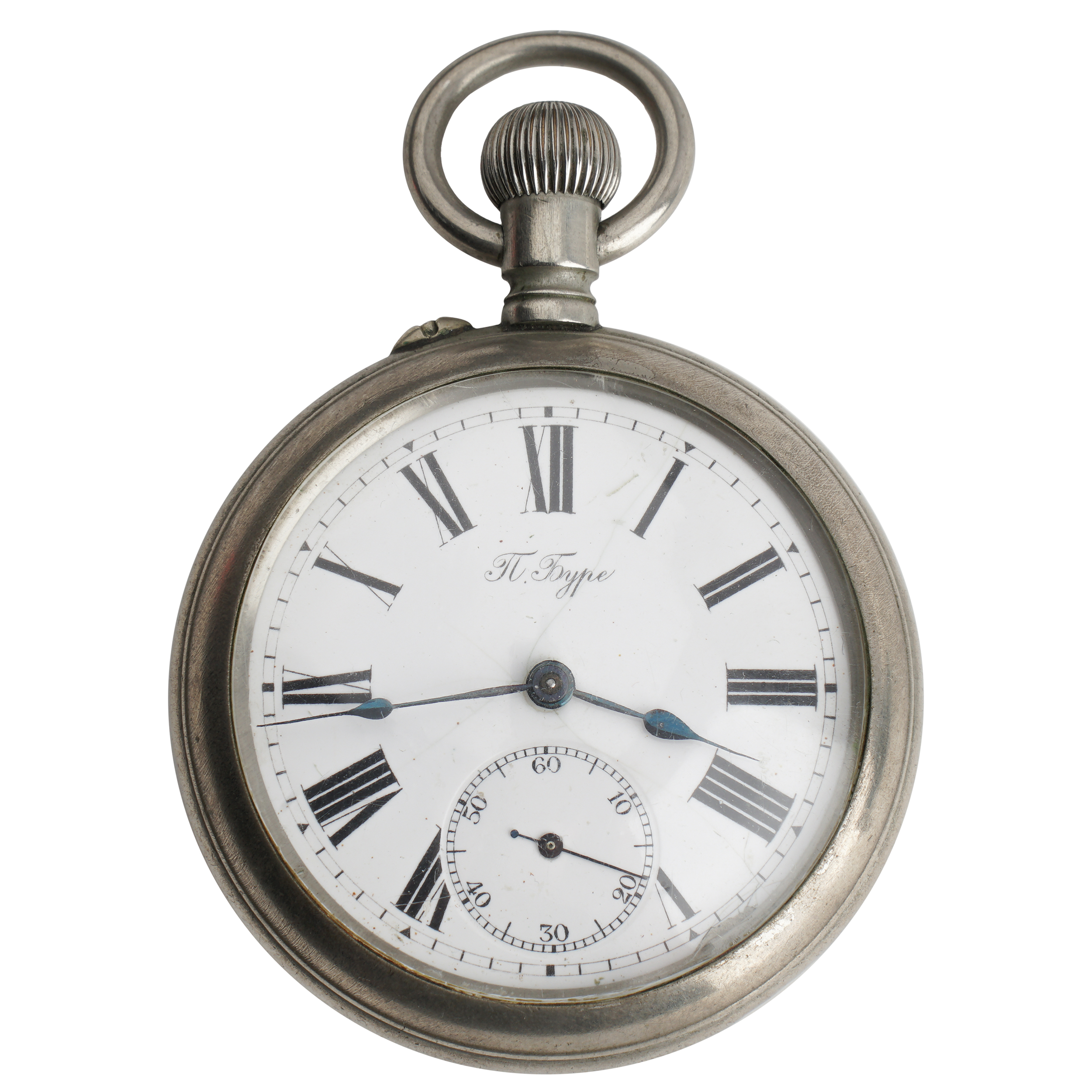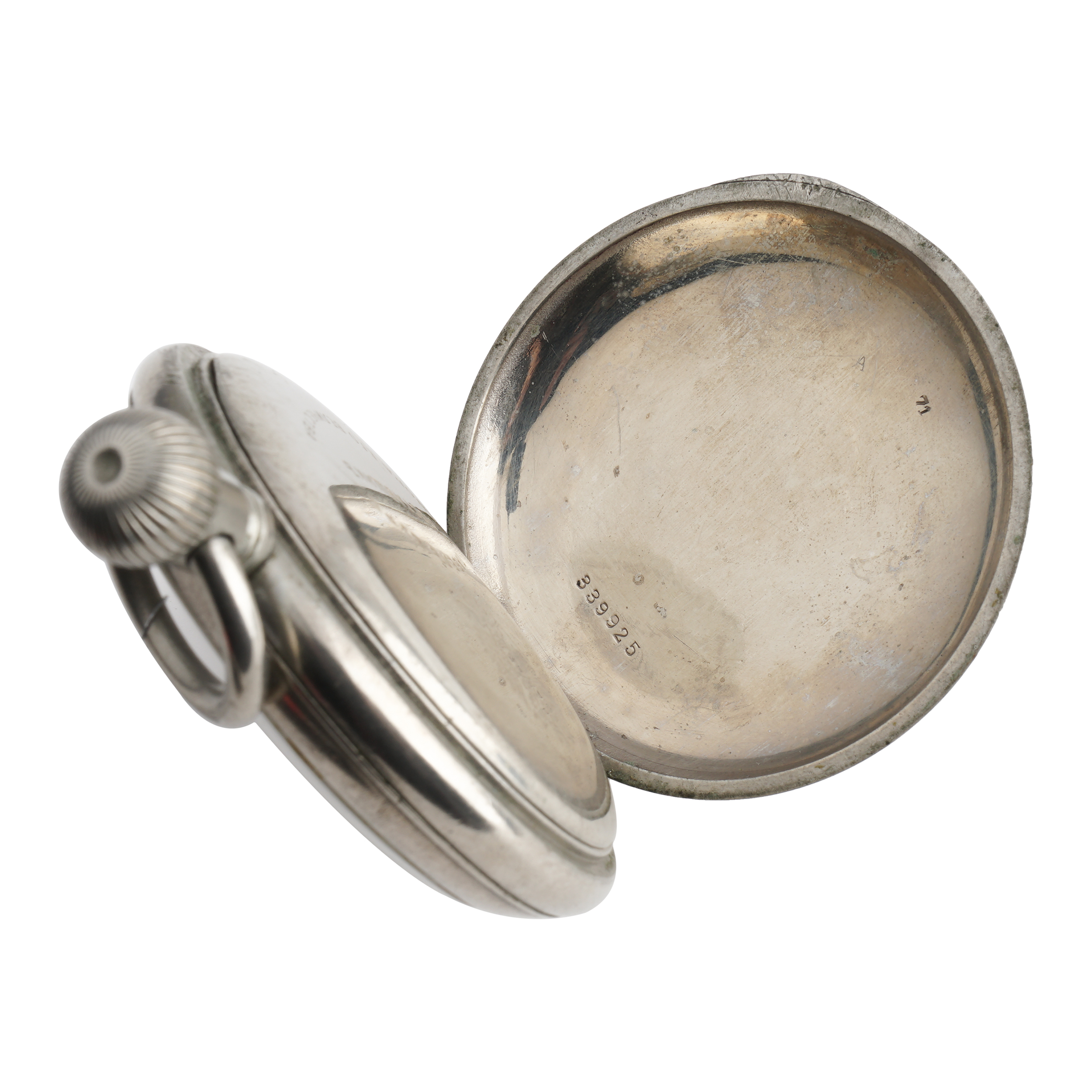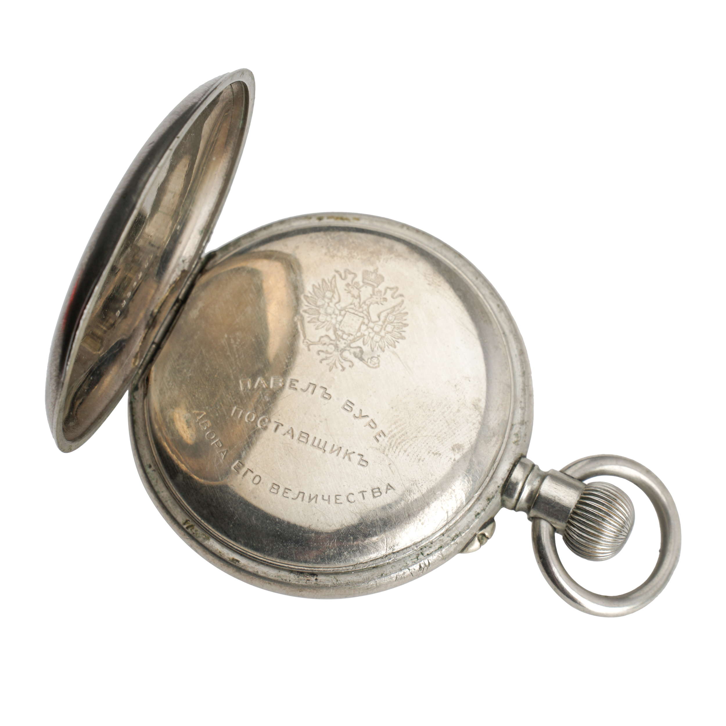 Никель, штамп, эмаль, тип корпуса "мыло", ремонтуар. На задней крышке штампованное изображение полкового герба и гравированная надпись "Ст. ун.-оф. Ивану Ефимову отъ ротн. л-ра.". Россия, торговый дом "Павел Буре", 1920-е годы, размер - 56 мм, вес ± 140 грамм.