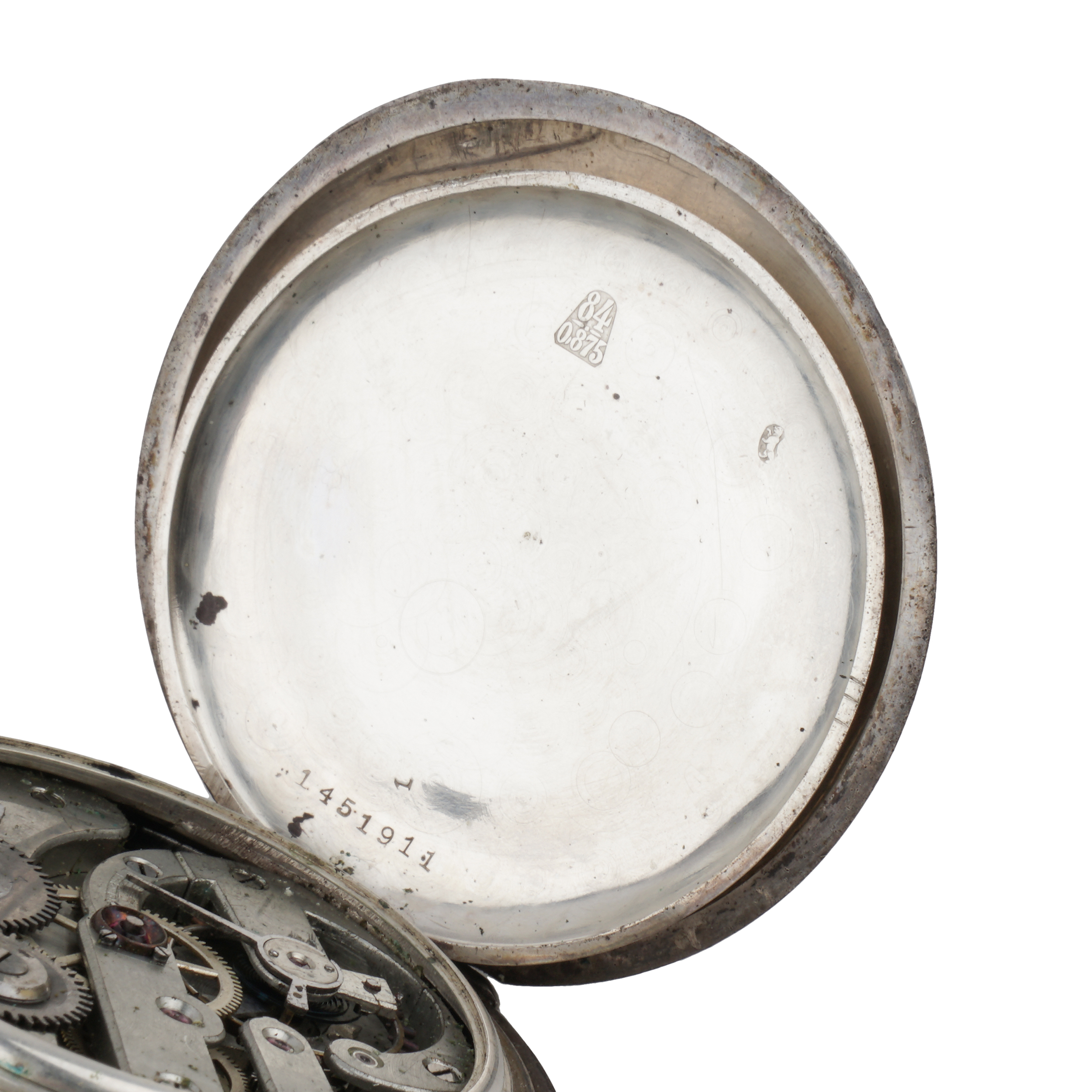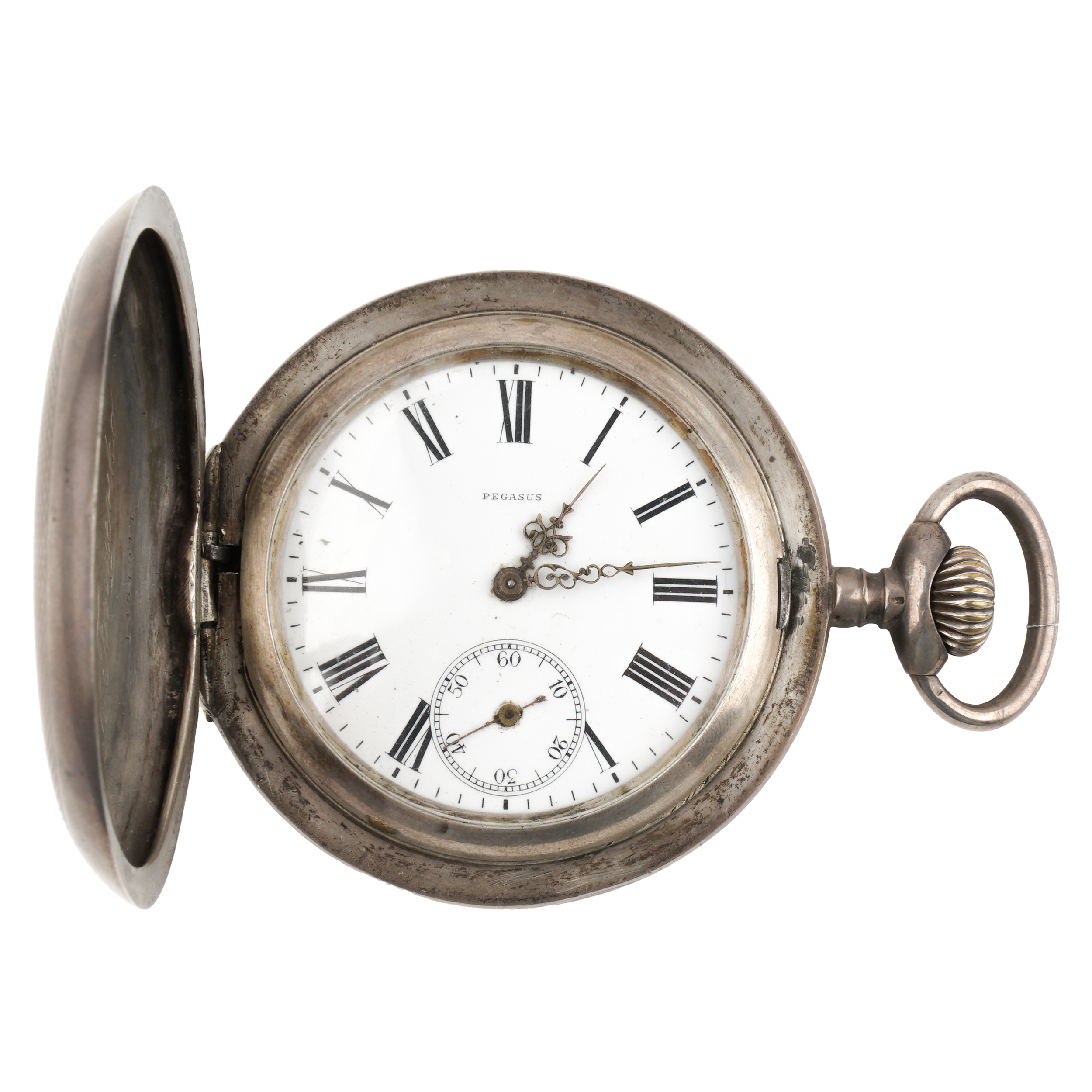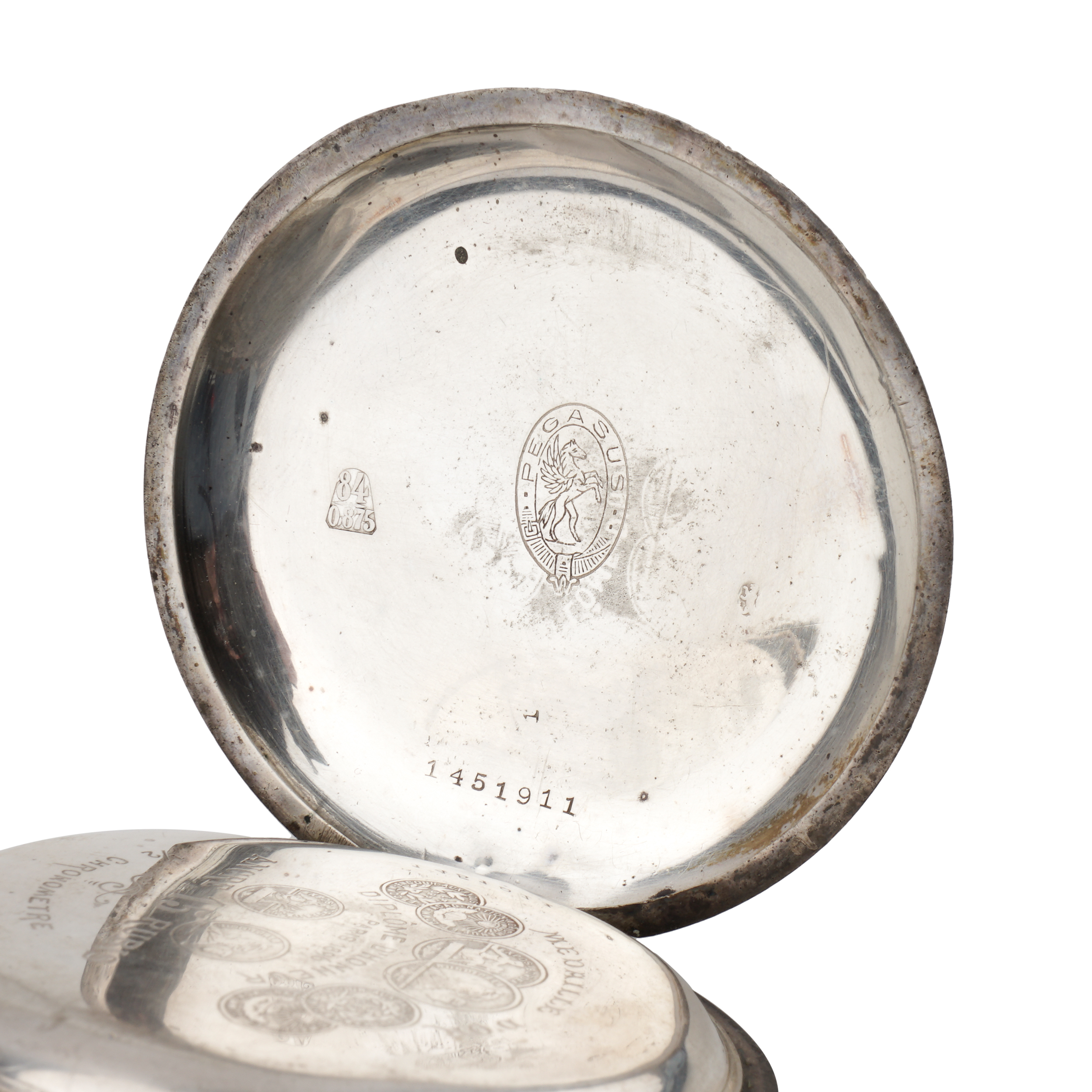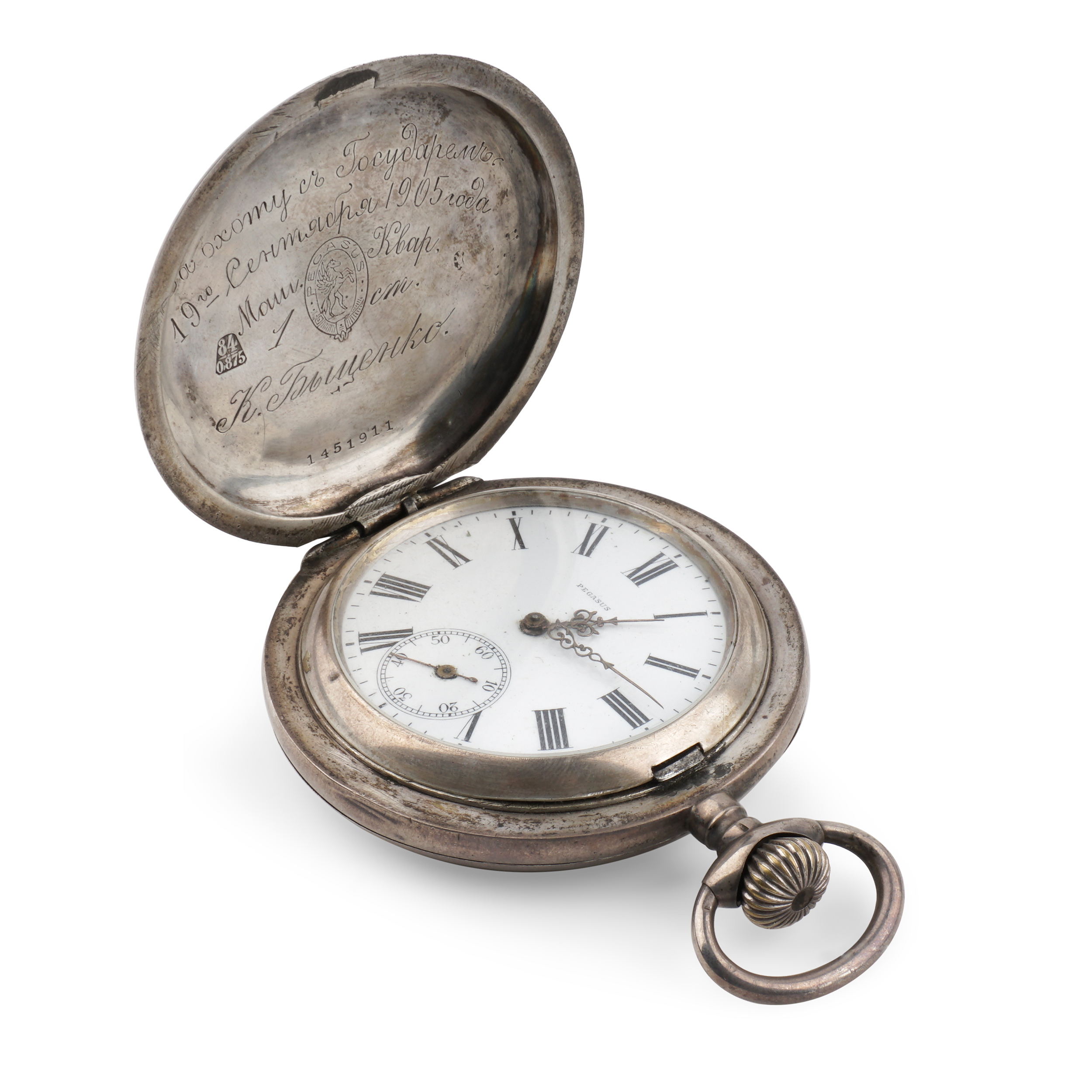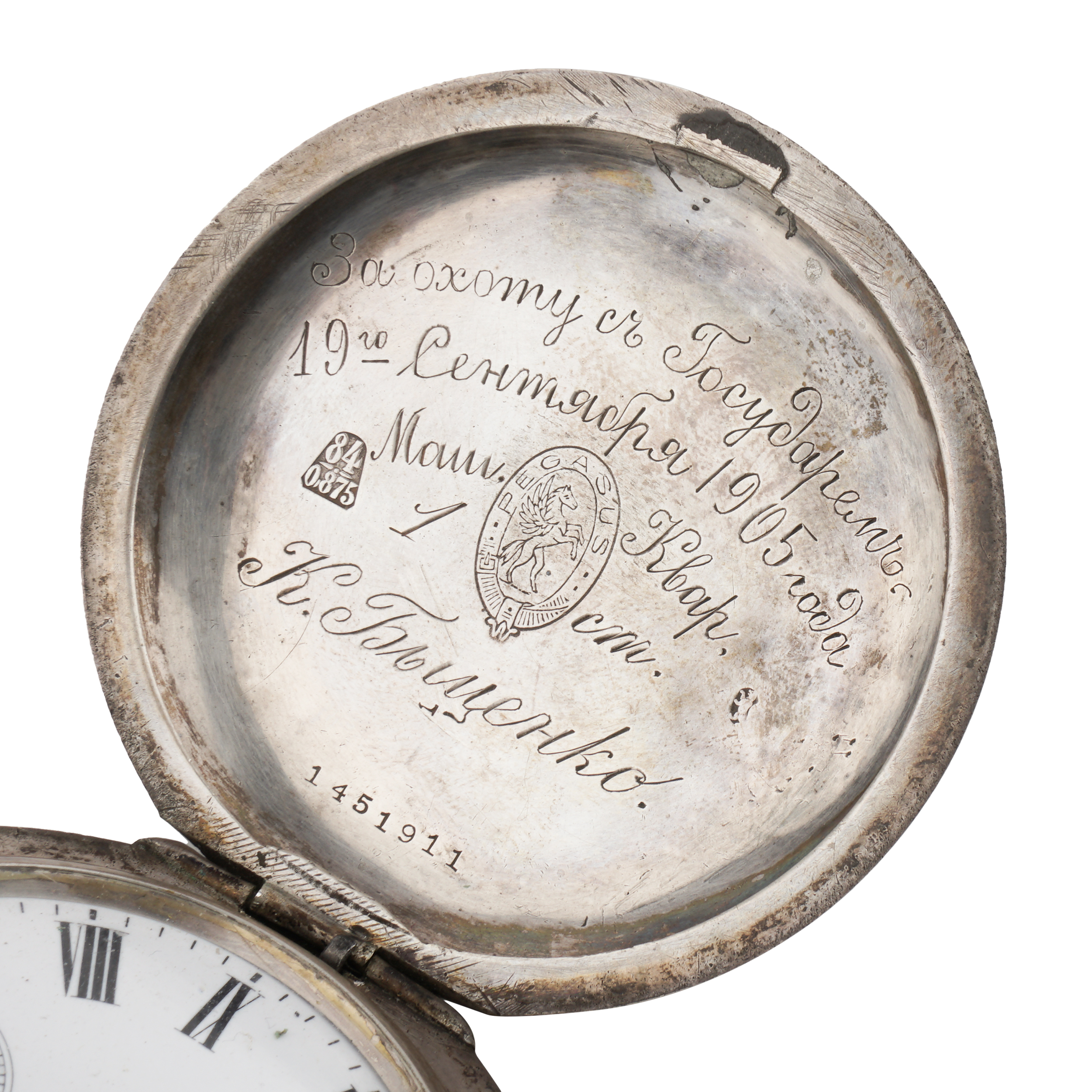 Серебро (84 проба), штамп, эмаль, гильоше, тип корпуса "мыло", ремонтуар. Гравированная надпись на внутренней стороне крышки "За охоту съ Государемъ 19го Сентября 1905 года Маш.Квар. 1 ст. К. Быценко". Швейцария, фирма "Pegasus", 1910-е годы, размер - 59 мм в диаметре, вес ± 130 грамм.