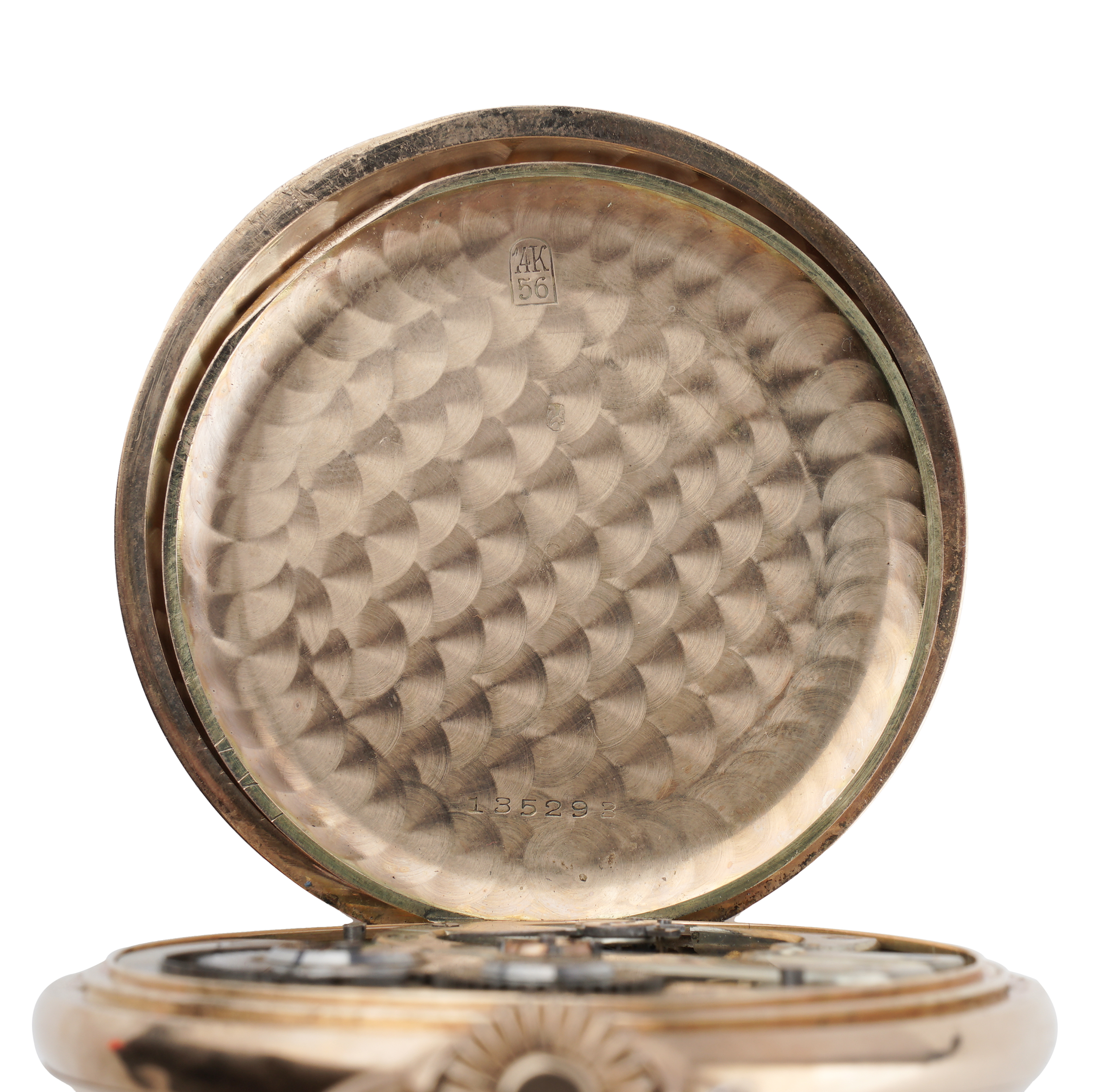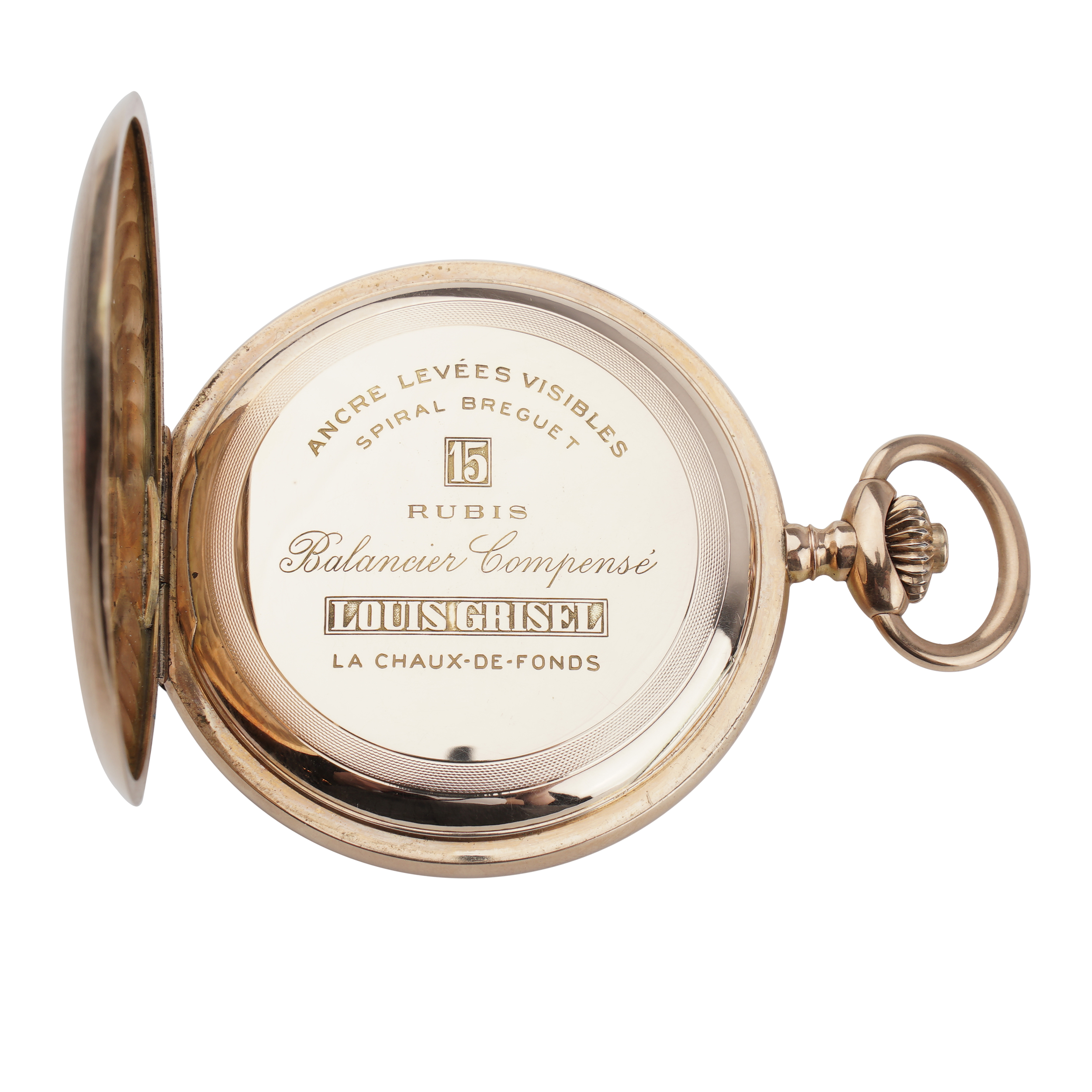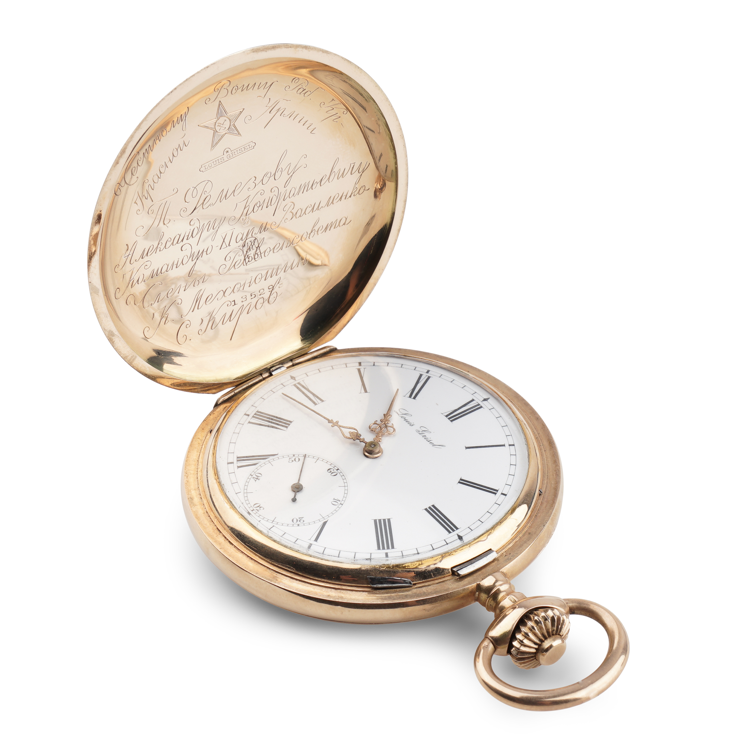 Золото (56 проба), гильоше, гравировка, эмаль, тип корпуса "мыло", ремонтуар. На внутренней стороне верхней крышки гравированная надпись. Швейцария, фирма "Louis Grisel", начало XX века, размер - 54 мм, вес ± 105 грамм.