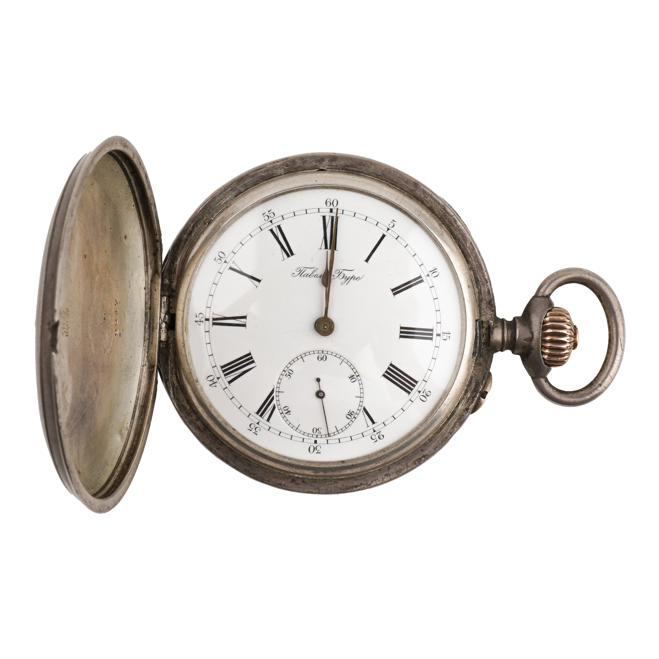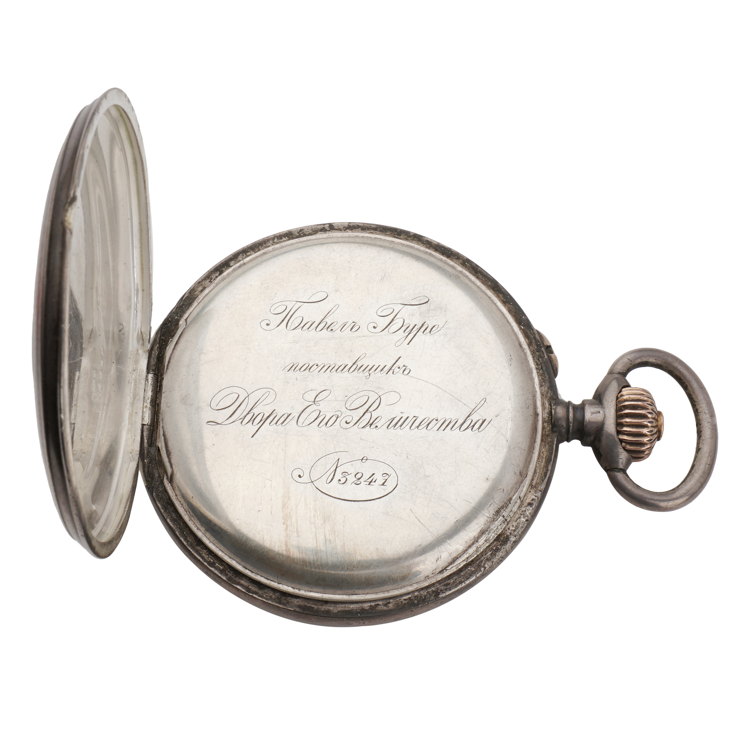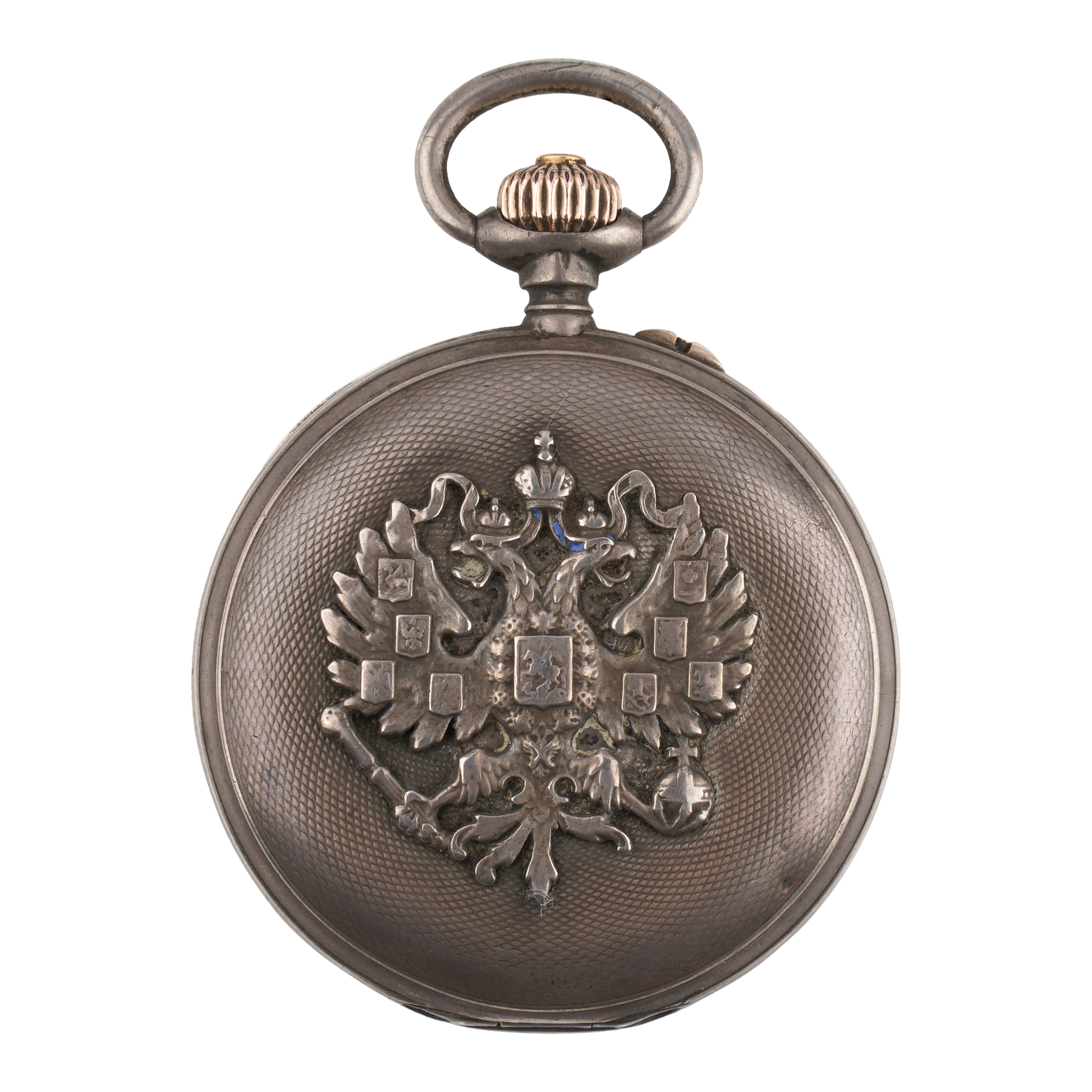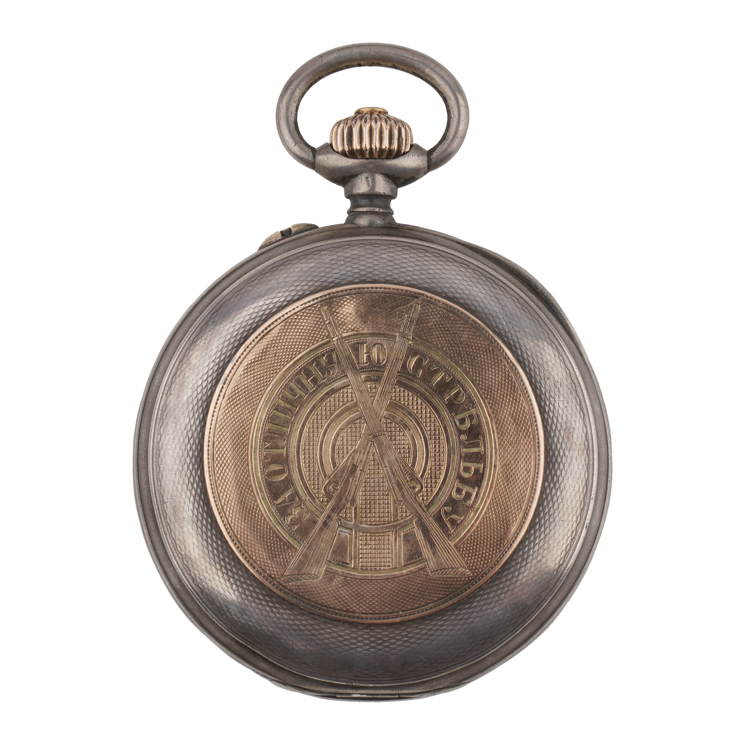 Серебро, золото, литье, штамп, гравировка, гильоше, тип корпуса «мыло», ремонтуар. На верхней крышке накладной герб Российской империи, на ее внутренней стороне гравированная надпись, на нижней крышке штампованное изображение перекрещенных винтовок и гравированная надпись «ЗА ОТЛИЧНУЮ СТРЕЛЬБУ»; Россия, торговый дом «Павел Буре», начало XX века, размер - 54 мм, вес ± 125 грамм