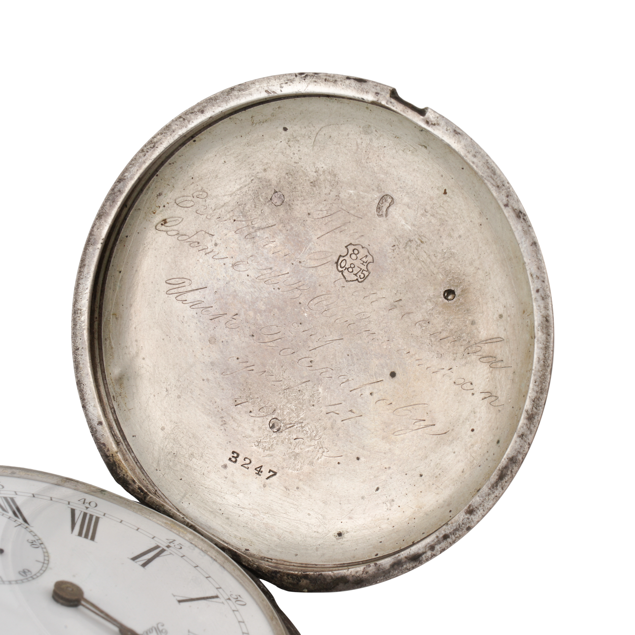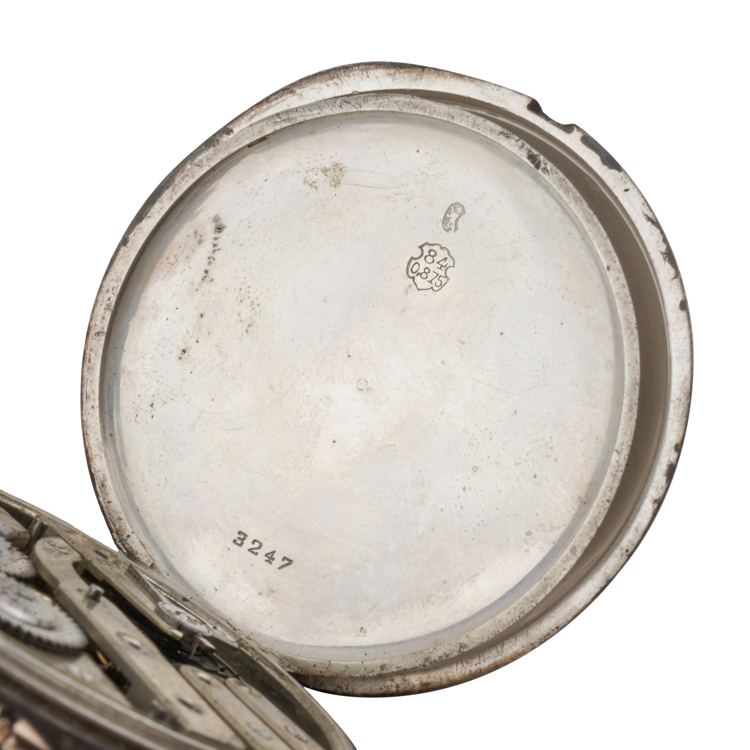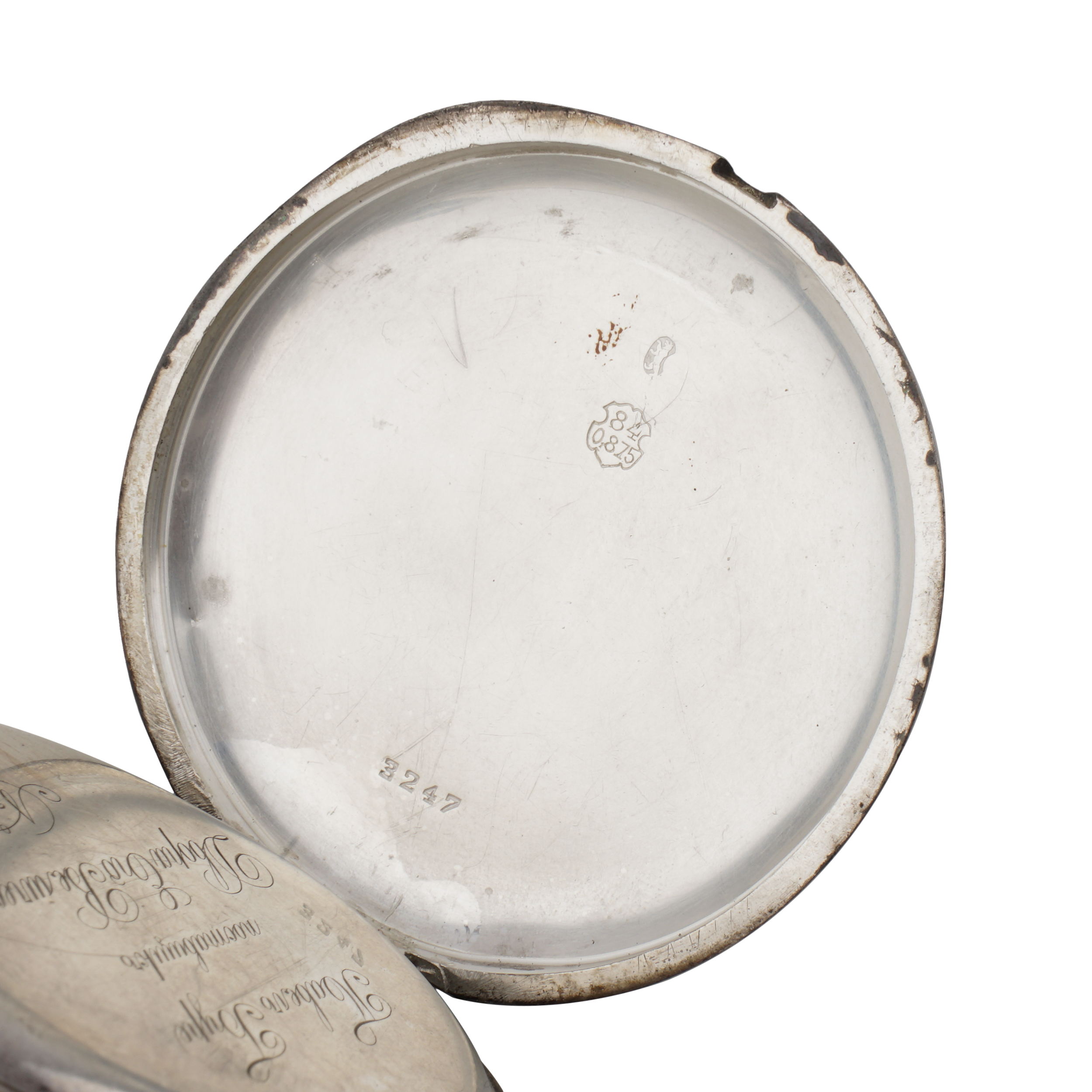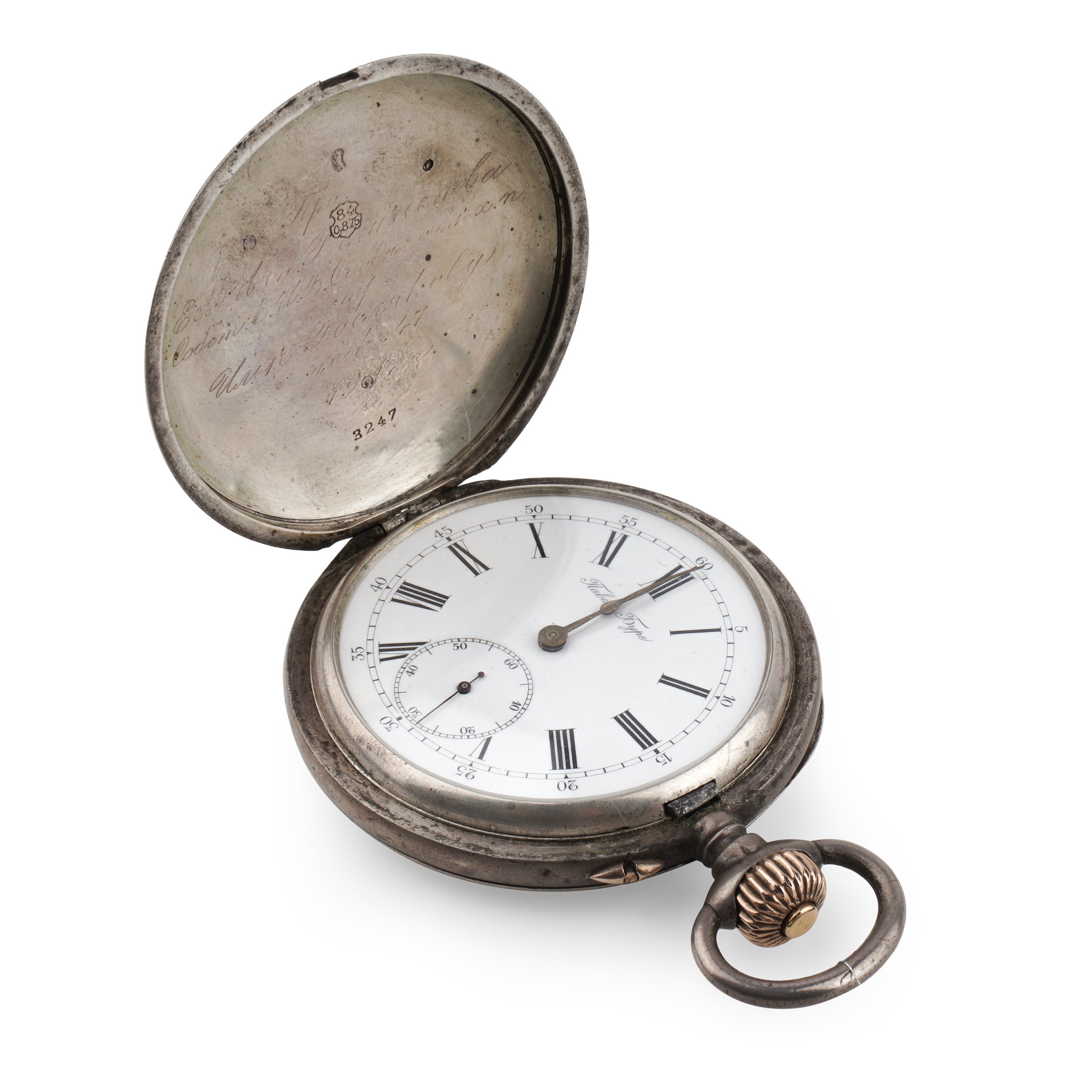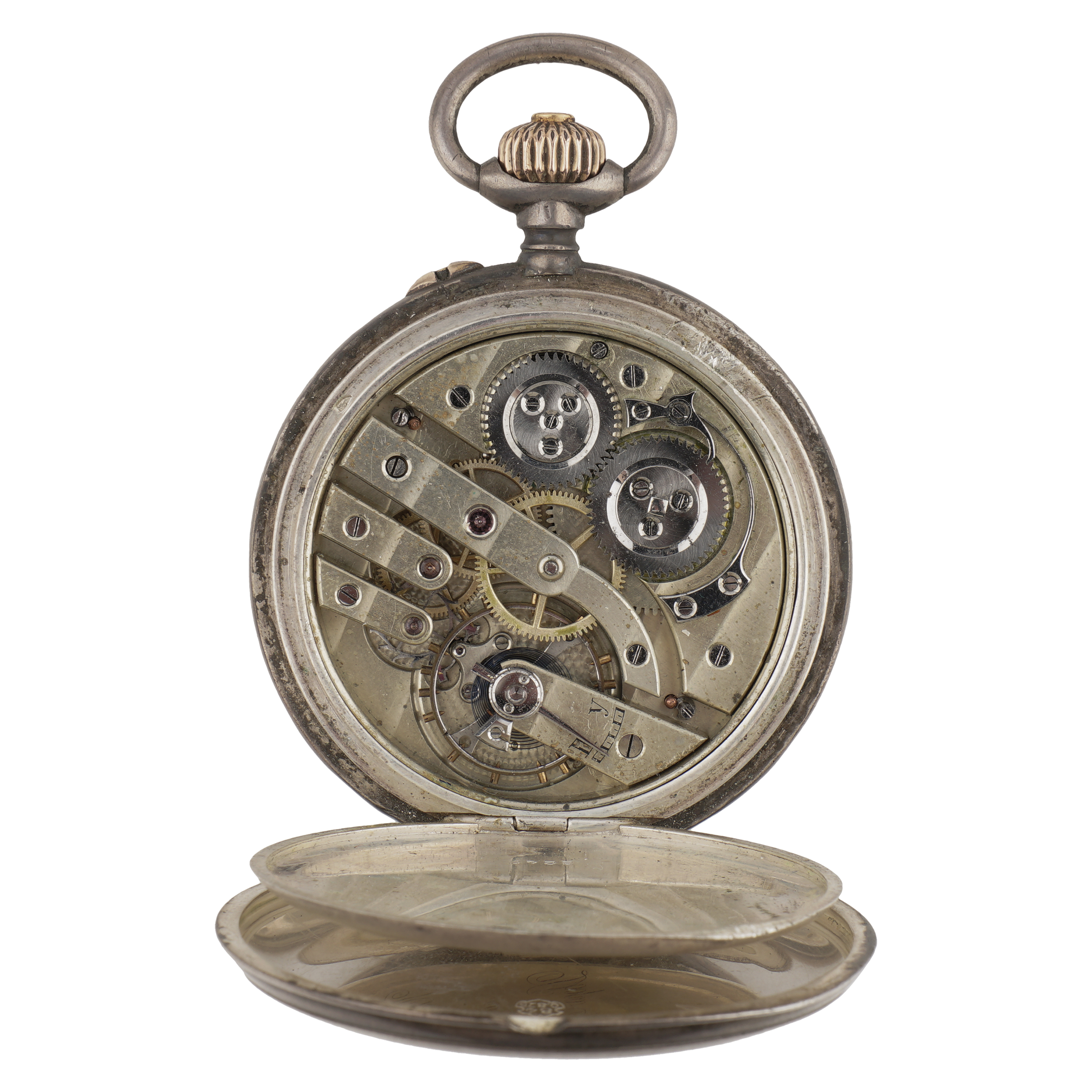 Серебро, золото, литье, штамп, гравировка, гильоше, тип корпуса «мыло», ремонтуар. На верхней крышке накладной герб Российской империи, на ее внутренней стороне гравированная надпись, на нижней крышке штампованное изображение перекрещенных винтовок и гравированная надпись «ЗА ОТЛИЧНУЮ СТРЕЛЬБУ»; Россия, торговый дом «Павел Буре», начало XX века, размер - 54 мм, вес ± 125 грамм