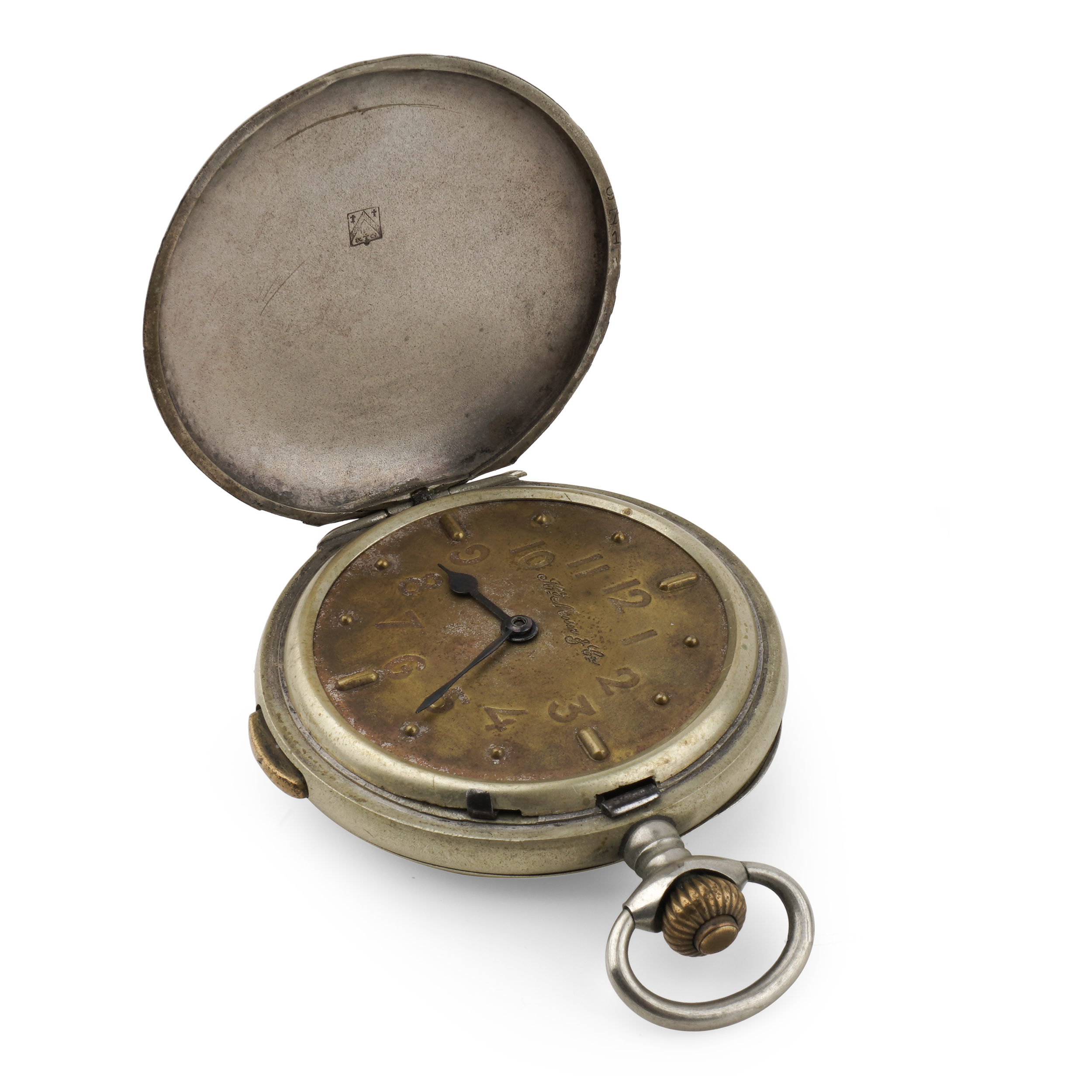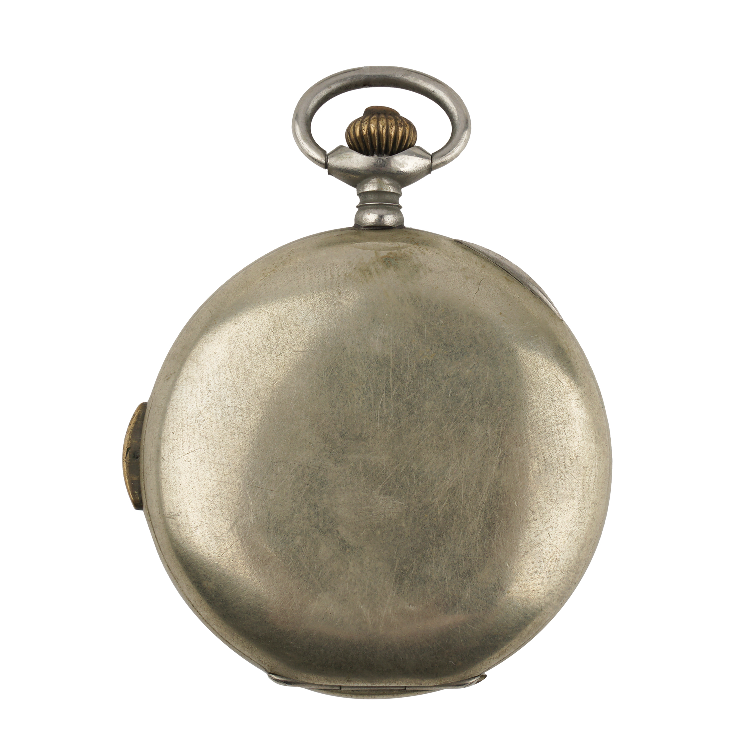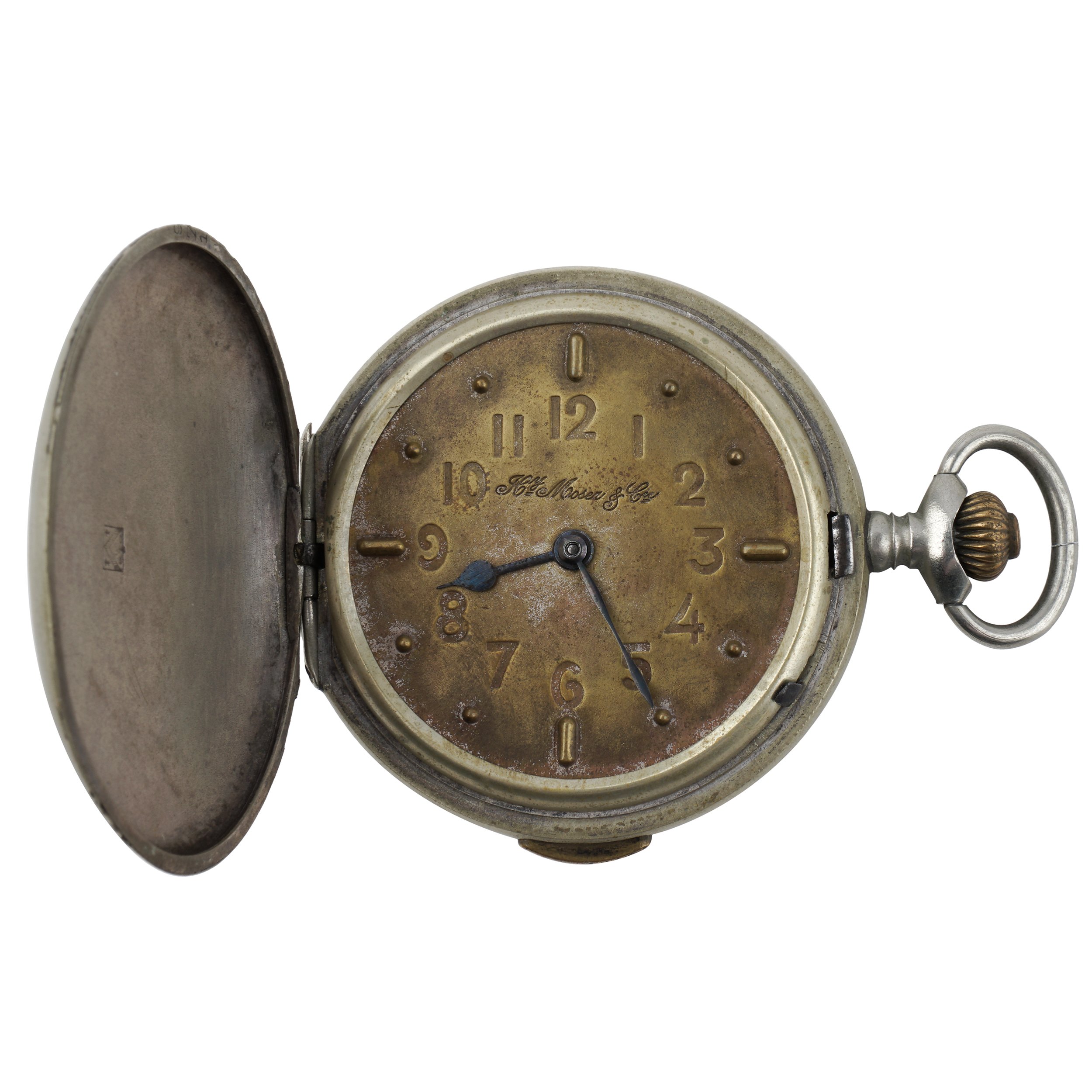 Часы закрытого типа (трёхкрышечные). Серебро, штамп, гравировка, тип корпуса «мыло», ремонтуар. На верхней крышке штампованное выпуклое изображение раненого воина на поле сражения, слева вверху за его головой - знамя с красным крестом, Россия, торговый дом «Генрих Мозер и К», конец 1916 - начало 1917 года, размер - 54 мм, вес ± 115 грамм