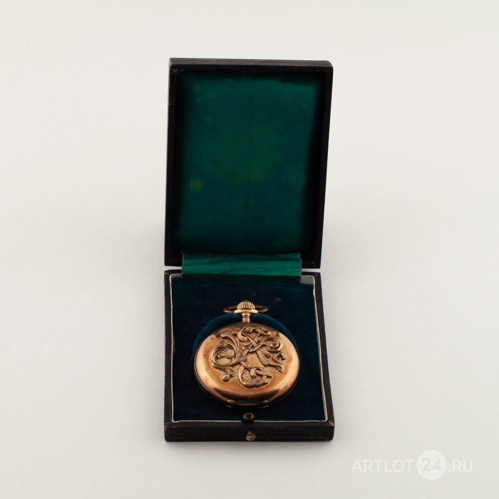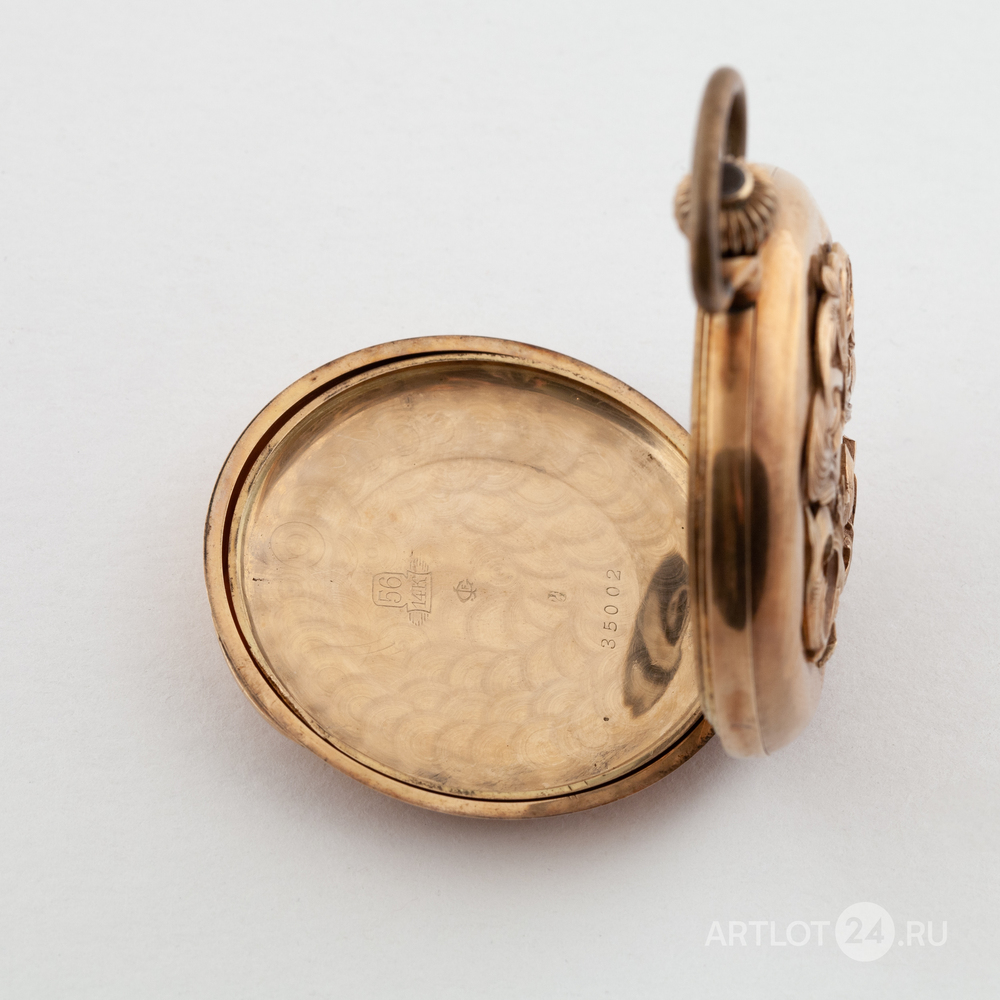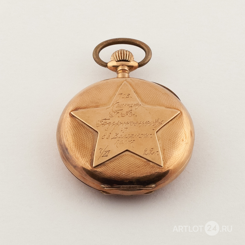 Золото (56 проба), гильоше, гравировка, чеканка, тип корпуса «мыло», ремонтуар. На накладке на задней крышке в форме пятиконечной звезды гравированная надпись «Тов. Командиру Г.А. Бурыченкову от 86 Володарскаго полка 7.XI 22 г.», Швейцария, первая треть XX века, размер - 52 мм, вес ± 104 грамма.