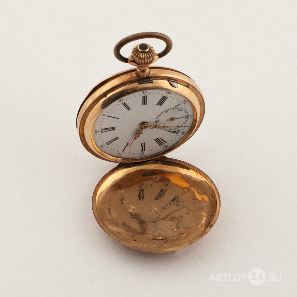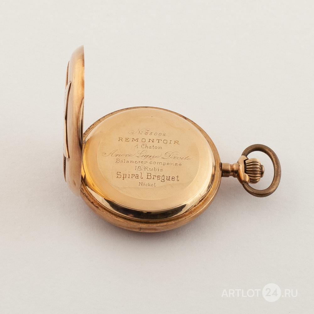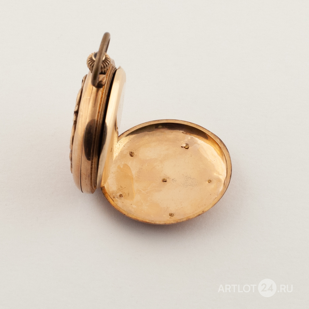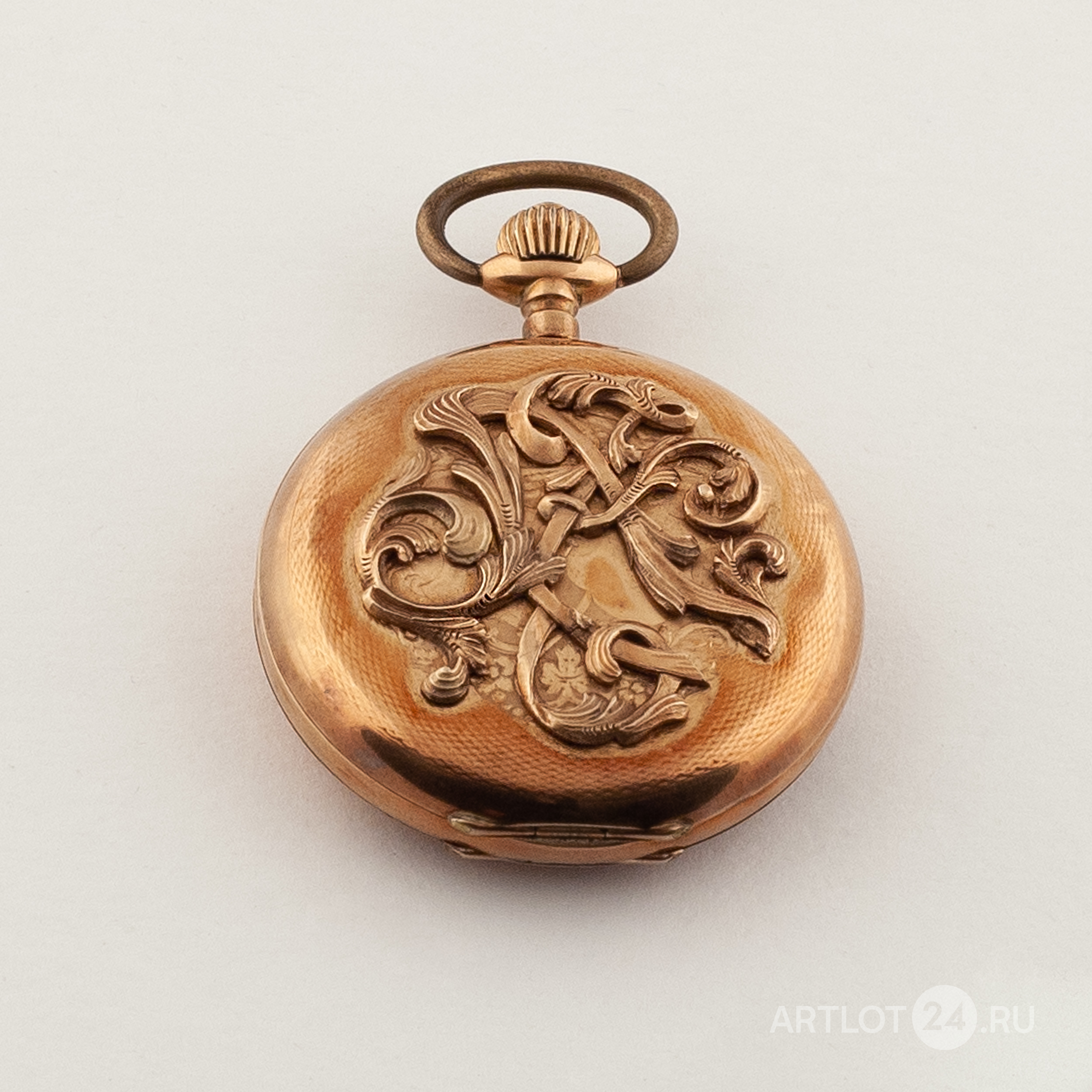 Золото (56 проба), гильоше, гравировка, чеканка, тип корпуса «мыло», ремонтуар. На накладке на задней крышке в форме пятиконечной звезды гравированная надпись «Тов. Командиру Г.А. Бурыченкову от 86 Володарскаго полка 7.XI 22 г.», Швейцария, первая треть XX века, размер - 52 мм, вес ± 104 грамма.