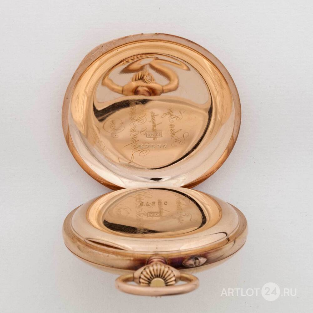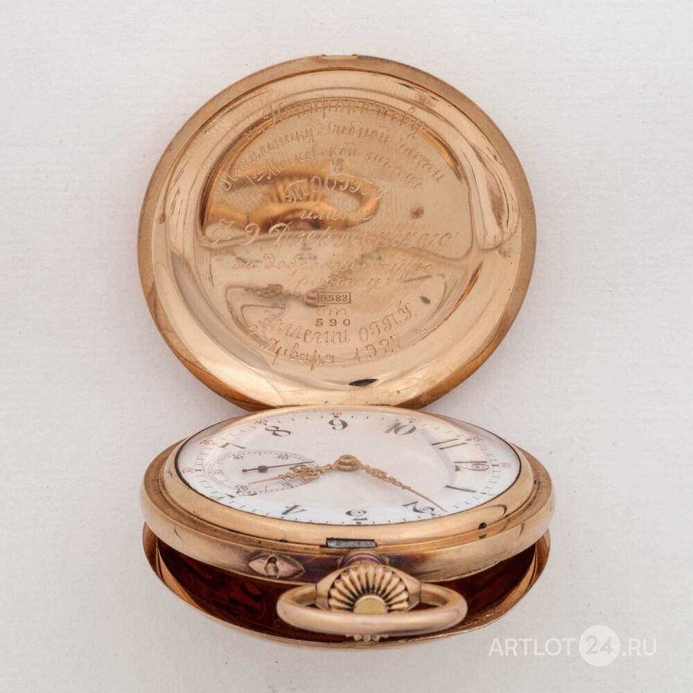 Золото (585 проба), гладкий корпус, тип корпуса "мыло". На внутренней стороне верхней крышки гравированная надпись "т. Ненароковому Начальнику Учебной части 1ой Московской школы ТООГПУ имени Ф.Э. Дзержинского за добросовестную работу от коллегии ОГПУ 2 января 1927 г.". Россия, торговый дом "Павел Буре", размер - 52 мм.