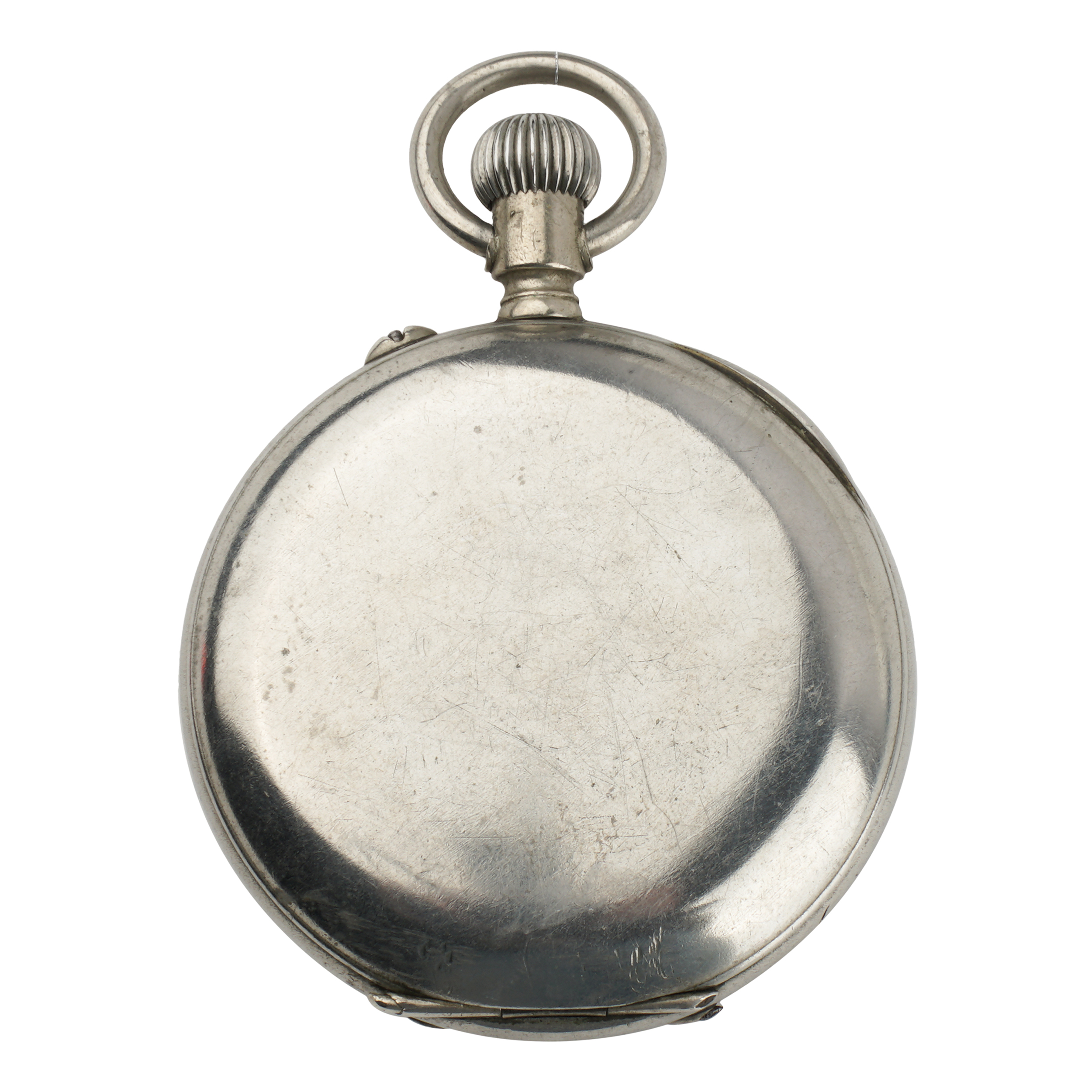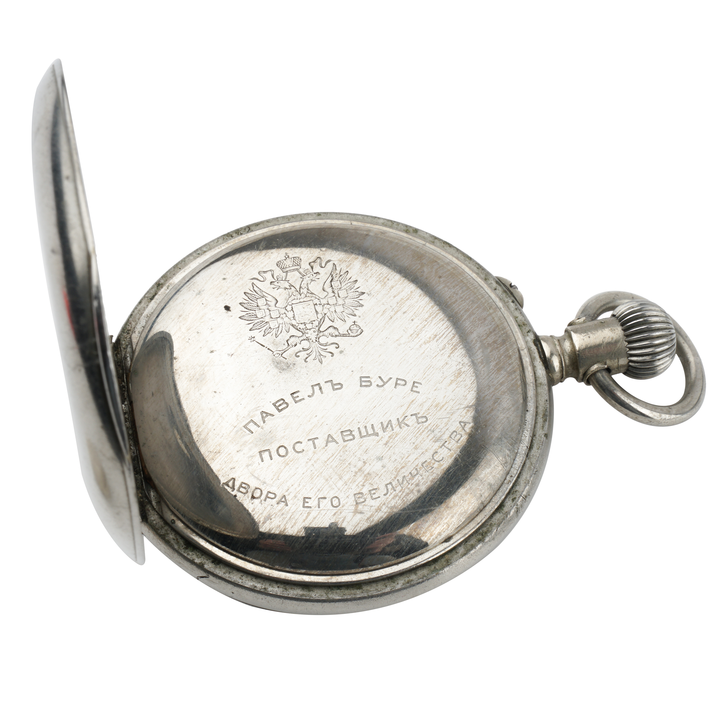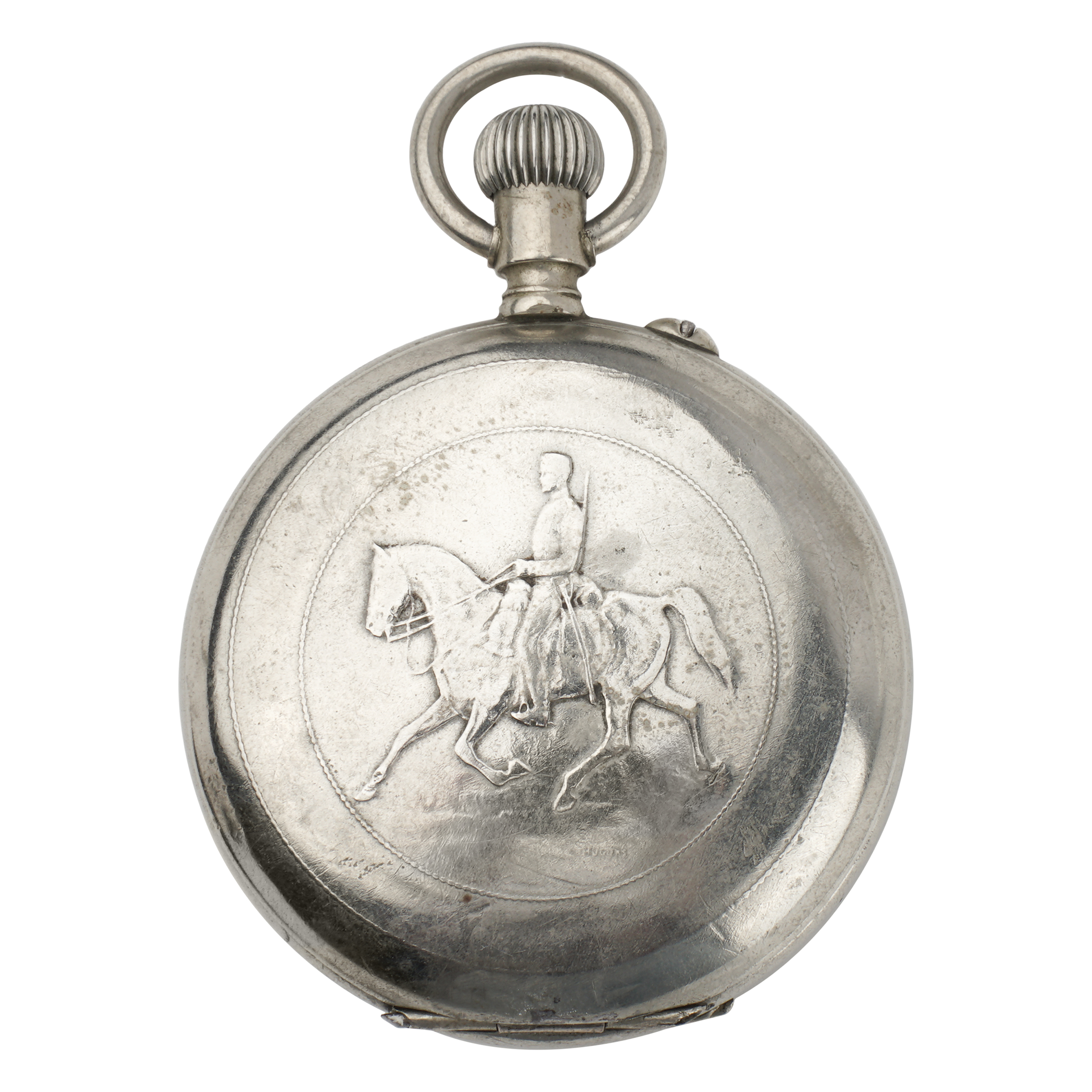 Никель, штамп, гравировка, гладкие, тип корпуса "мыло", ремонтуар. На верхней крышке штампованное выпуклое изображение всадника на лошади; на внутренней стороне верхней крышки гравированная надпись. Россия, торговый дом "Павел Буре", начало XX века, размер - 55 мм, вес ± 135 грамм.