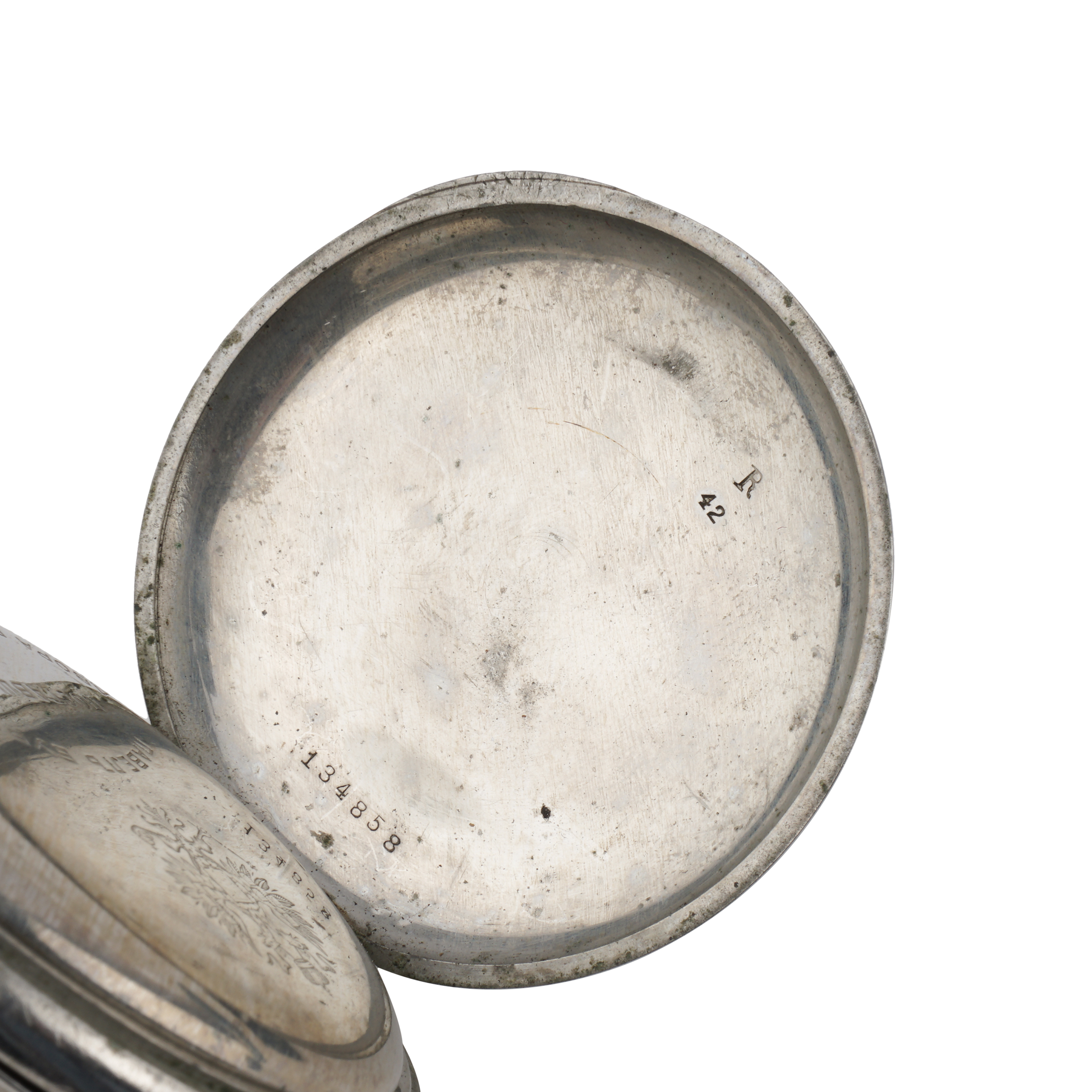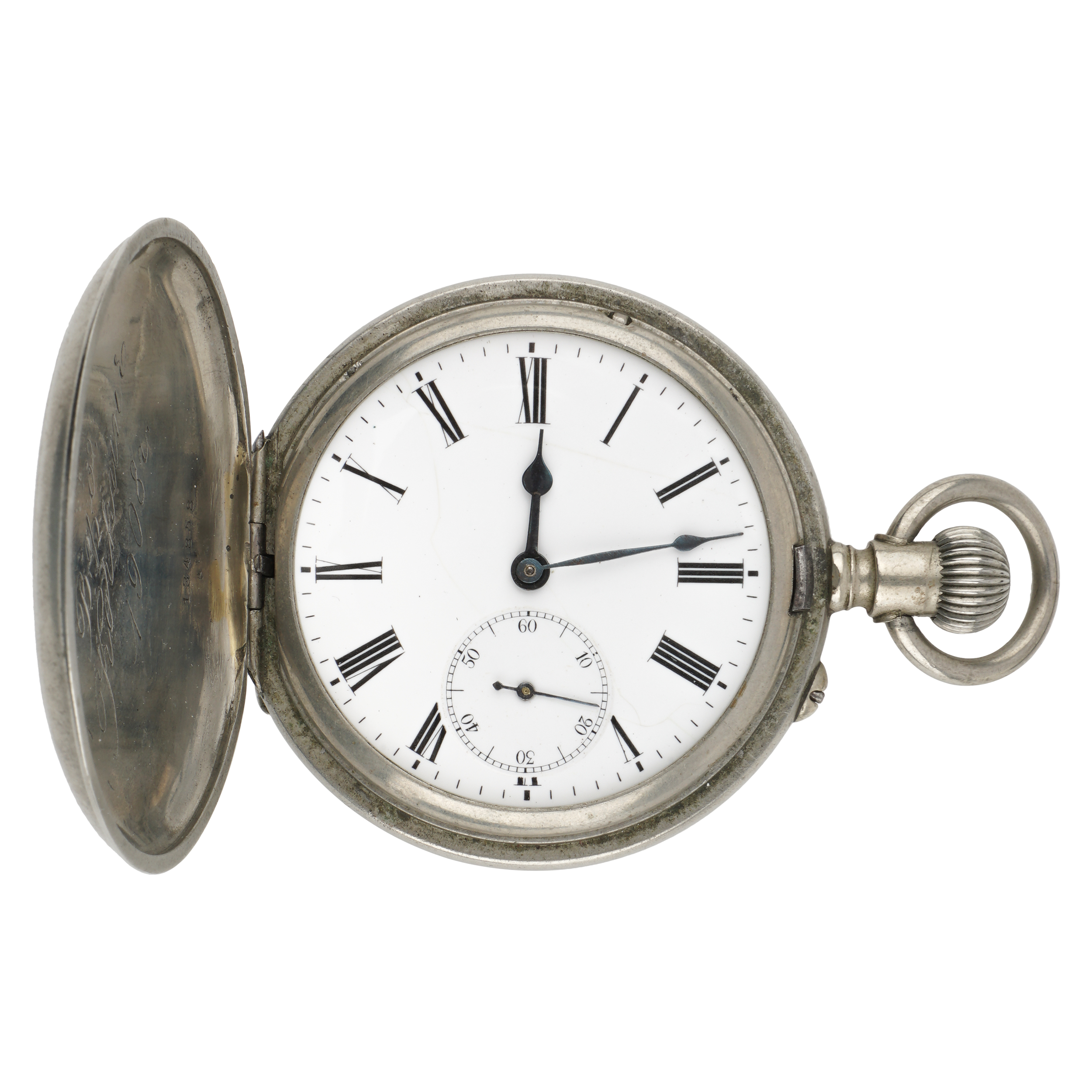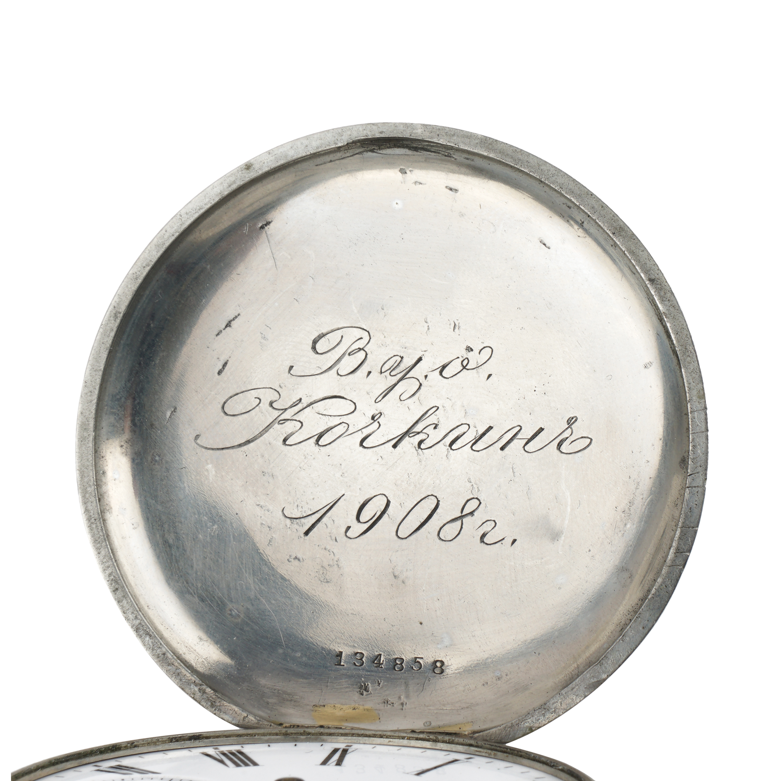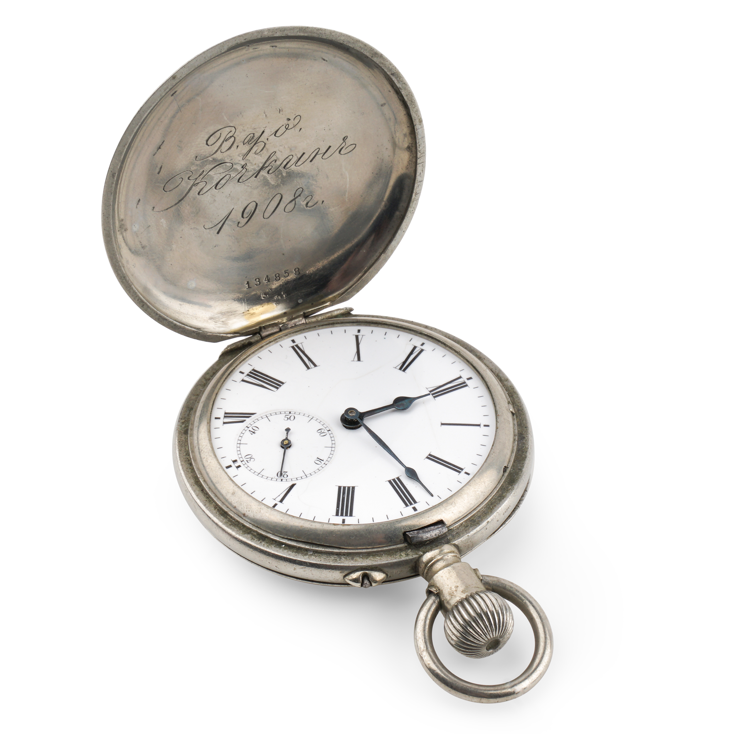 Никель, штамп, гравировка, гладкие, тип корпуса "мыло", ремонтуар. На верхней крышке штампованное выпуклое изображение всадника на лошади; на внутренней стороне верхней крышки гравированная надпись. Россия, торговый дом "Павел Буре", начало XX века, размер - 55 мм, вес ± 135 грамм.