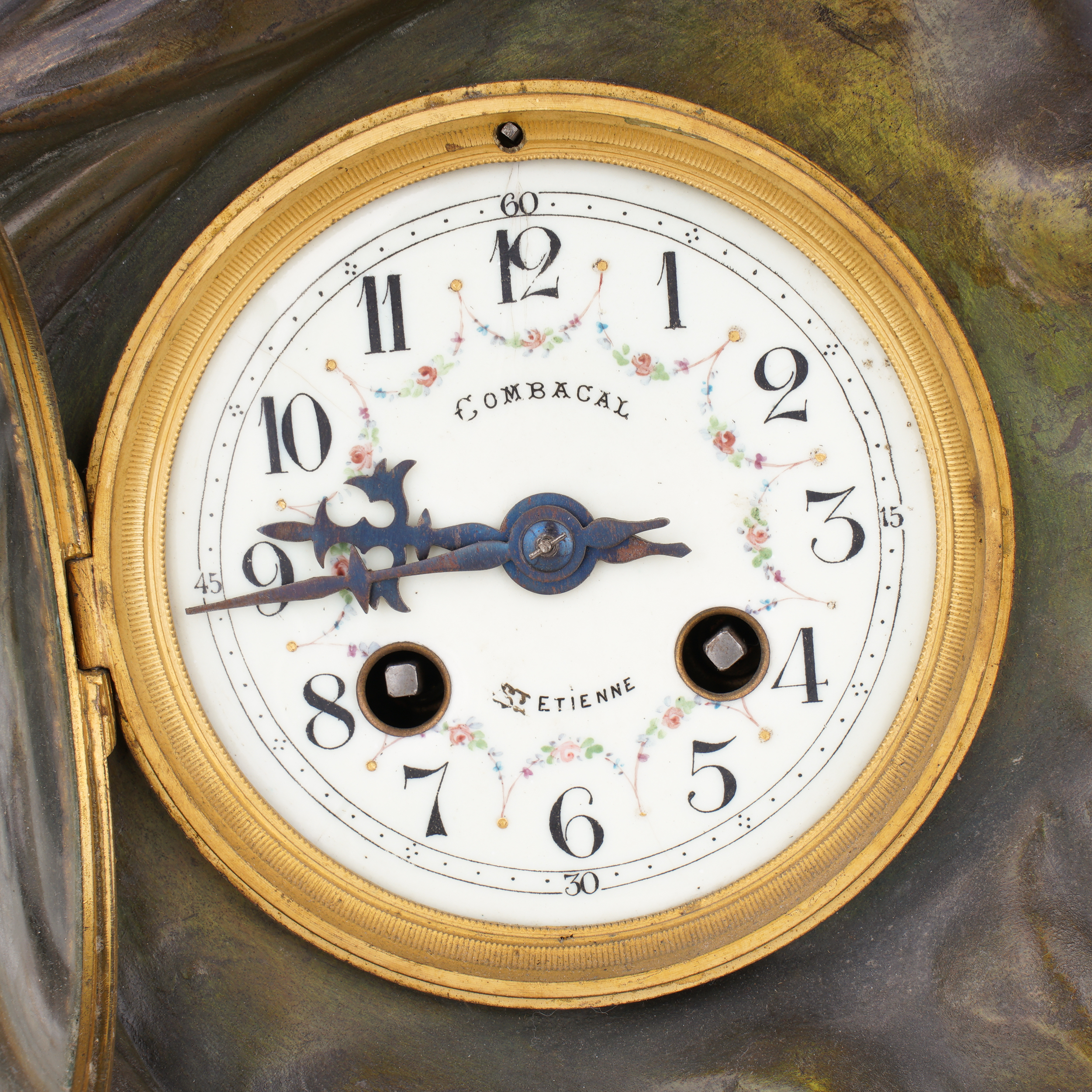 Металл, литье, шпиатр, патинирование, окраска, эмалевый циферблат с арабскими цифрами и надписью: «Combacal/ St. Etienne», на часовом механизме выгравированная медаль-штамп «S. Marti et Cie Medaille D'Argent 1889» - приз Международной часовой выставки, механизм известной часовой фирмы Сэмуэля Марти (S.Marti & Cie) образца 1880-х годов, предположительно изготовлены на мануфактуре Сент-Этьен, Франция, конец XIX века, размер (в/ш/г): 75 х 24х 17 см