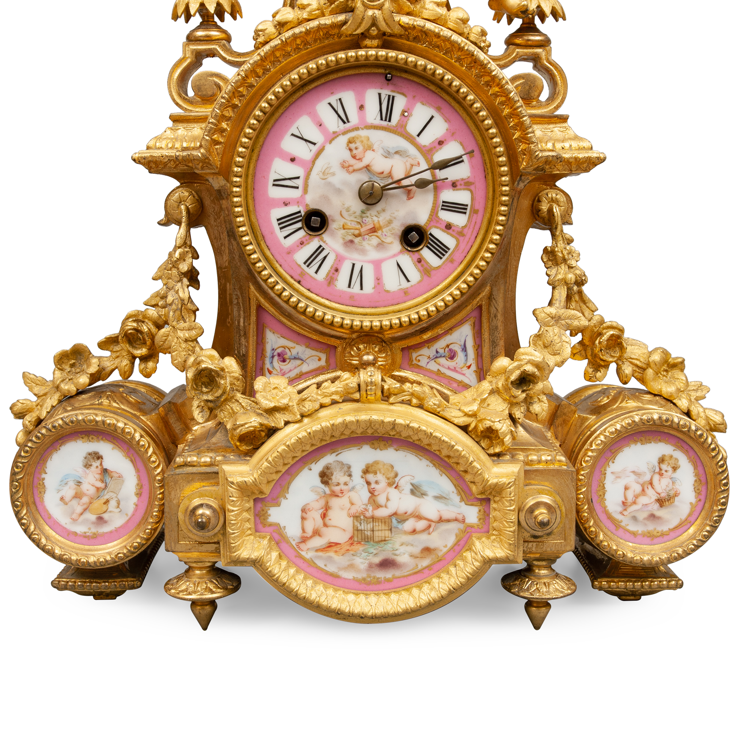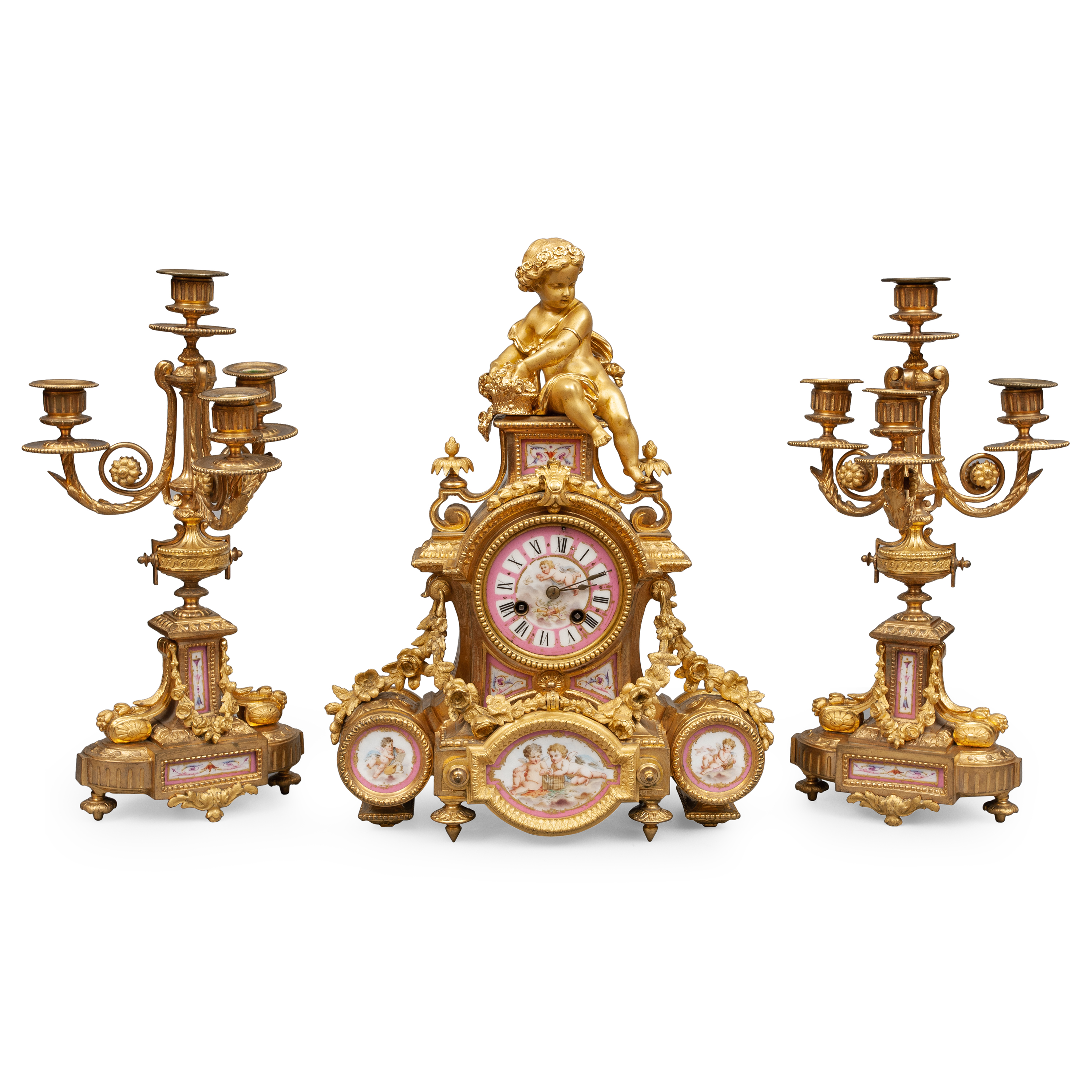 Бронза, литье, золочение, чеканка, фарфоровые вставки, крытье розовым («розовый помпадур»), полихромная роспись, эмалевый циферблат с росписью в медальоне, с арабскими цифрами часов и делением на минуты, стрелки- вороненые, на плате часового механизма медаль «Japy Freres» часовая мастерская Братьев Жапи, предположительно Севрская фарфоровая мануфактура (?), Франция, Париж, около 1890 года. Размеры (в/ш/г) часы 40х34х10 см; канделябр: высота 40 см.