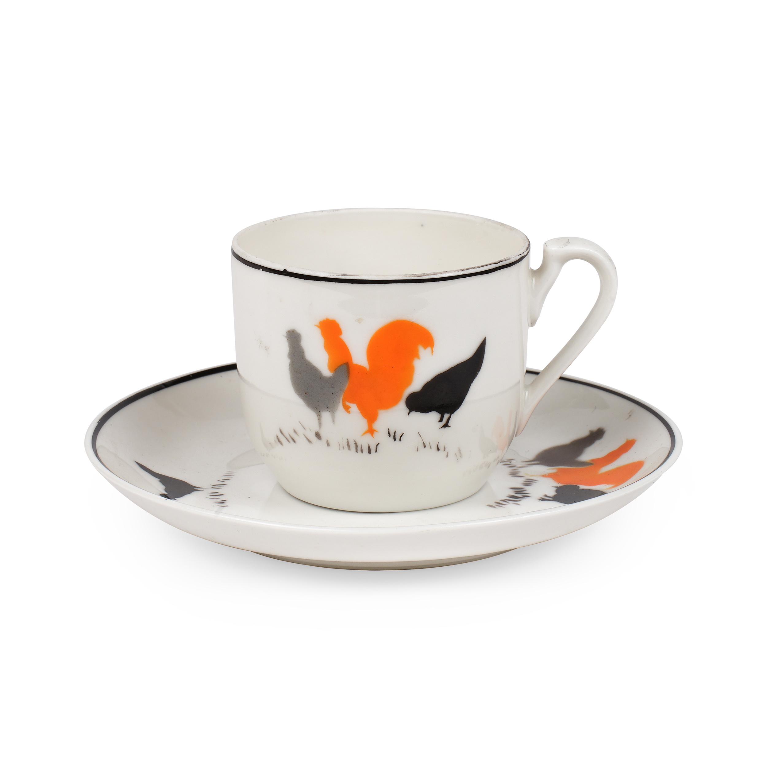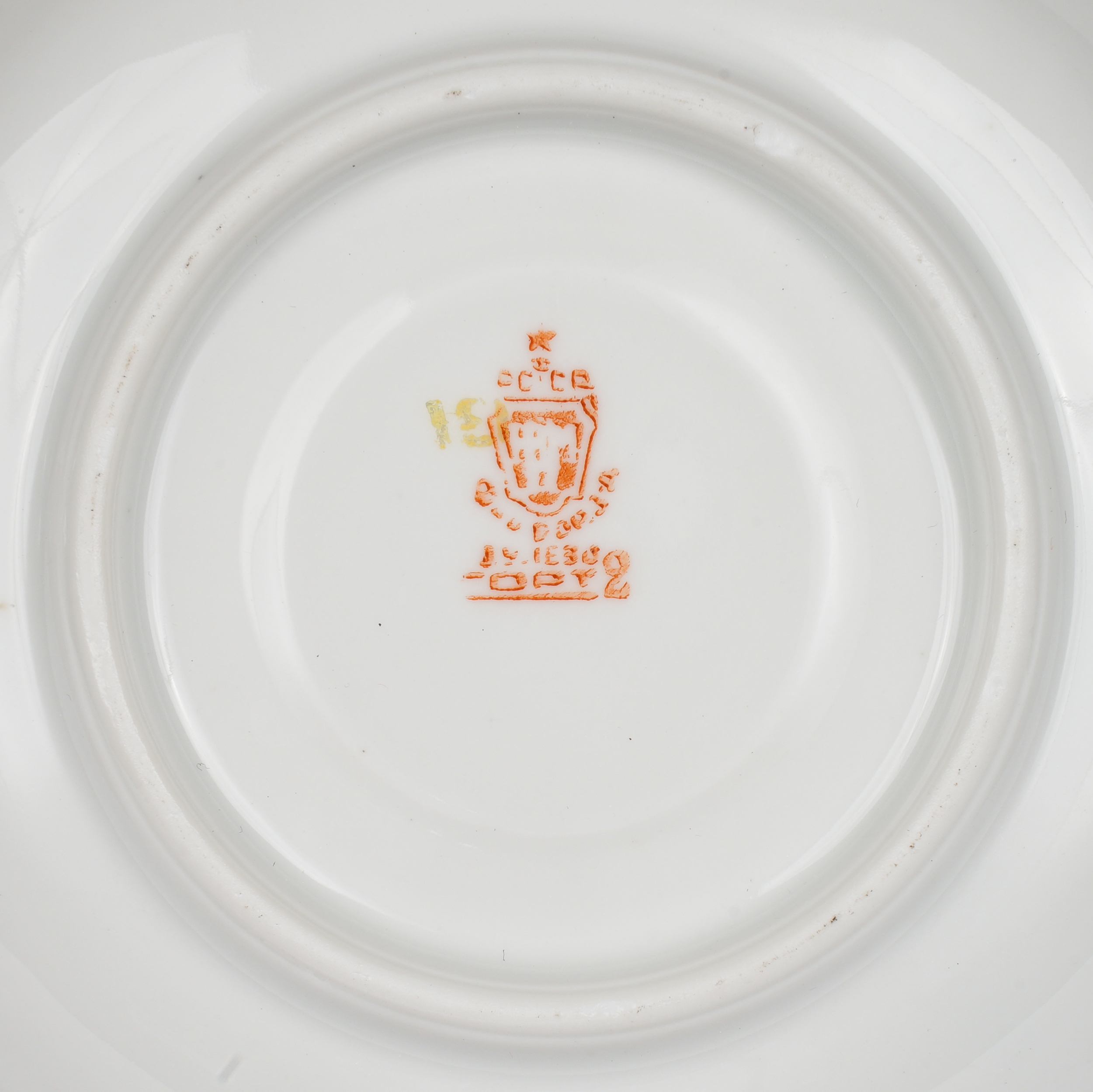 Фарфор, роспись по трафарету, надглазурное красное печатное клеймо Дулёвского фарфорового завода «РСФСР НКМП Фарфор з-д Дулево Сорт 2», СССР, 1937-1947 годы, высота – 6 см, диаметр блюдца – 13 см