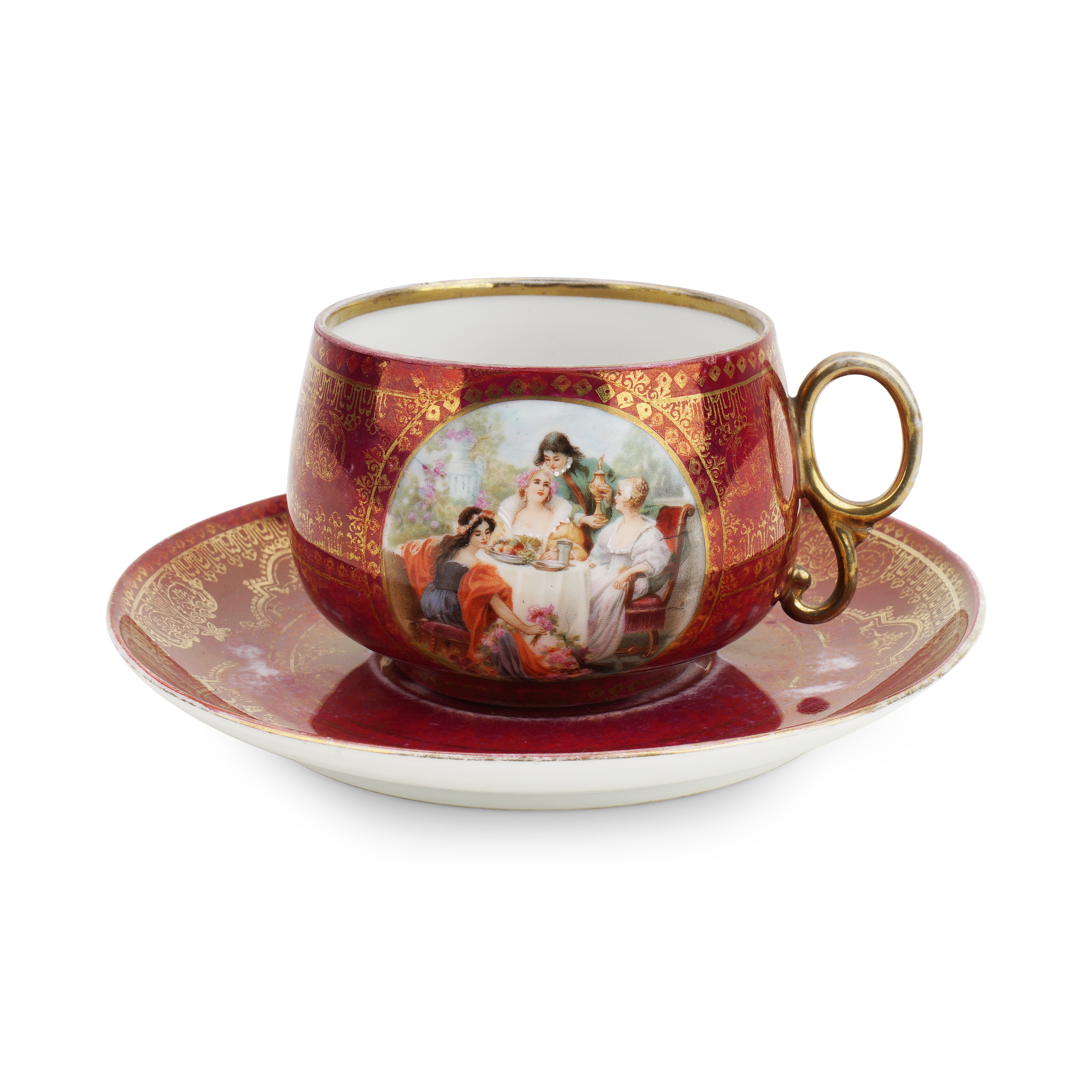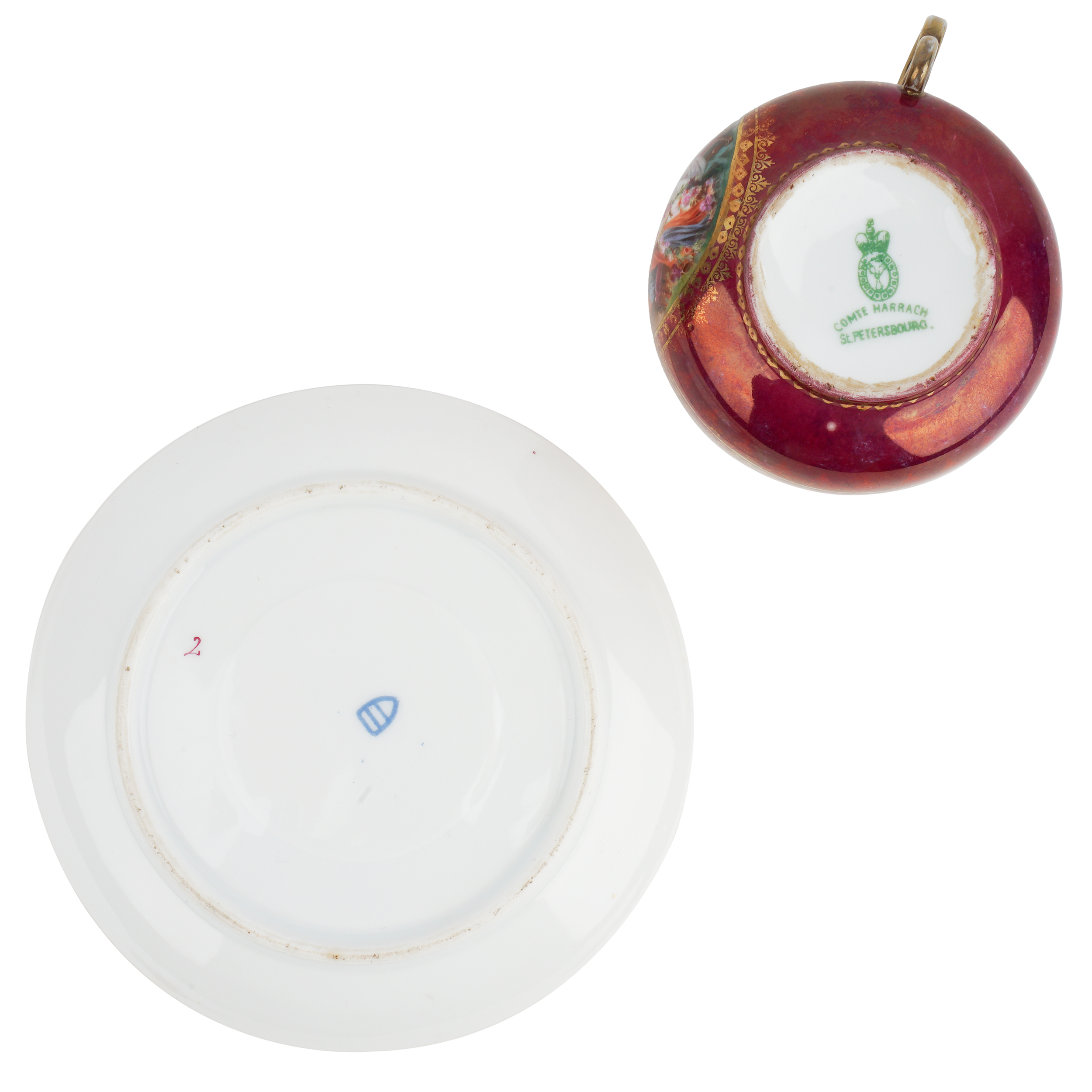 Марки: зеленым на чашке: Comte Harrach; на блюдце: синим: щит