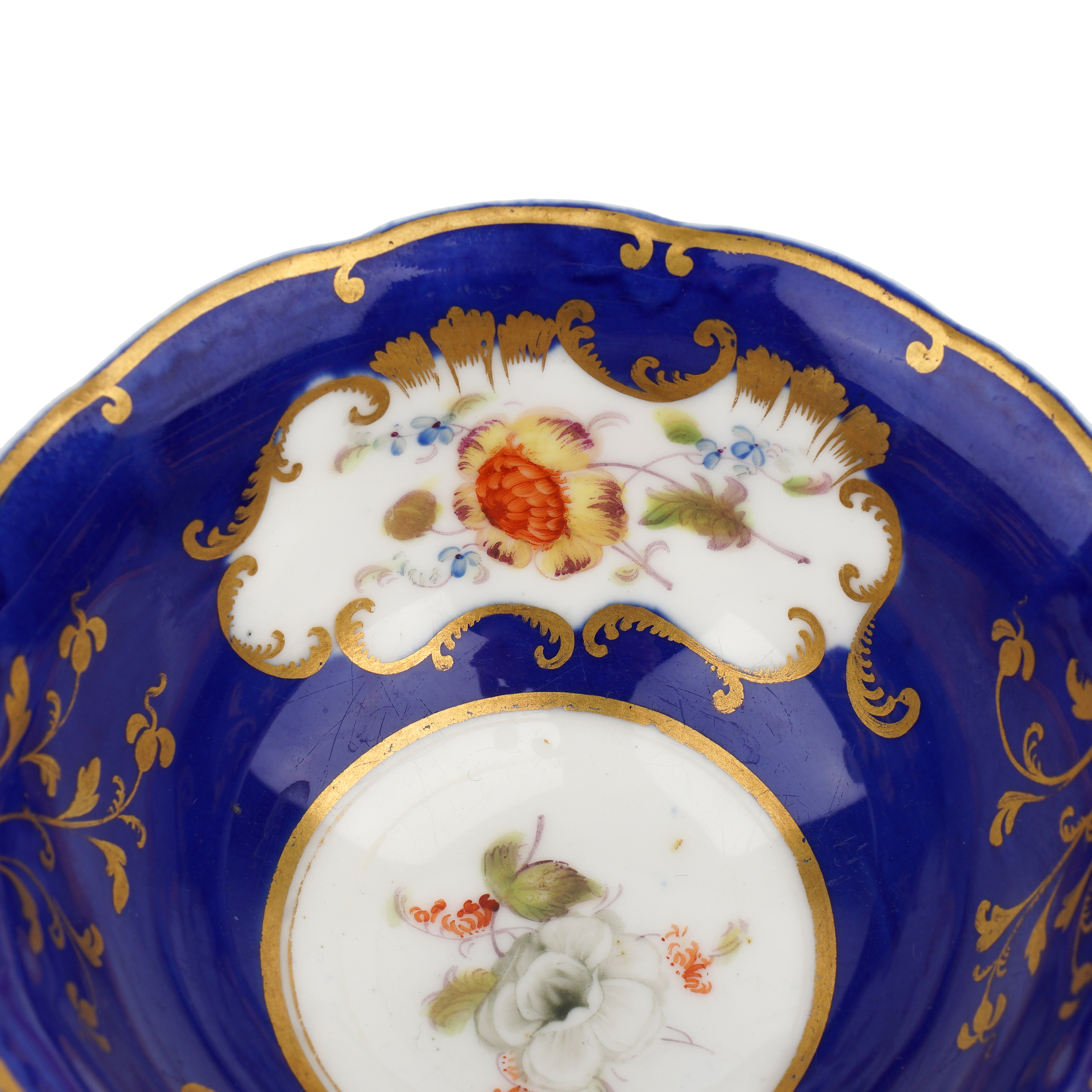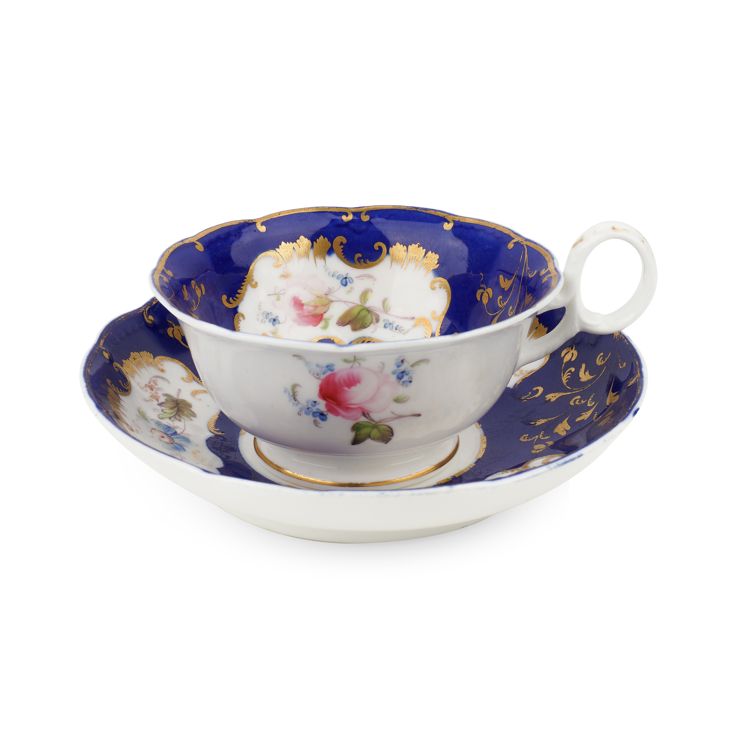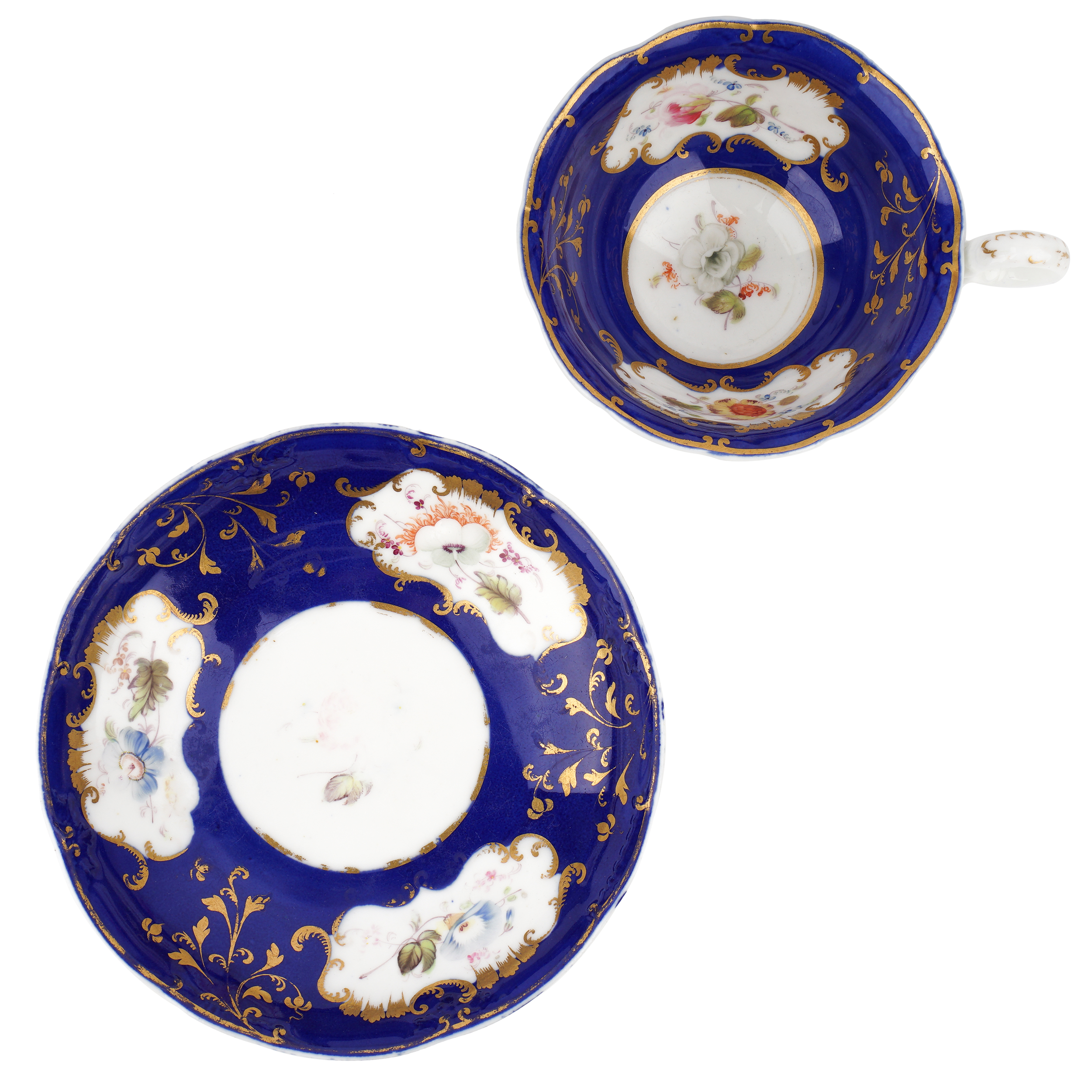 Фарфор, рельеф, синее монохромное крытье, надглазурная полихромная роспись, золочение, Европа (предположительно Англия) XIX век. Размеры: высота – 5 см, диаметр чашки – 10,5 см, блюдца – 14,8 см.
