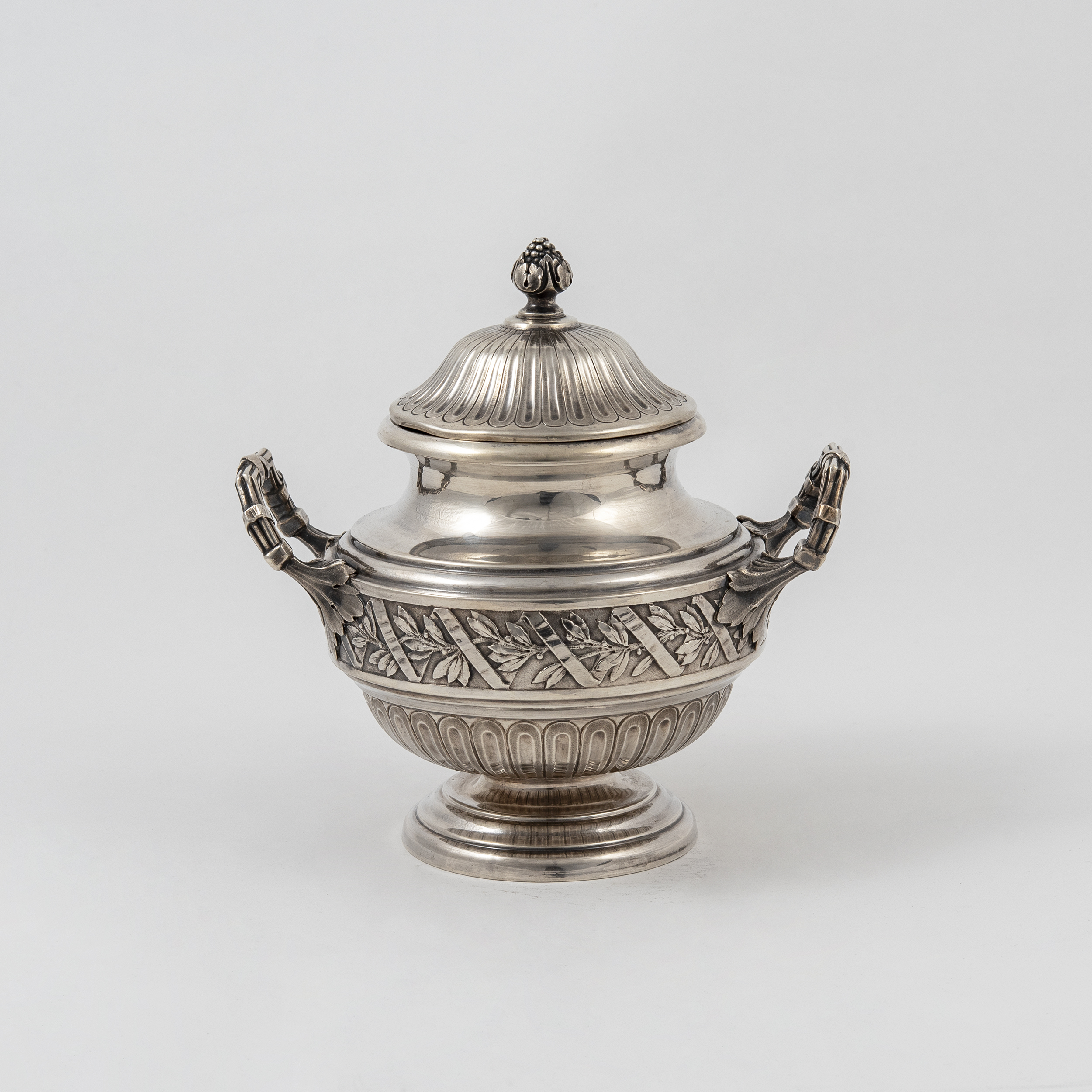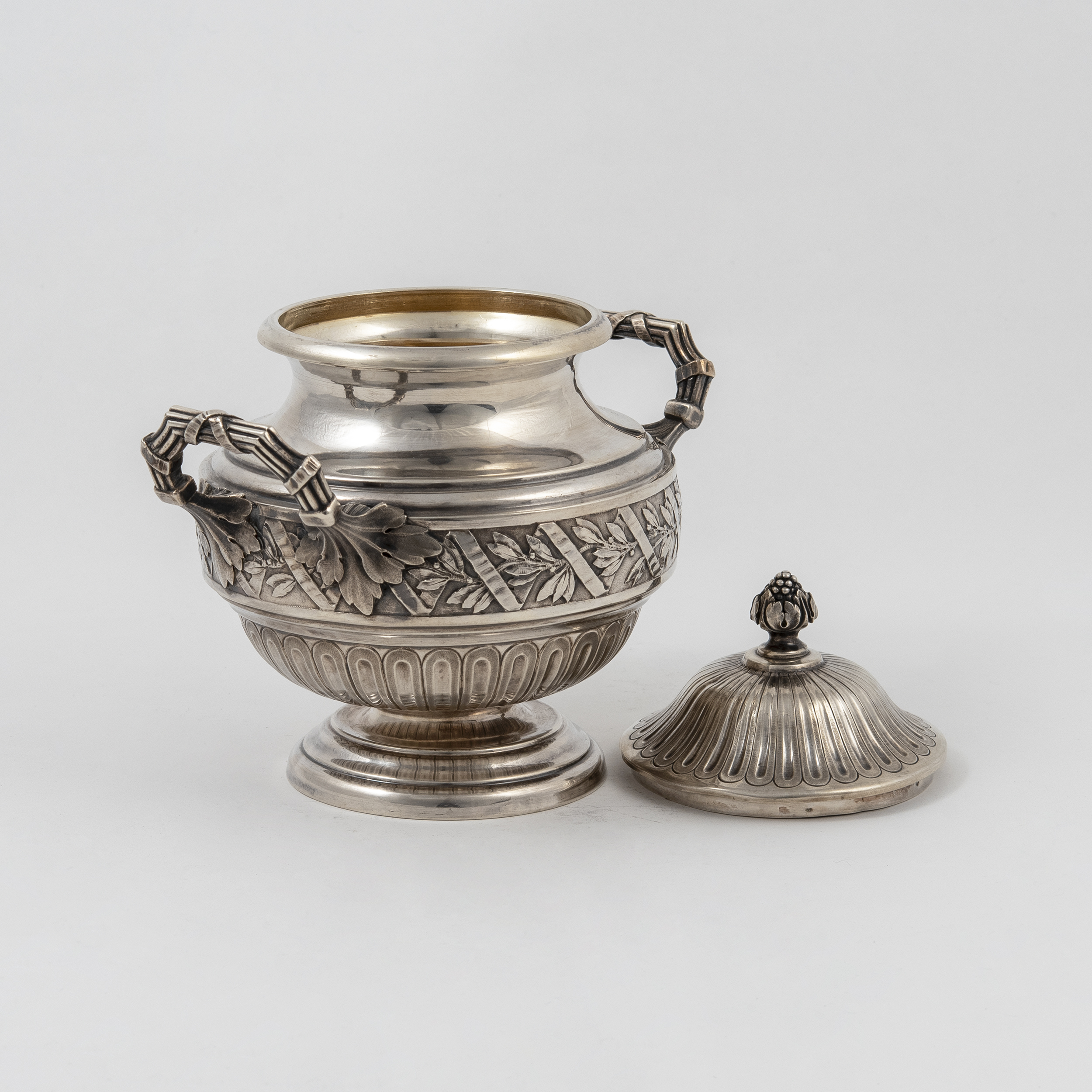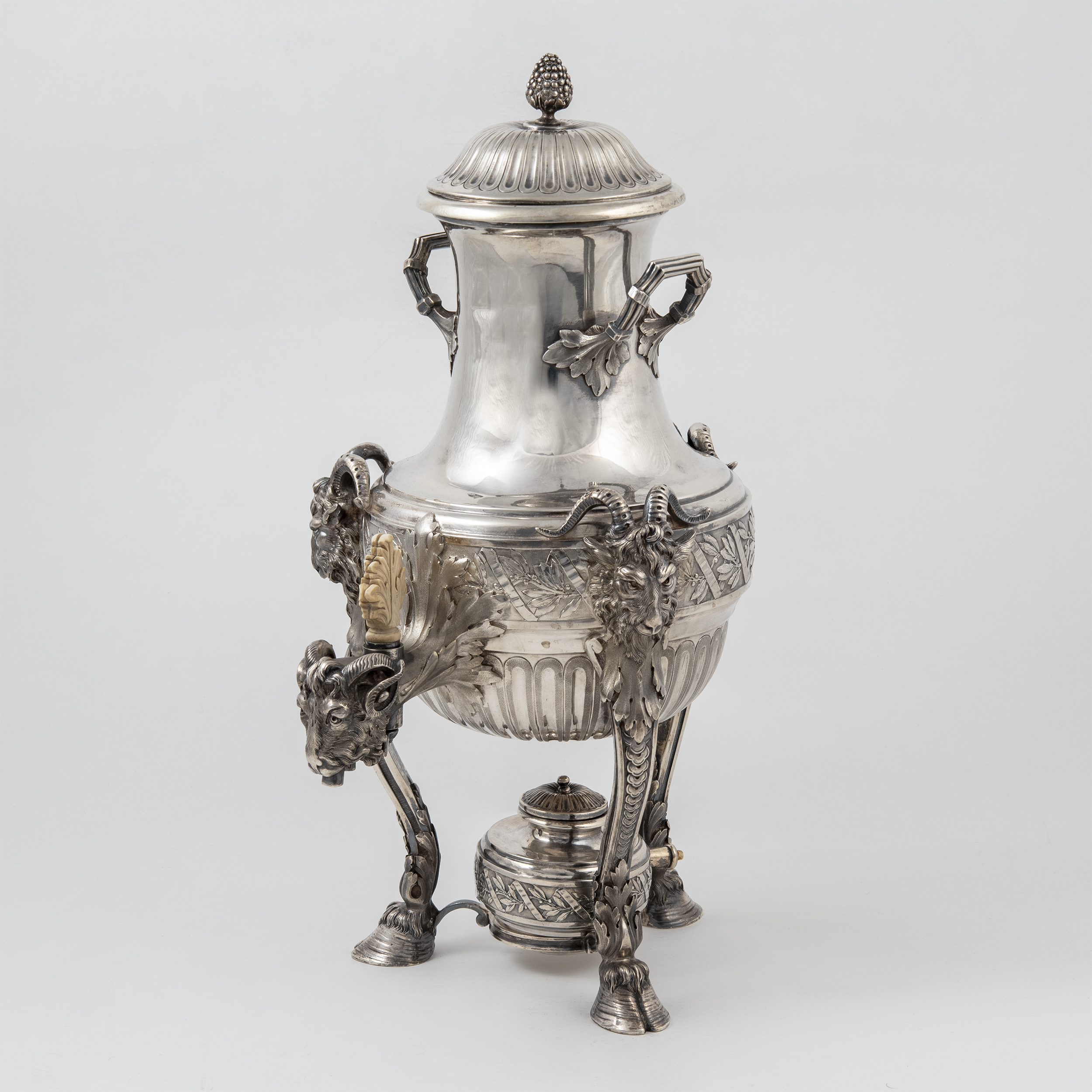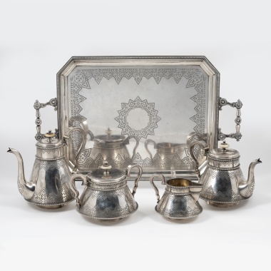 Чайник, молочник, сахарница с крышкой, бульотка со спиртовкой, украшенные лавровыми гирляндами и лентами; прямоугольный поднос с ручками, декорированными маскаронами «голова барана»;