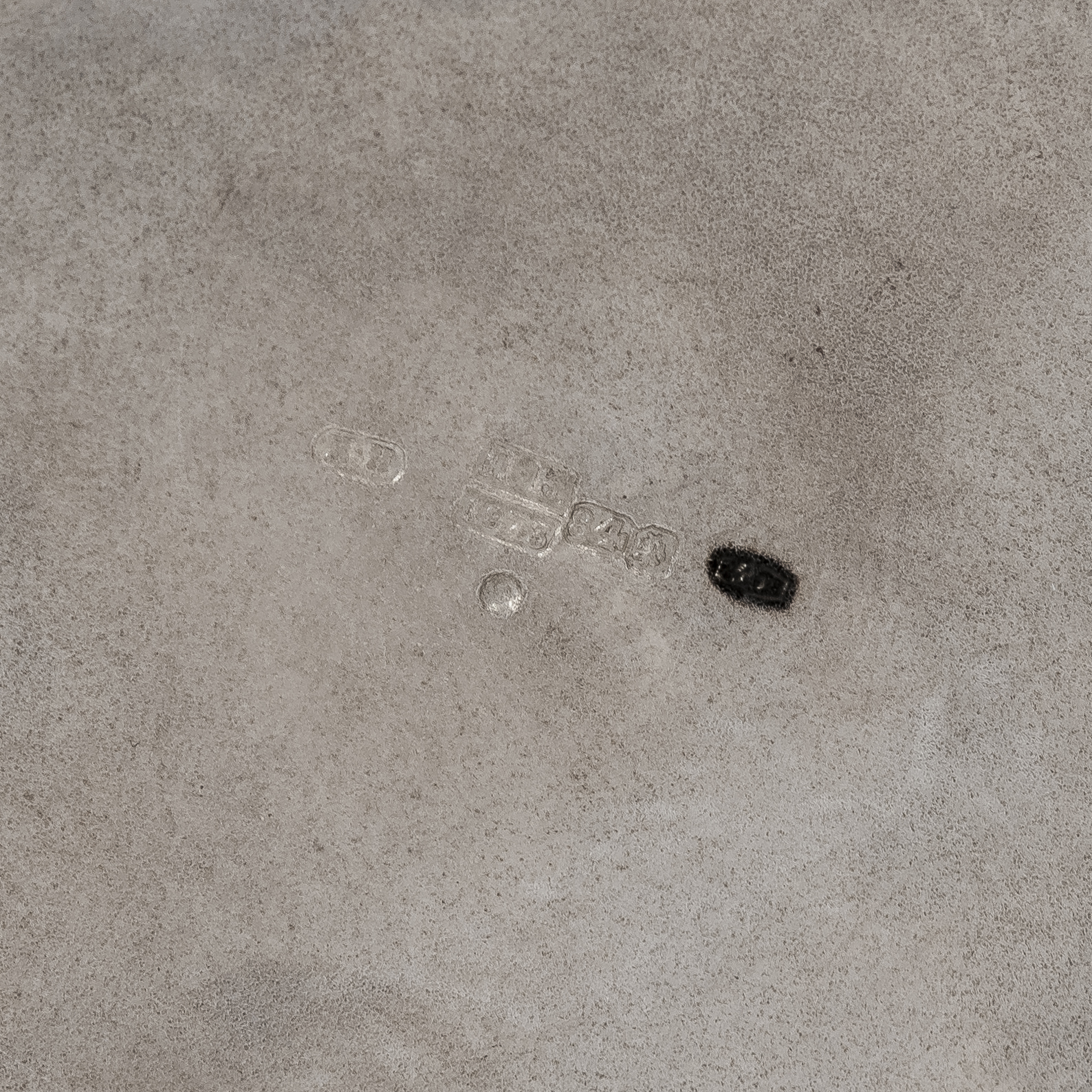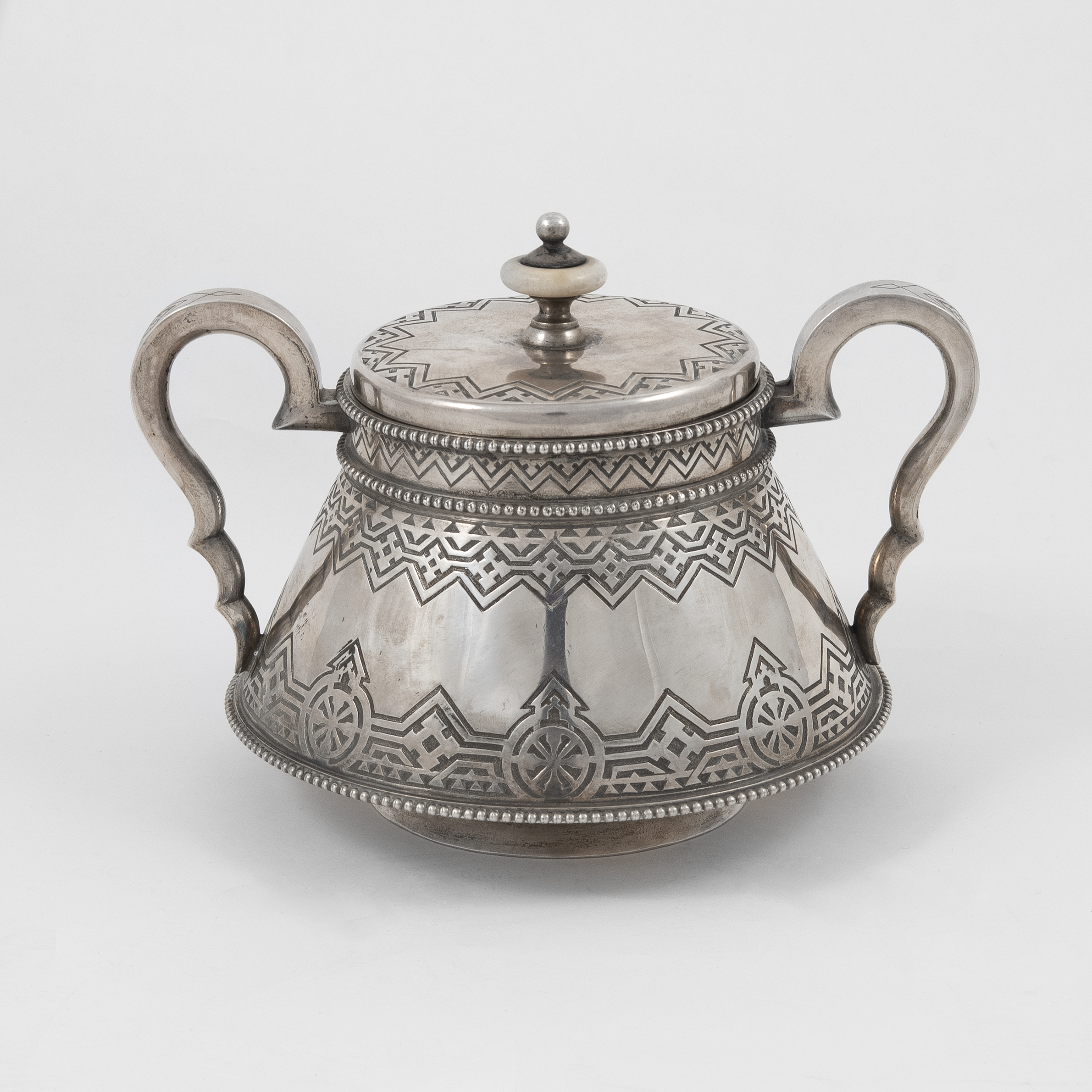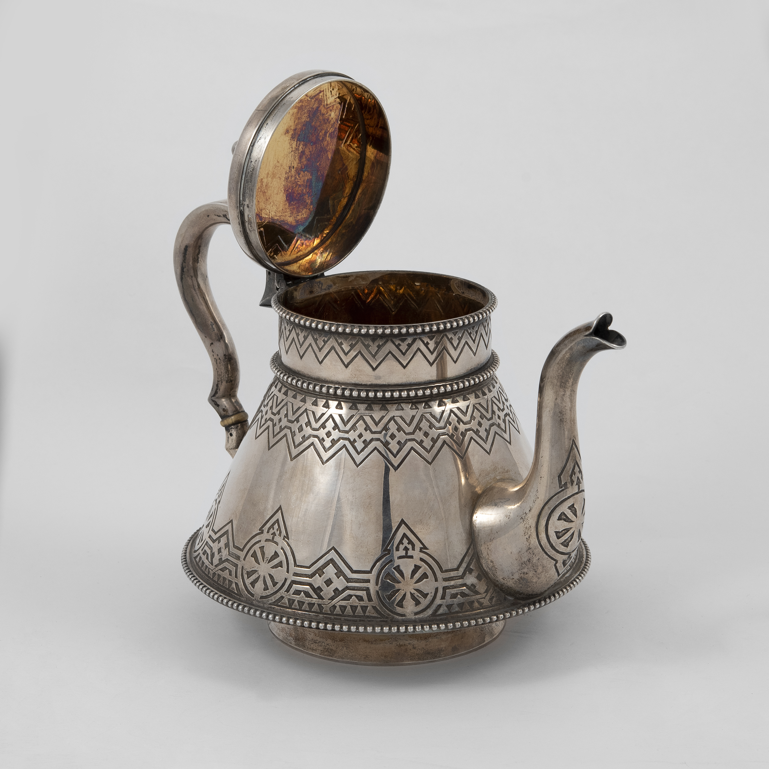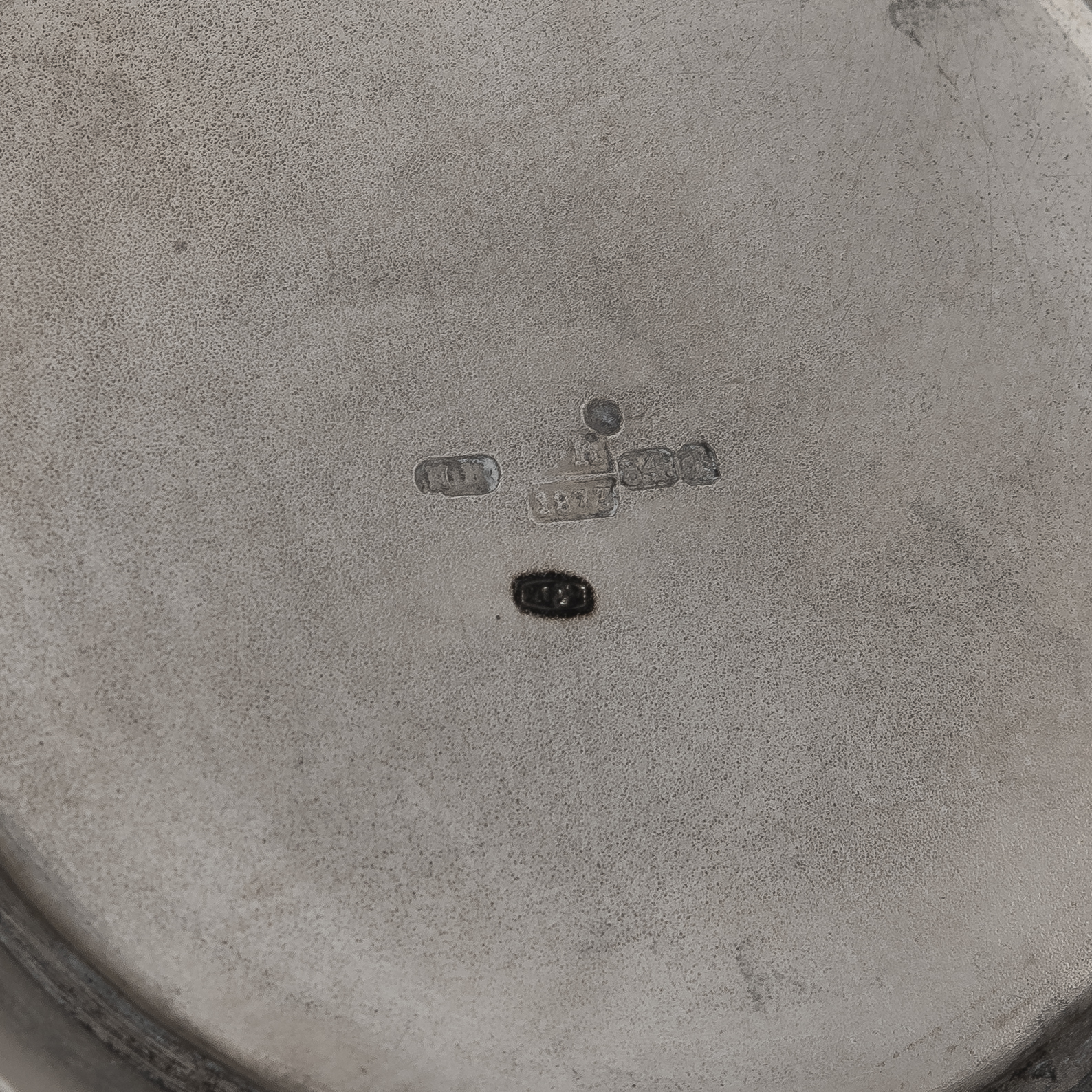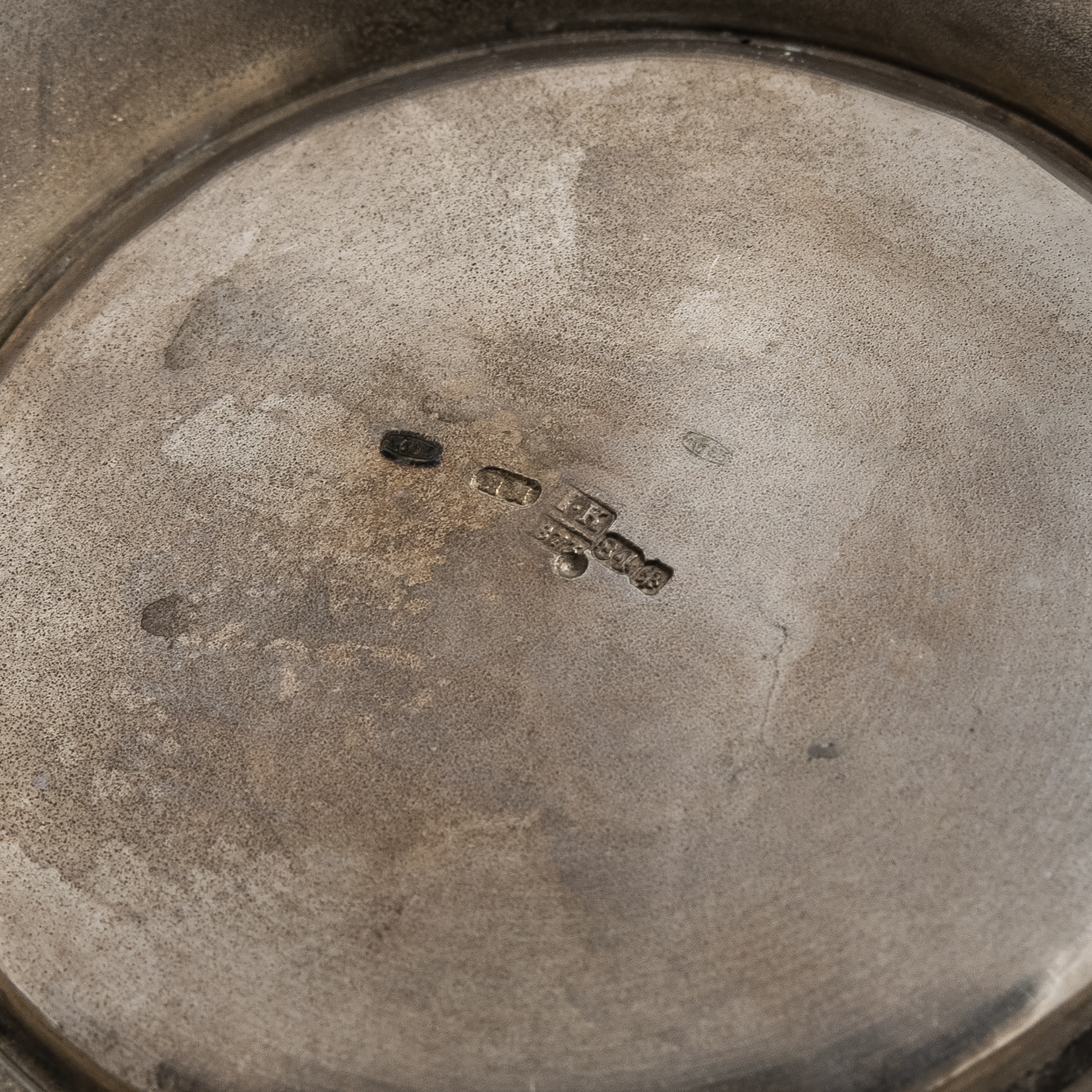 Клейма: 84 пробы, герб города Санкт-Петербурга «Два якоря и скипетр»; инициалы пробирного мастера «П.К» над датой «1873»; именник мастера «Н.Н» Николая Никитина; клейма на подносе: 84 проба, «Два якоря и скипетр» в щитке, инициалы пробирного мастера «И.Е» над датой 1874, клеймо «J.H» петербургского мастера серебряного дела Иогана Хейнойна (Johann Heinoin). Российская империя.
