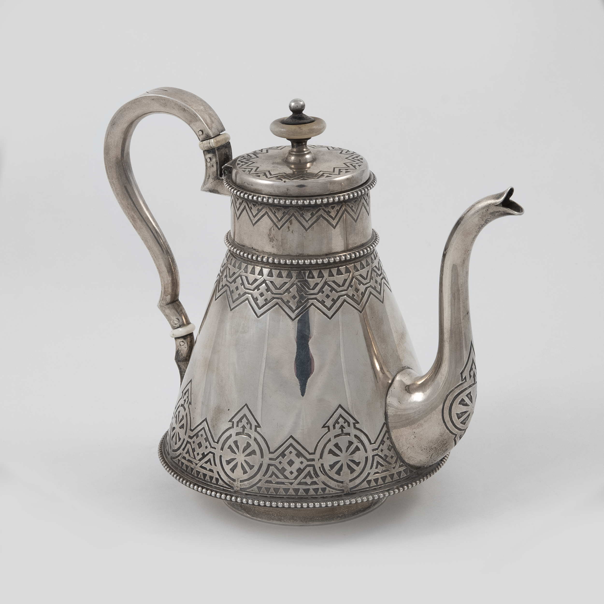 Чайник, кофейник, сахарница, сливочник и поднос.
