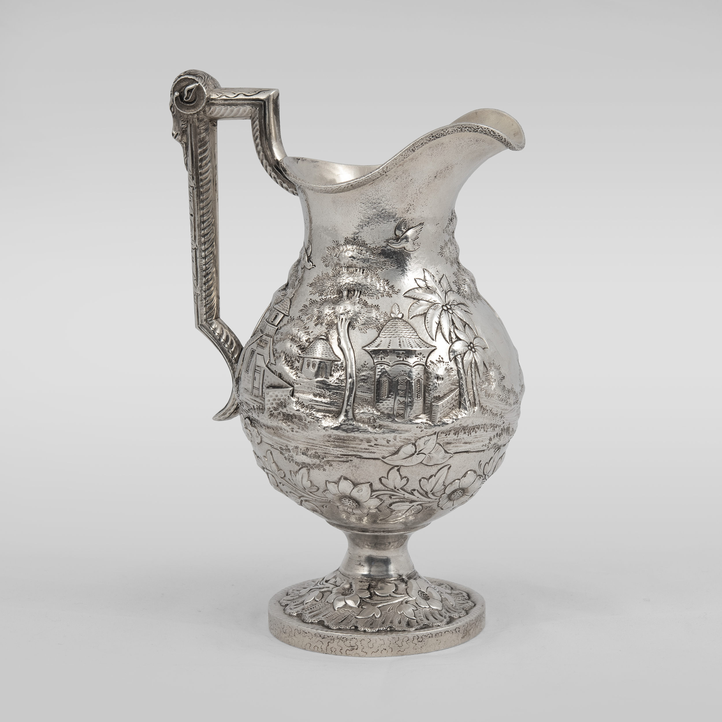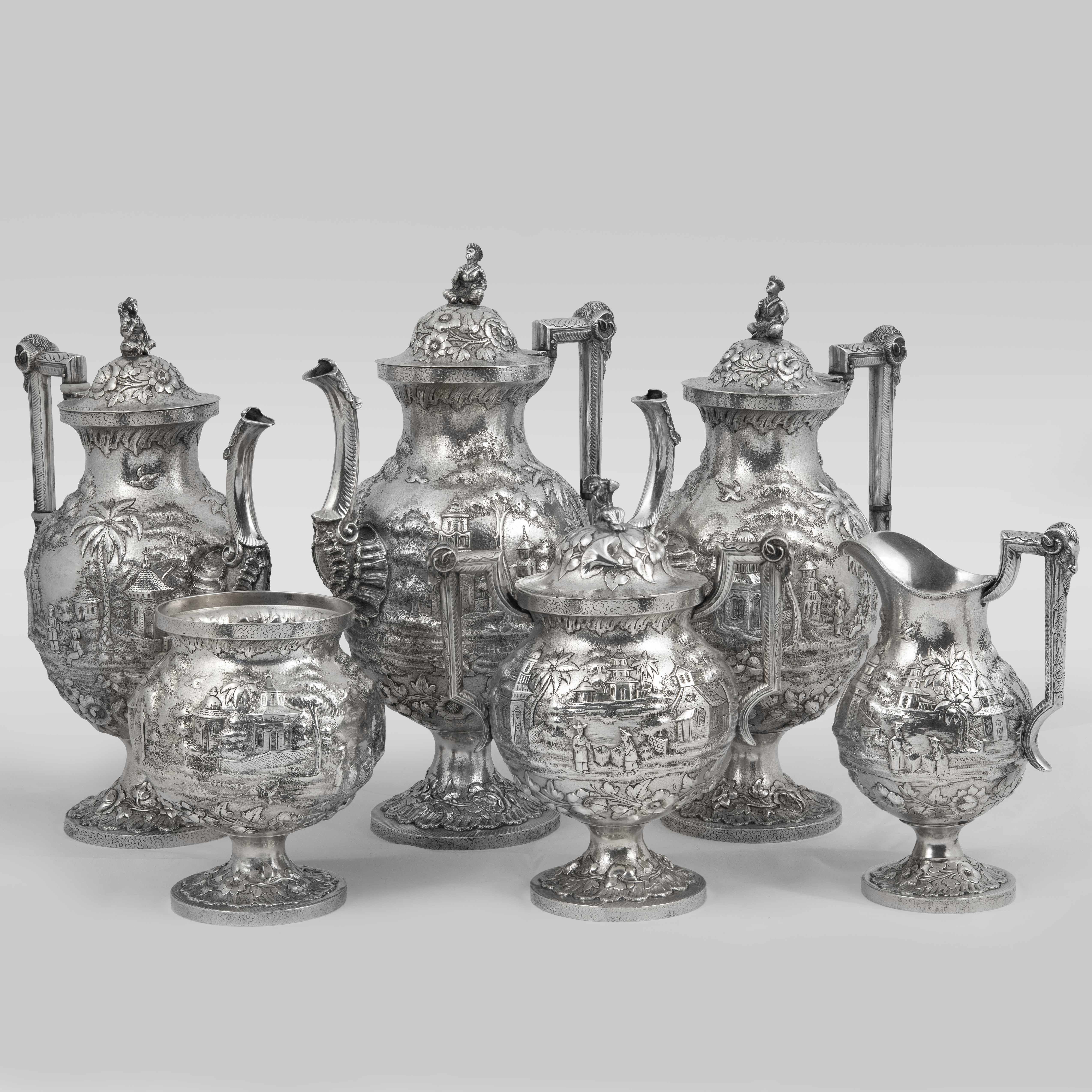 Украшен экзотическими пейзажами в высоком рельефе, а также фигурками в национальных китайских костюмах на крышках;