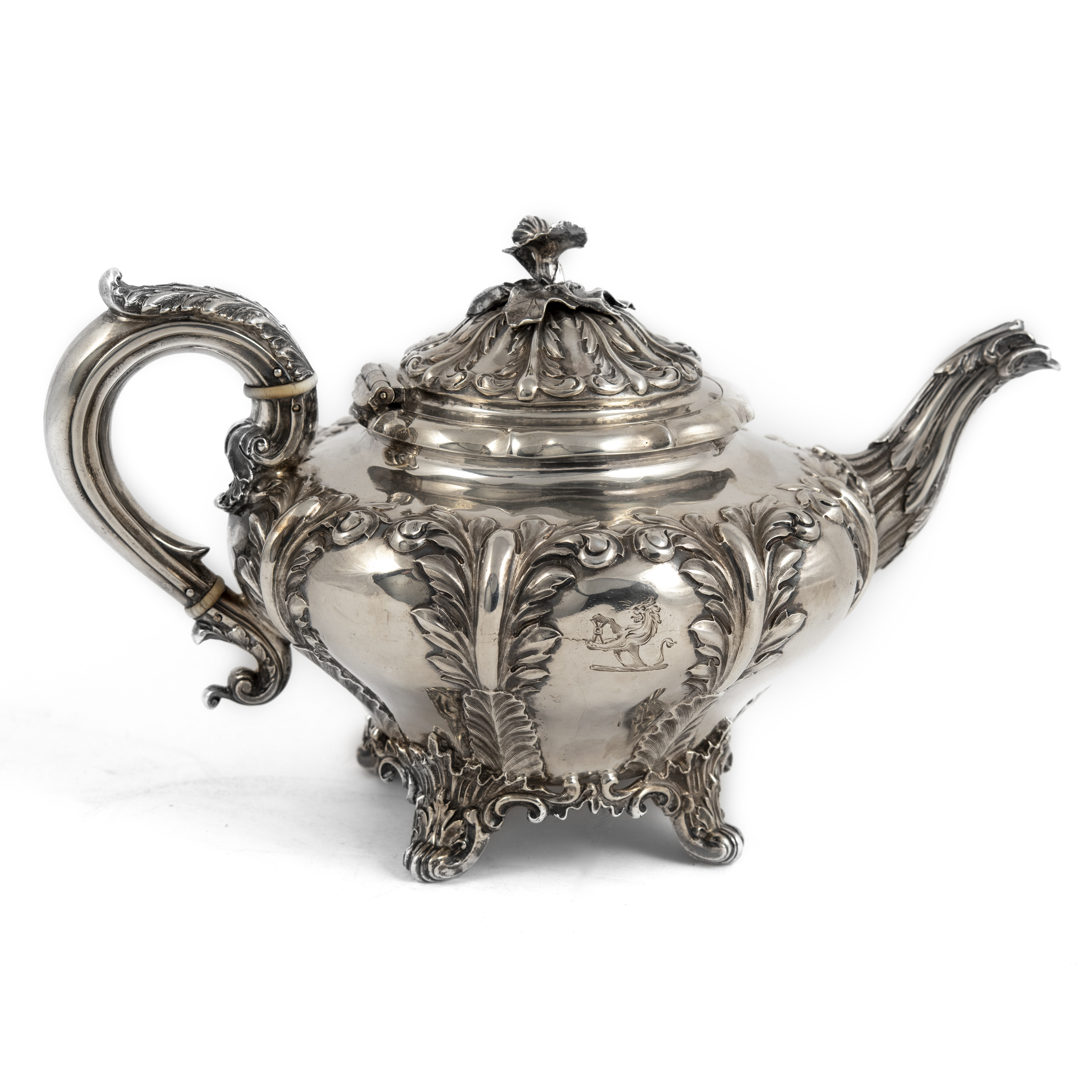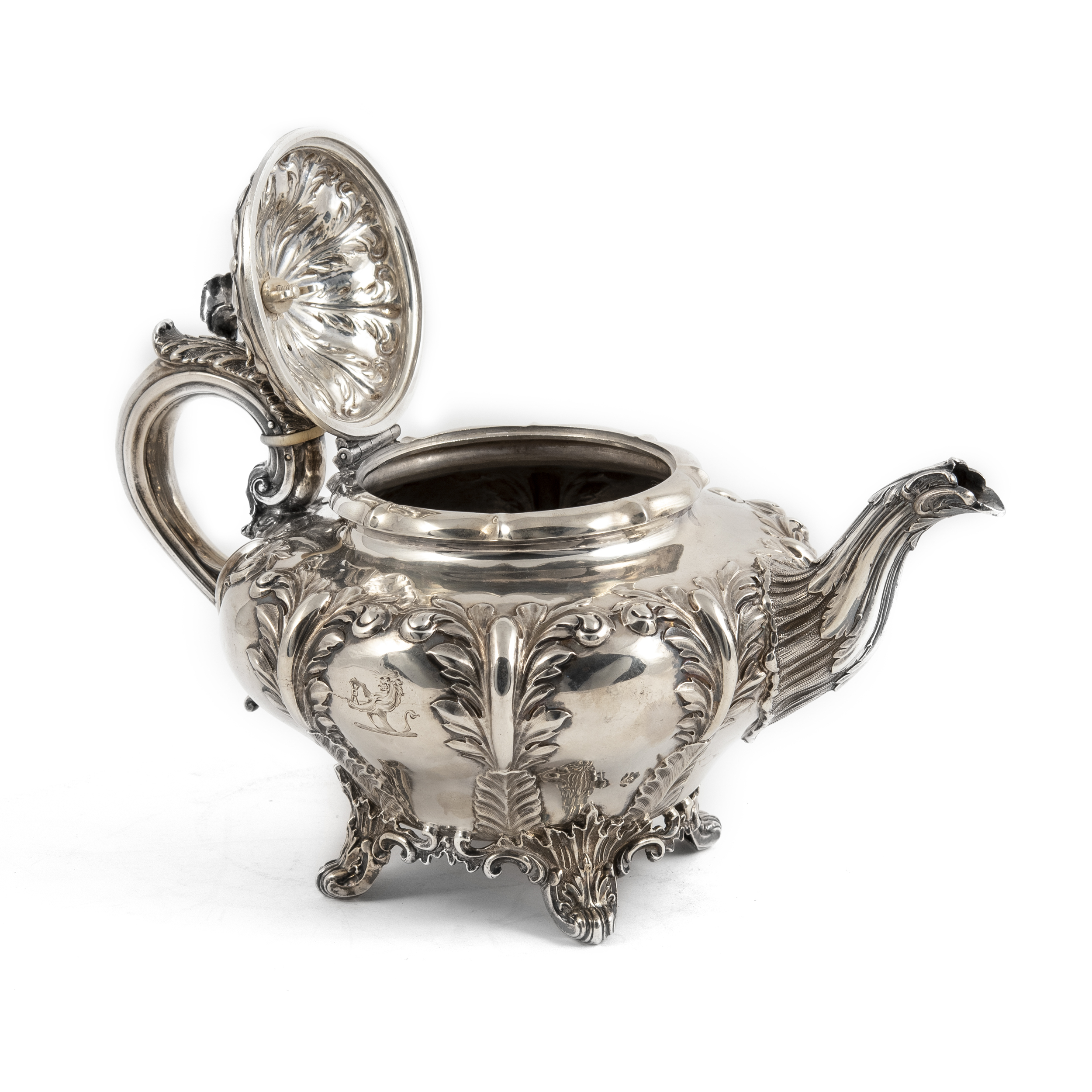 Клейма: проба 925, пробирные клейма Англии: в щитке «лев, идущий с поднятой правой передней лапой», голова леопарда - городское клеймо Лондона; буква «А» в фигурном щитке - дата; голова Королевы Виктории - знак уплаты госпошлины; мастерской «IW WM» в фигурном щитке, фирма «Wrangham & Moulson»; на тулове чайника владельческий герб в виде льва;