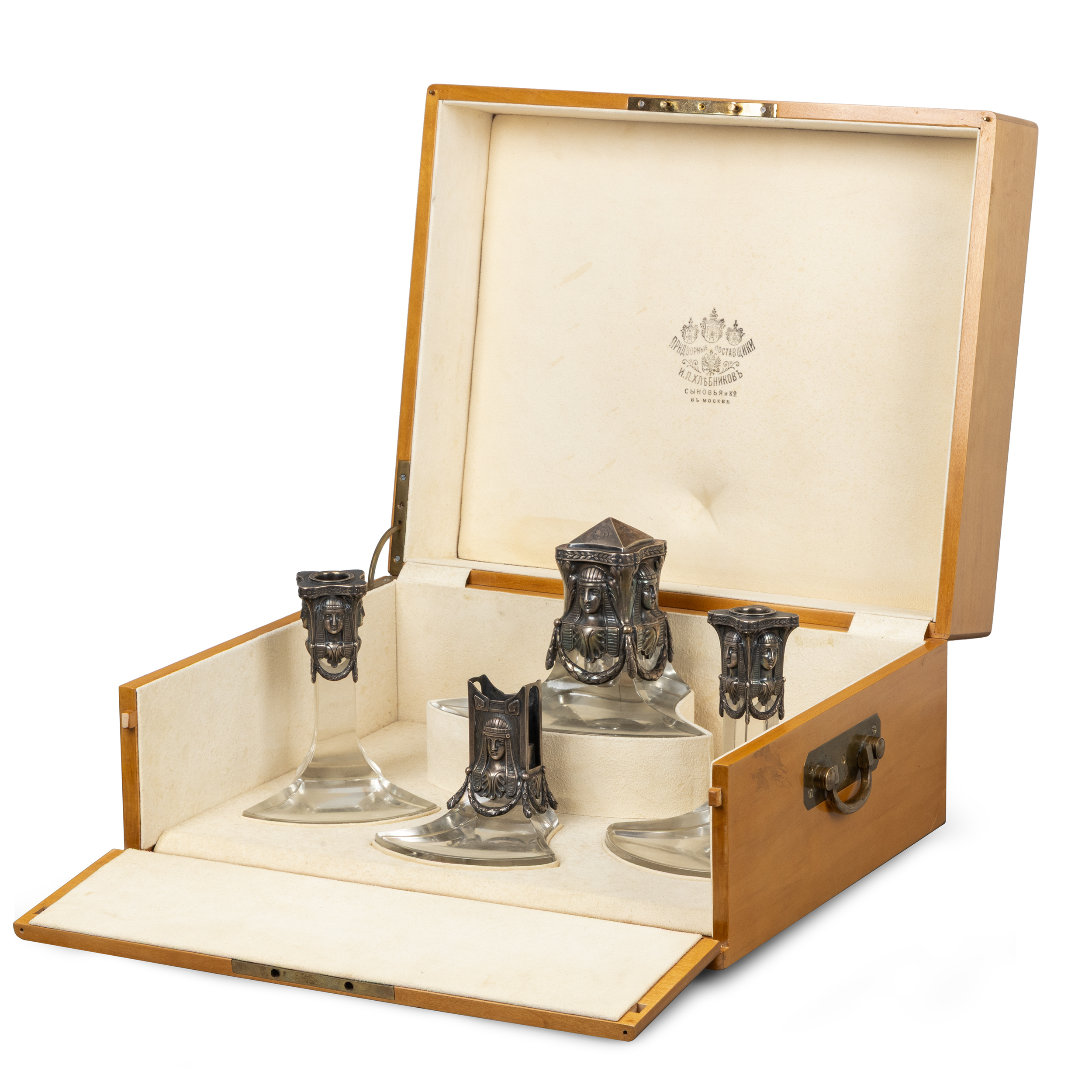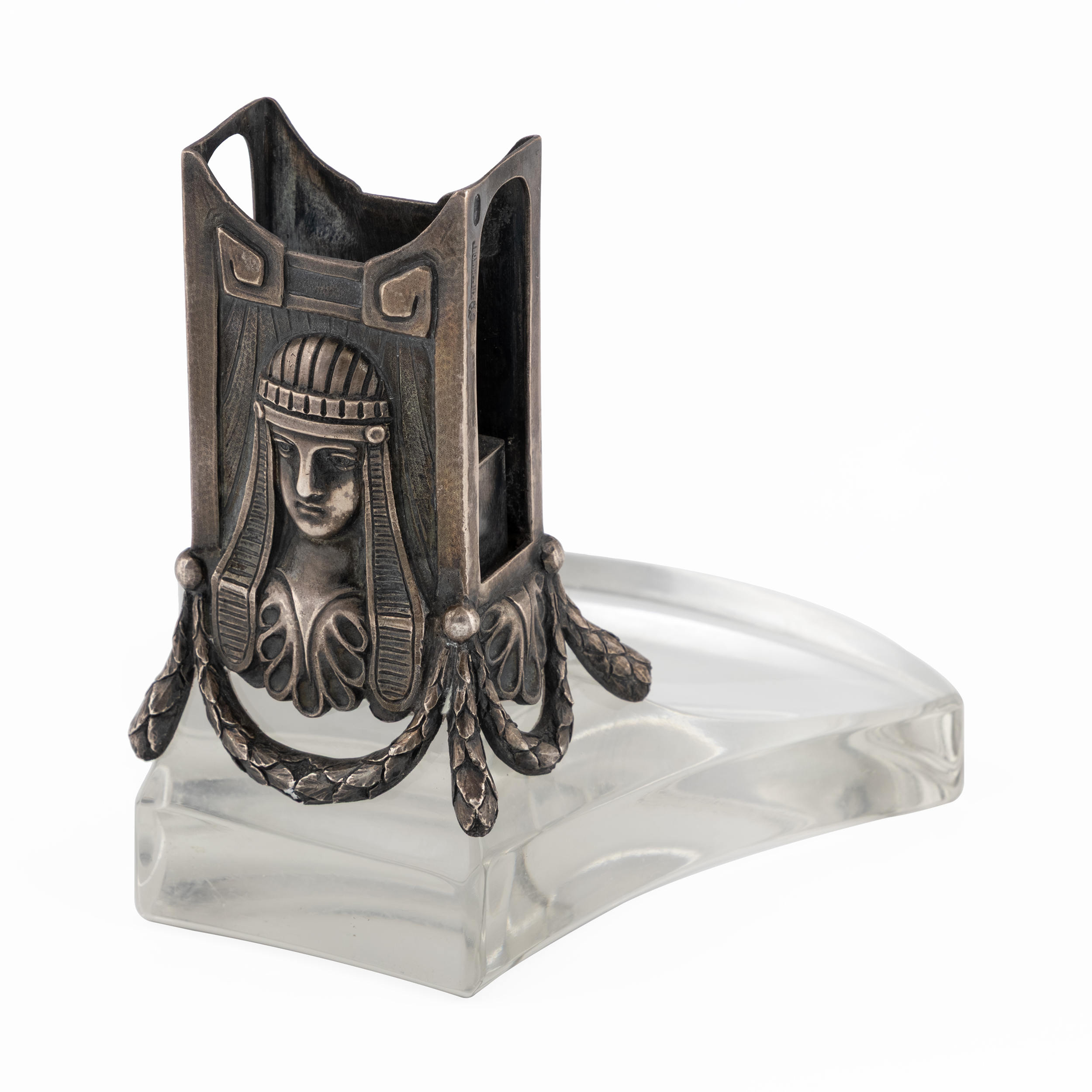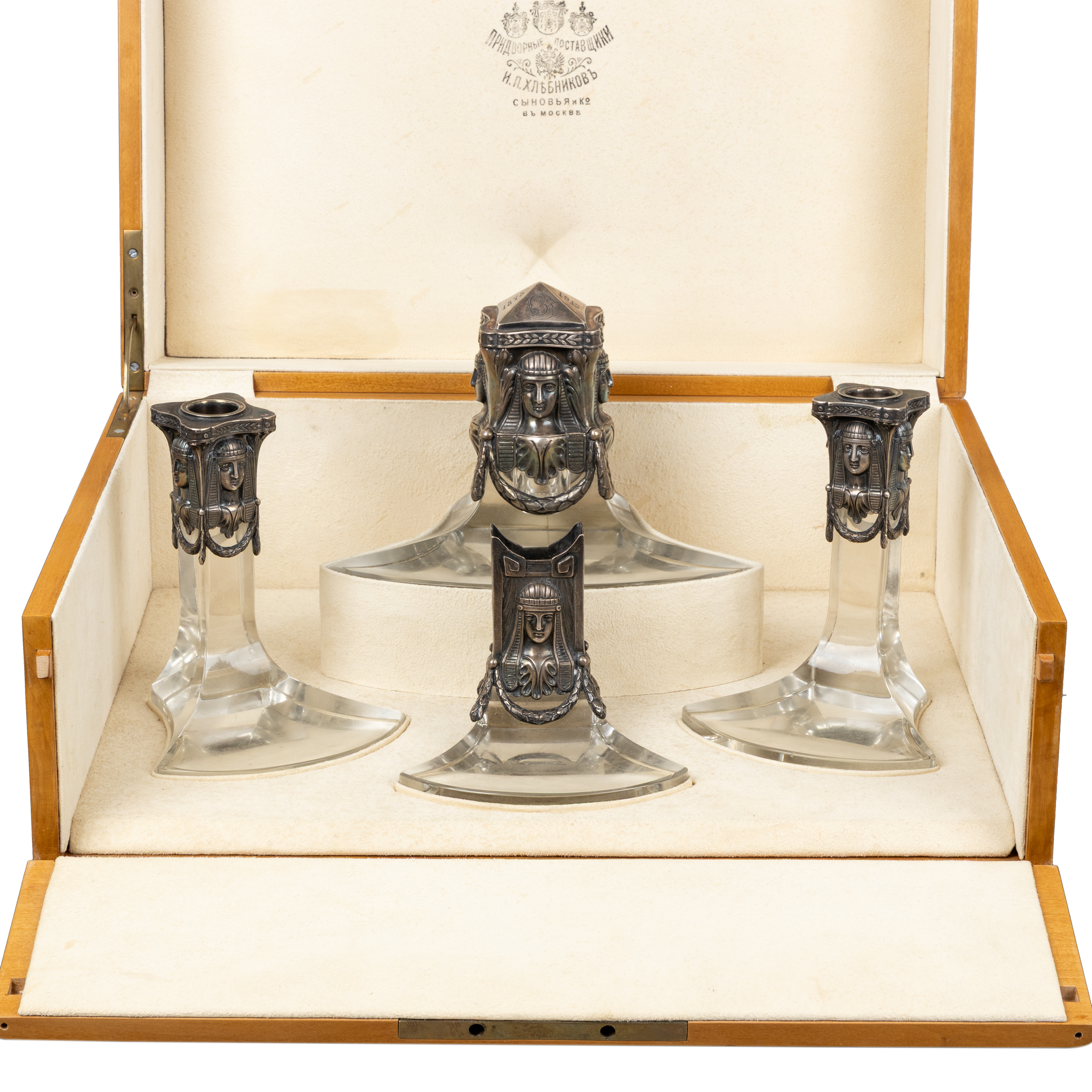 Серебряный настольный чернильный прибор в египетском стиле, состоит из 4х предметов: чернильницы, двух подсвечников и спичечницы.