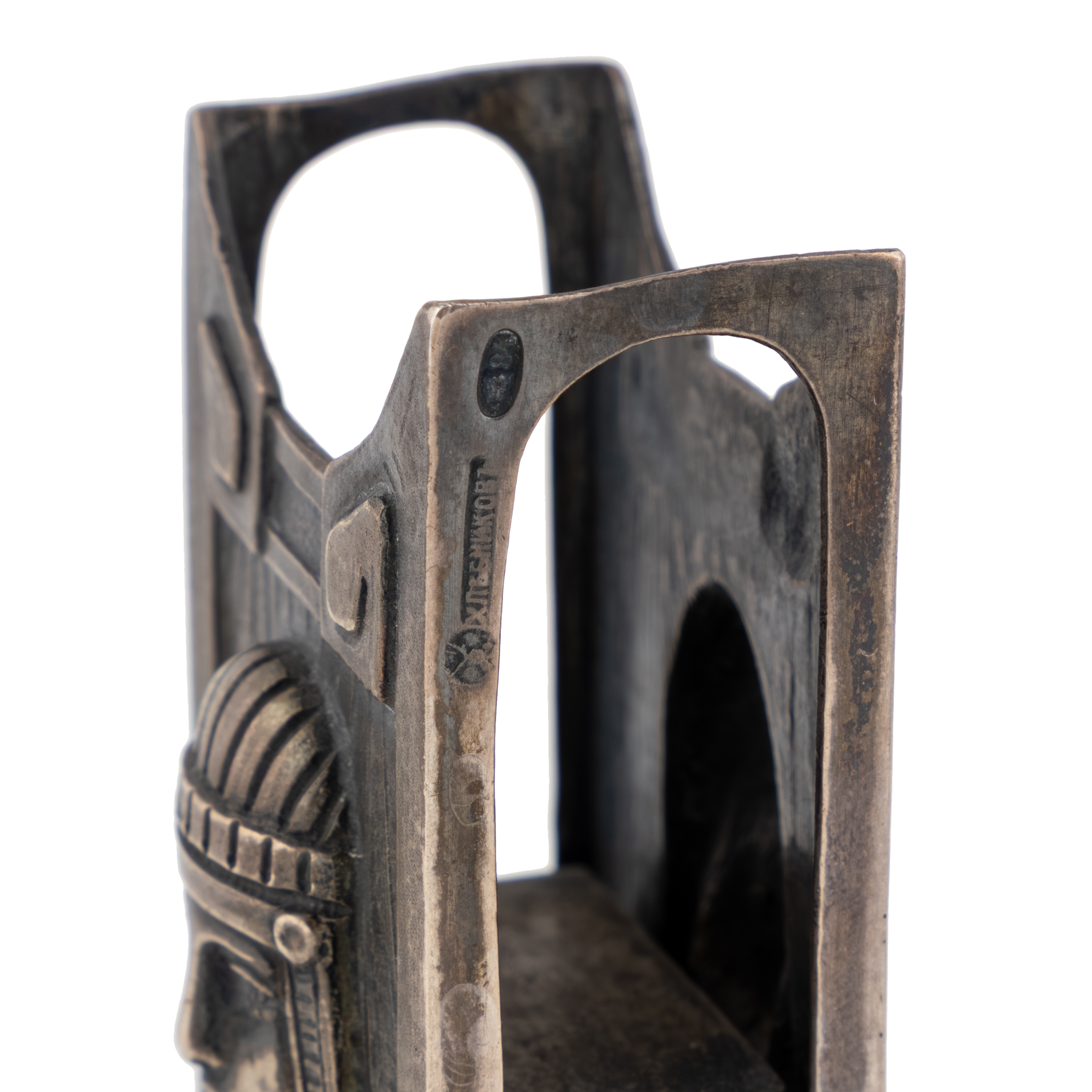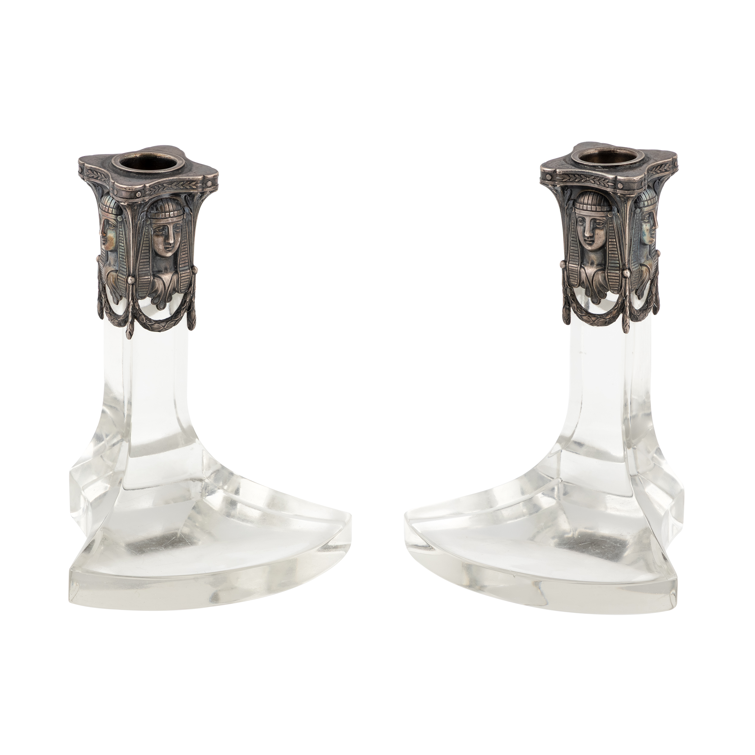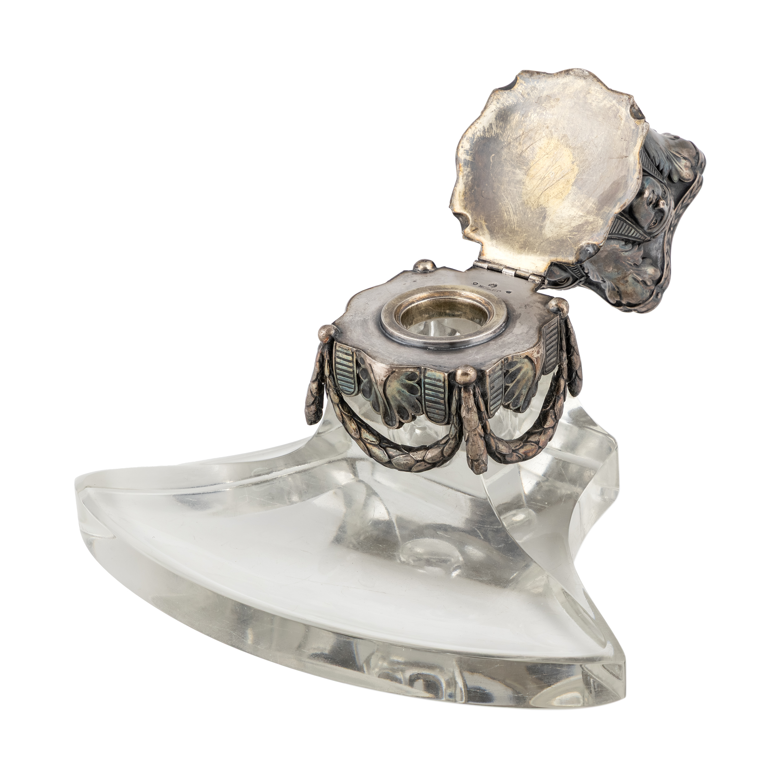 Серебряный настольный чернильный прибор в египетском стиле, состоит из 4х предметов: чернильницы, двух подсвечников и спичечницы.