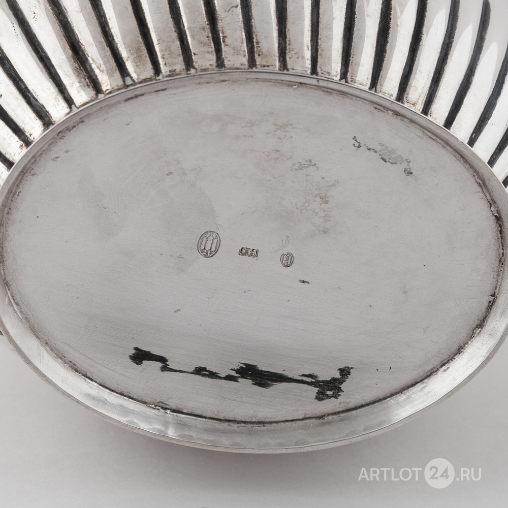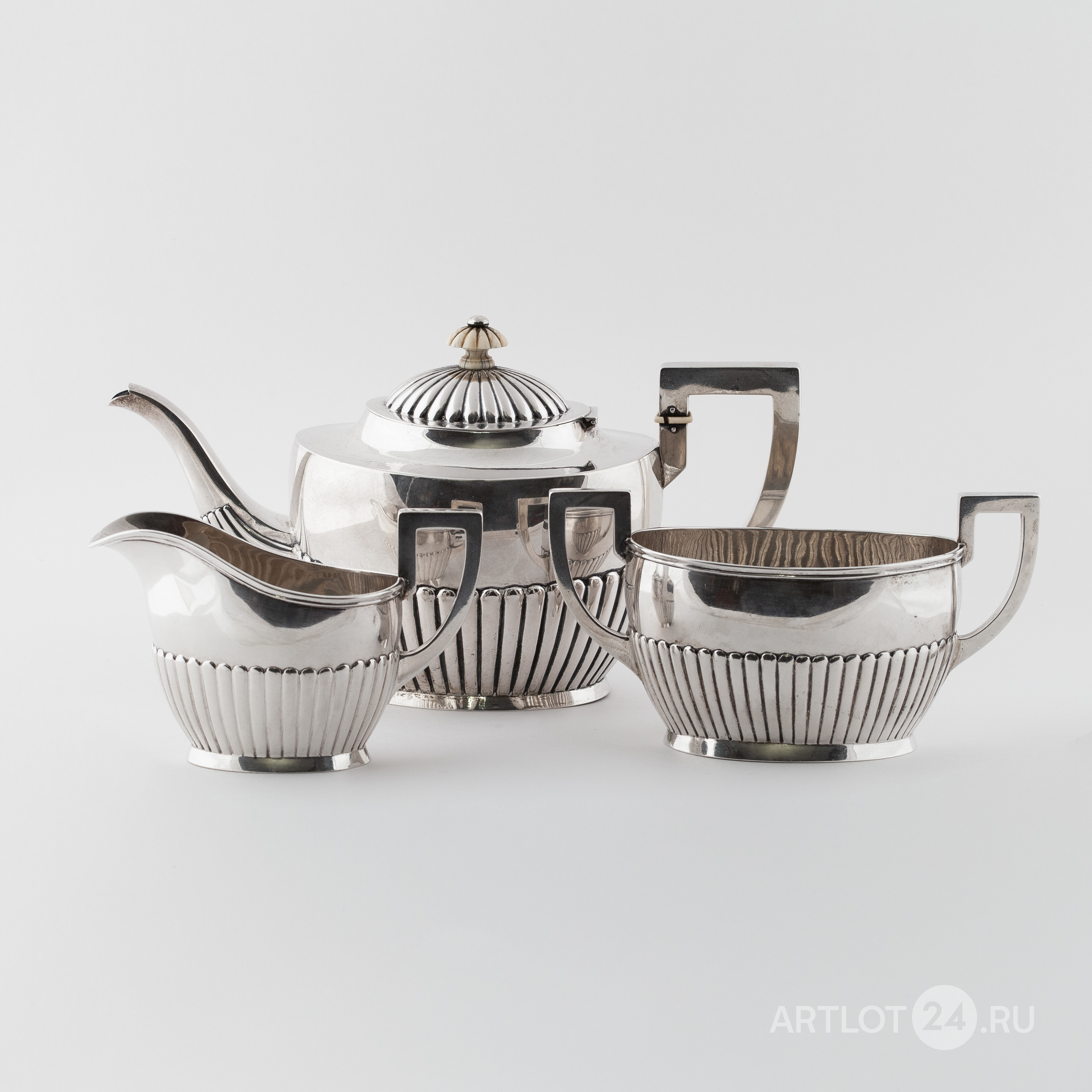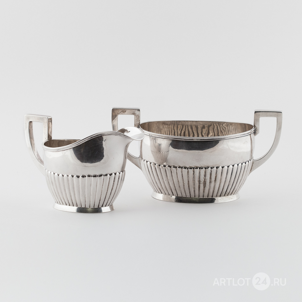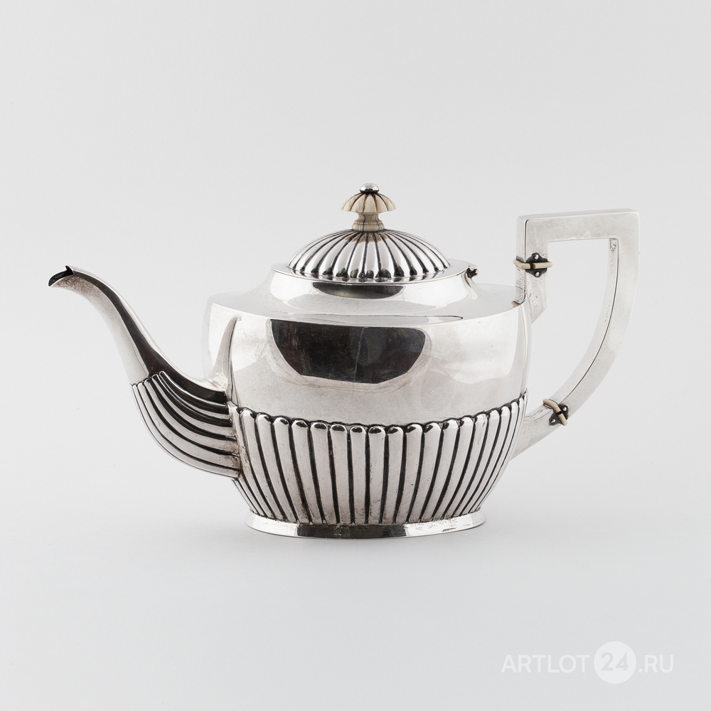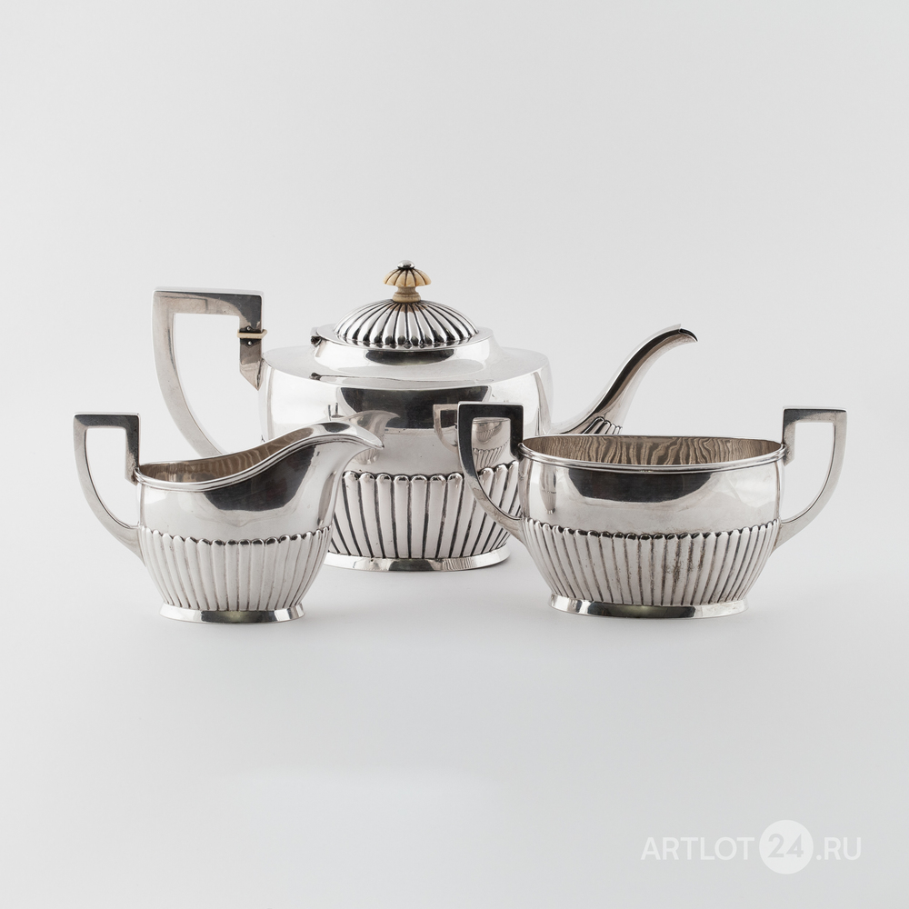 Чайник, сахарница и сливочник. Серебро, литье, шлифовка, монтировка, клейма: «Три башни» - городское клеймо Копенгагена, «CHF» - клеймо начальника пробирной палаты Кристиана Ф. Хейса (Christian F. Heise, 1904-1932)